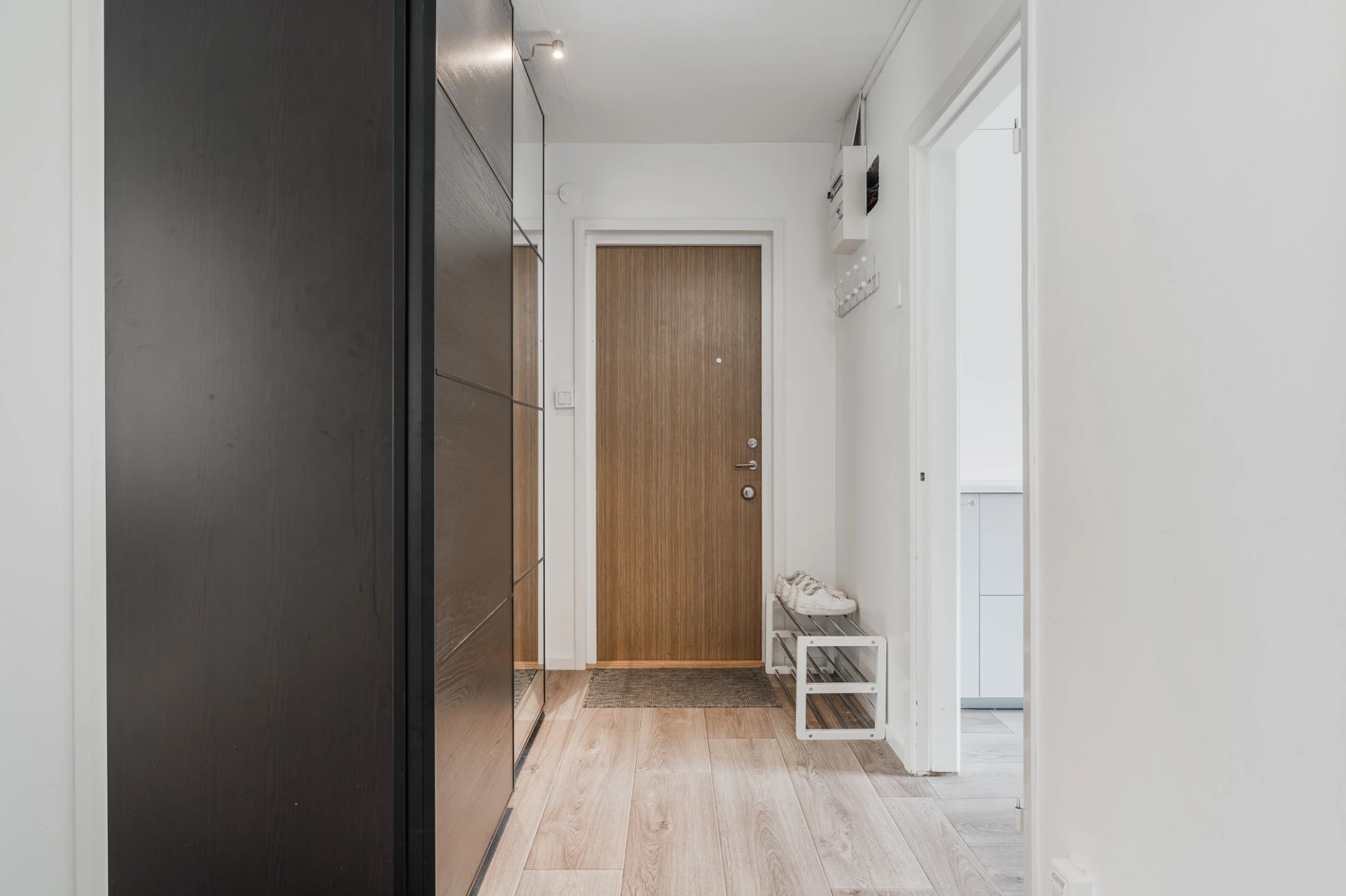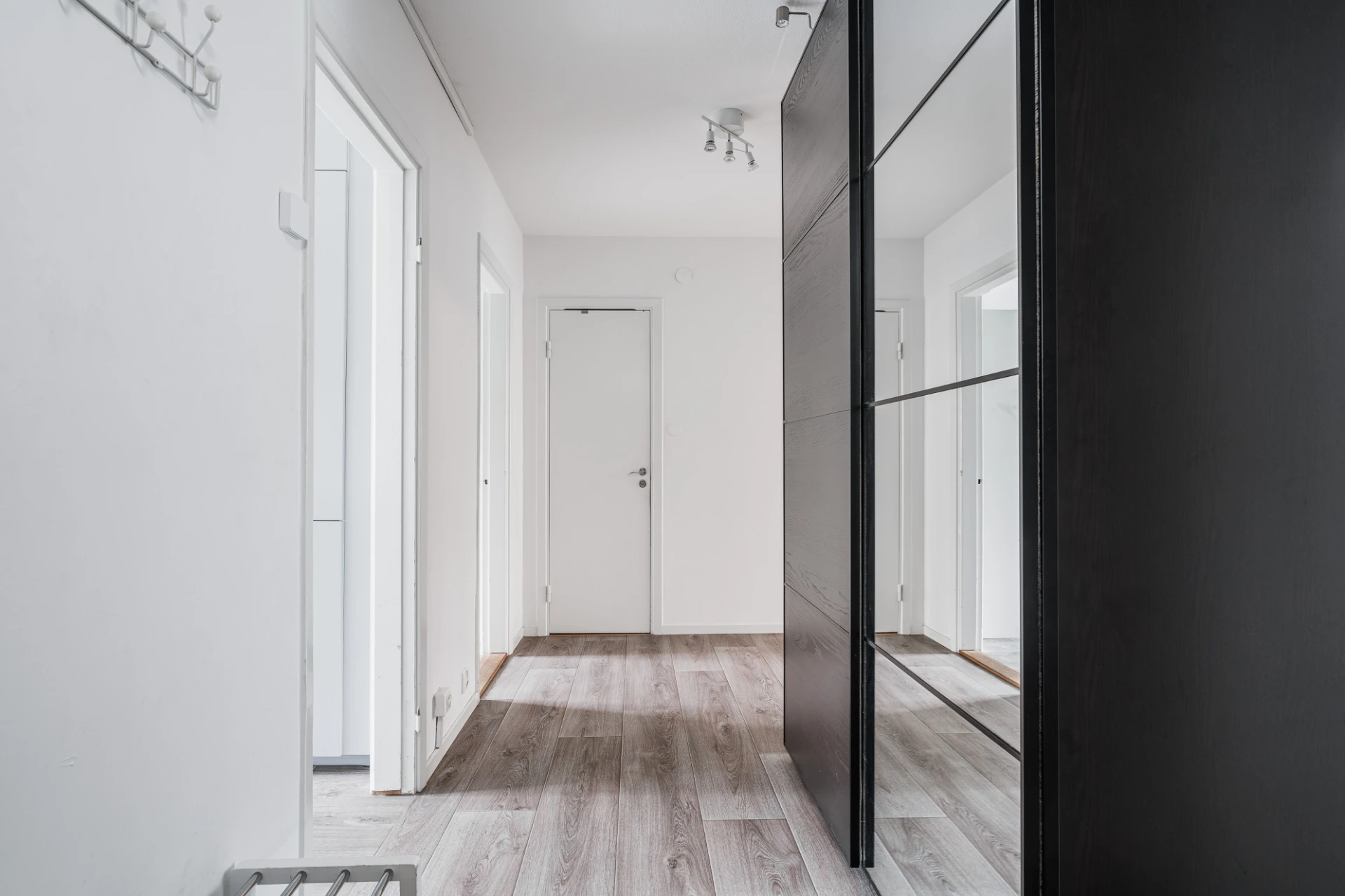 Rymlig hall med goda förvaringsmöjligheter. Stora garderober med skjutdörrar. Golv och väggar i ljusa toner.