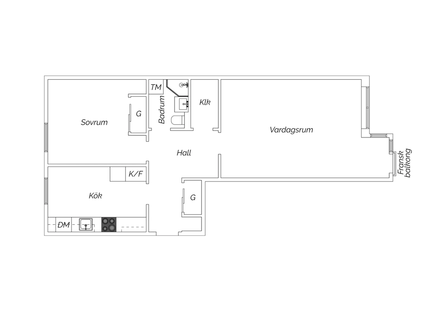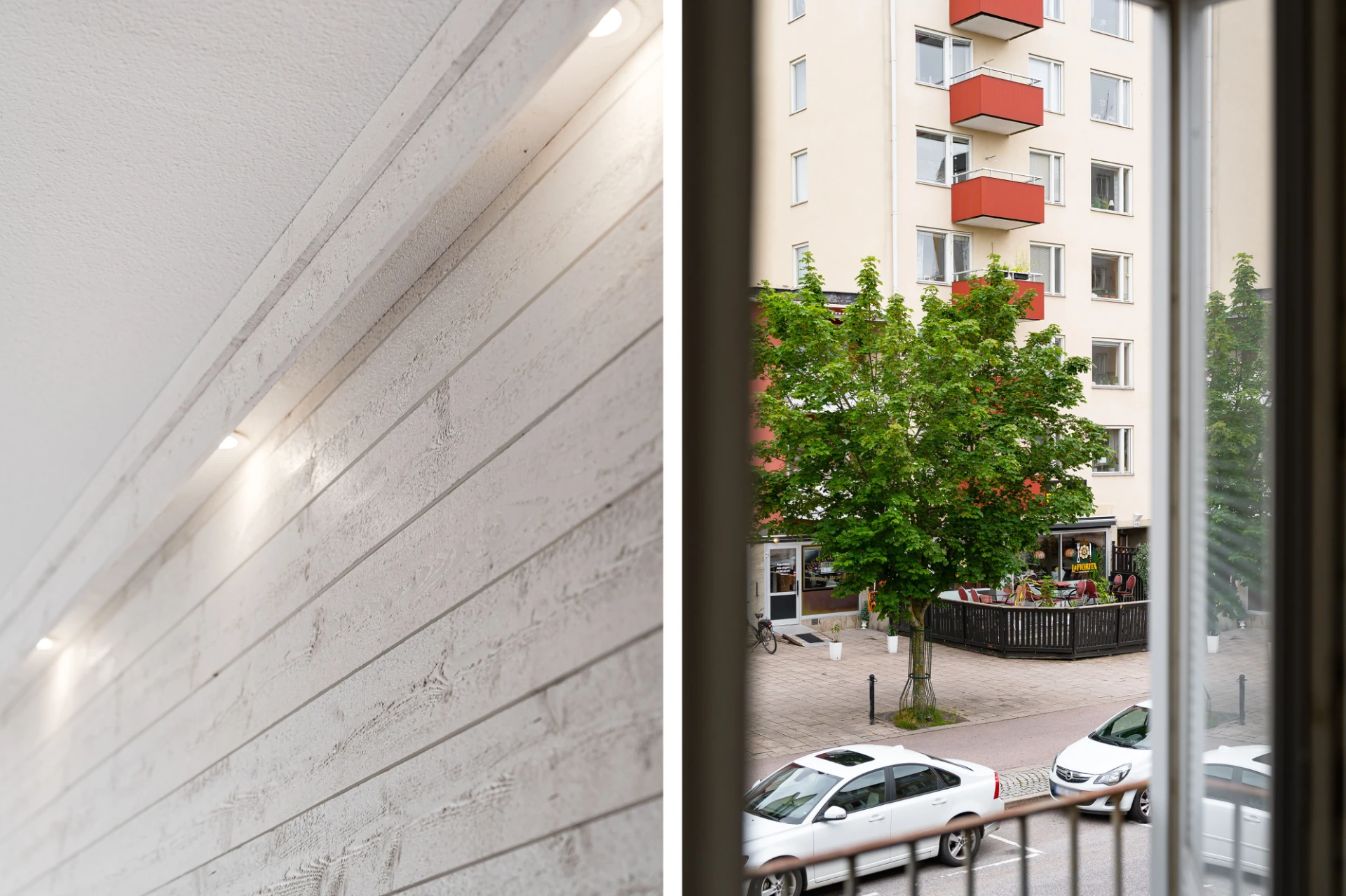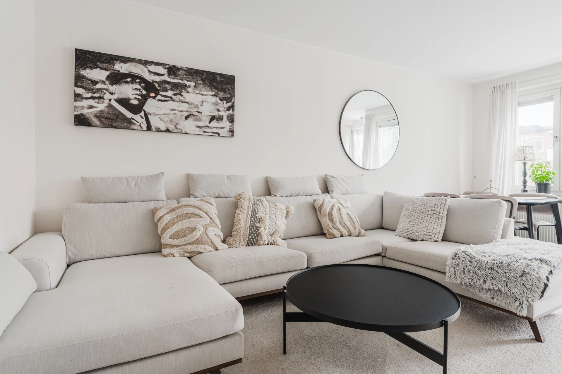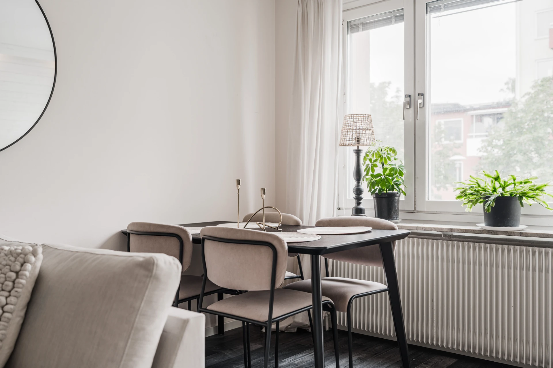 Bostadens hjärta är det generösa vardagsrummet, som med sin charmiga trävägg, stora fönster och franska balkong bjuder på ett fantastiskt ljusflöde och en känsla av rymd. Här ryms både mysiga soffhörnor och middagar i goda vänners lag, ett rum att trivas i året om.