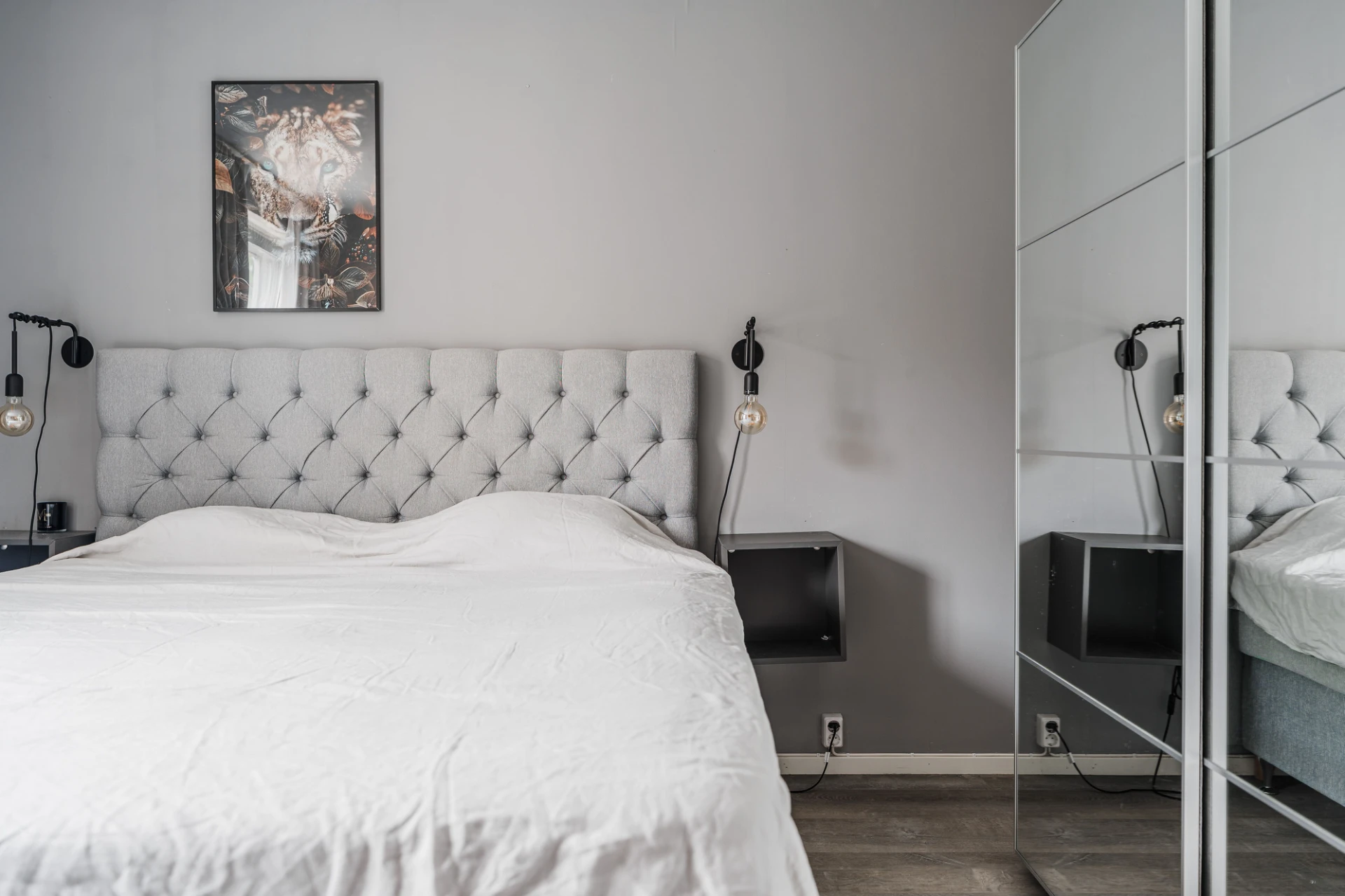Sovrummet är lugnt och ombonat, perfekt för återhämtning. Nymålat 2023 i en behaglig ljusgrå ton och med plats för dubbelsäng och tillhörande möbler, kompletteras det av en stor garderob och ett stort fönster som förhöjer den harmoniska känslan. Badrummet är helkaklat och inrett med duschkabin, vägghängd spegel, tvättställ med kommod, handdukstork samt en praktisk tvättmaskin. Ett genomtänkt rum där både komfort och funktion möts. Hallen välkomnar dig med ljusa ytskikt och generösa förvaringslösningar i form av stora garderober med skjutdörrar – perfekt för att hålla ordning från första steget in.