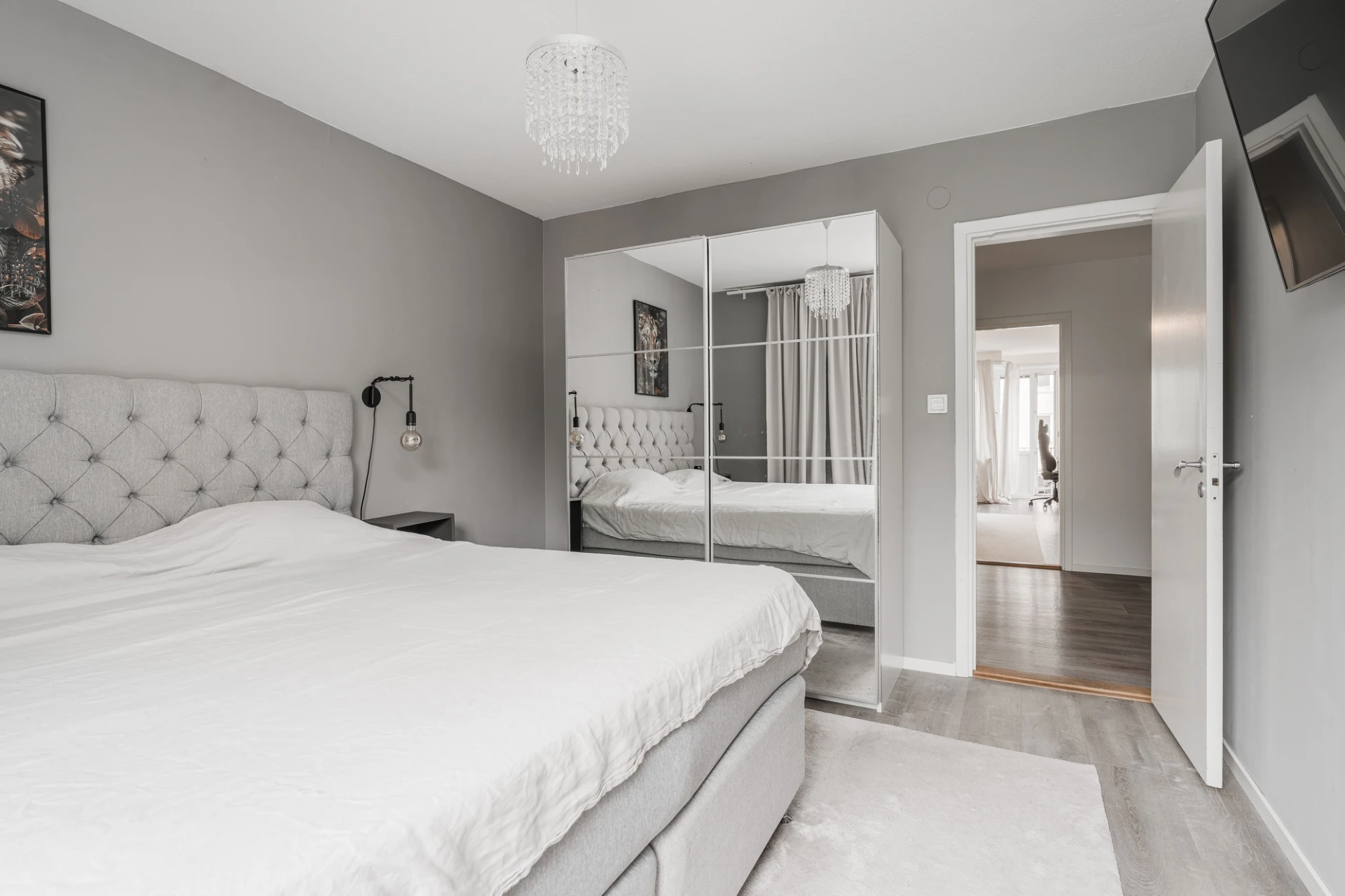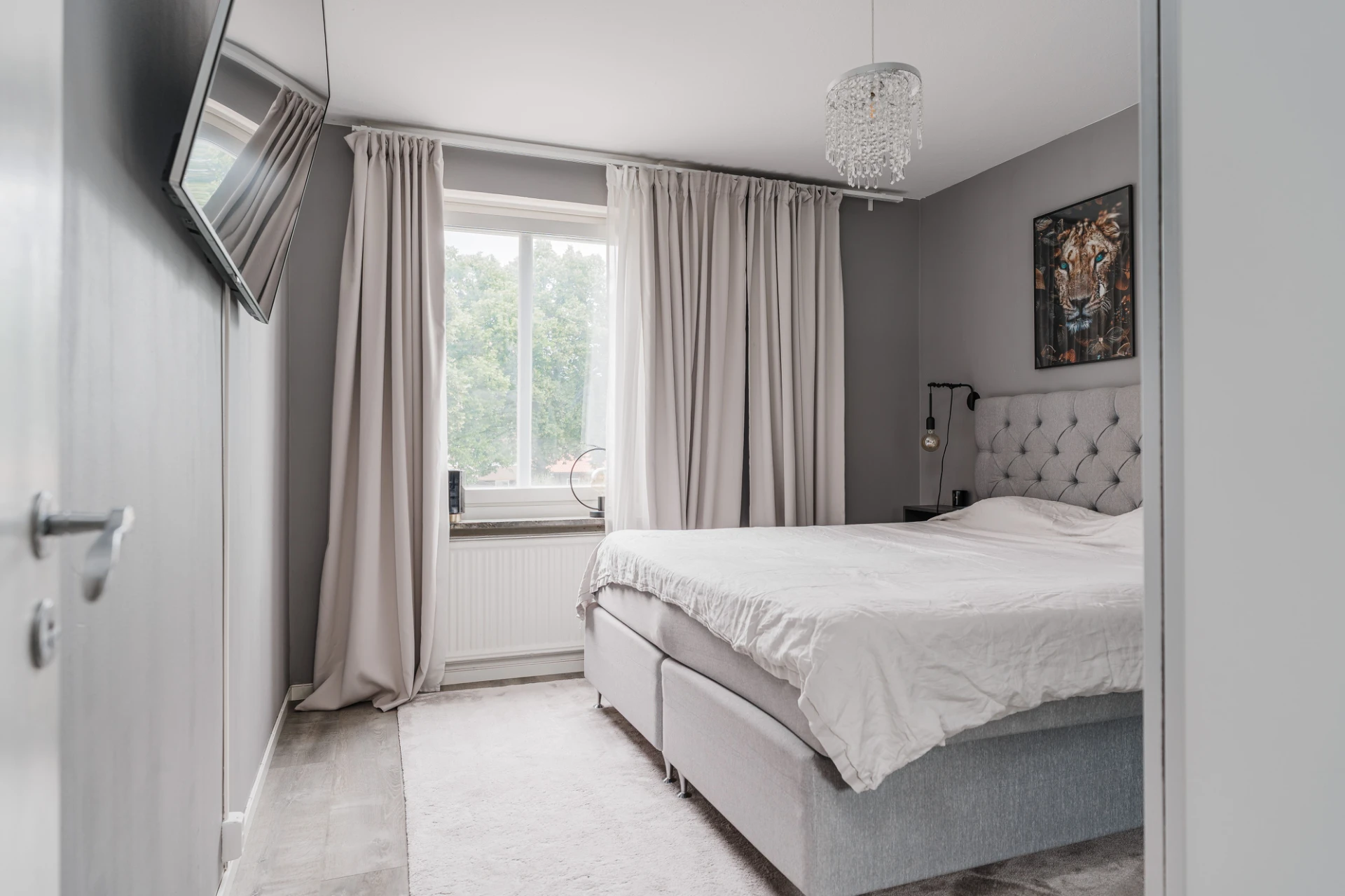 Rymligt sovrum med gott om utrymme för en dubbelsäng med tillhörande möblemang samt stora garderob. Sovrummet är nymålat 2023 med en fin ljusgrå ton. Stort fönster i sovrummet som bidrar med generöst ljusinsläpp