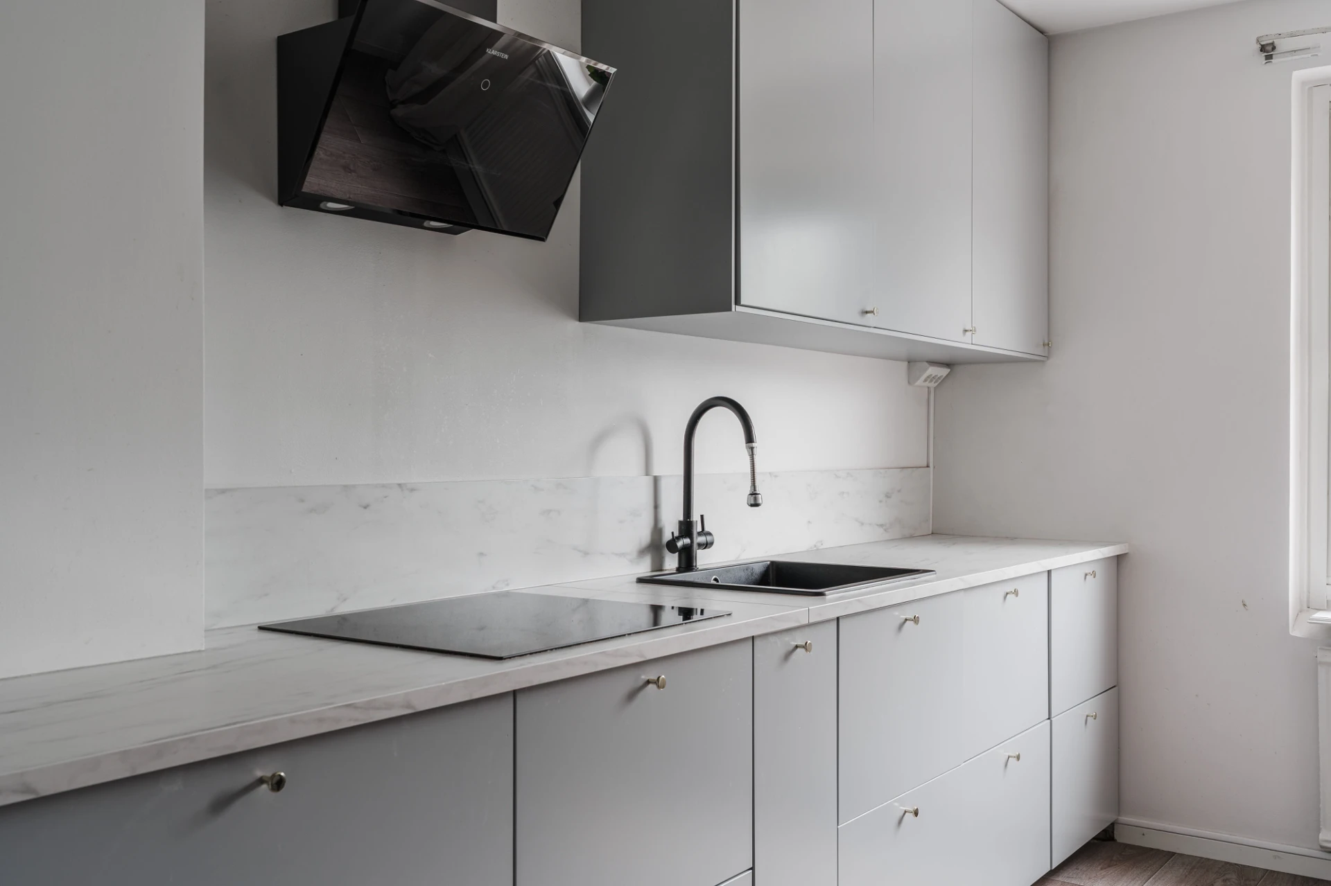 Köket renoverades 2022 och har fått en modern och ljus touch med fina materialval. Här finns gott om förvaring och arbetsyta, vilket gör det lika funktionellt som inbjudande. Det stora fönstret släpper in rikligt med dagsljus och skapar en inspirerande plats att laga mat i.