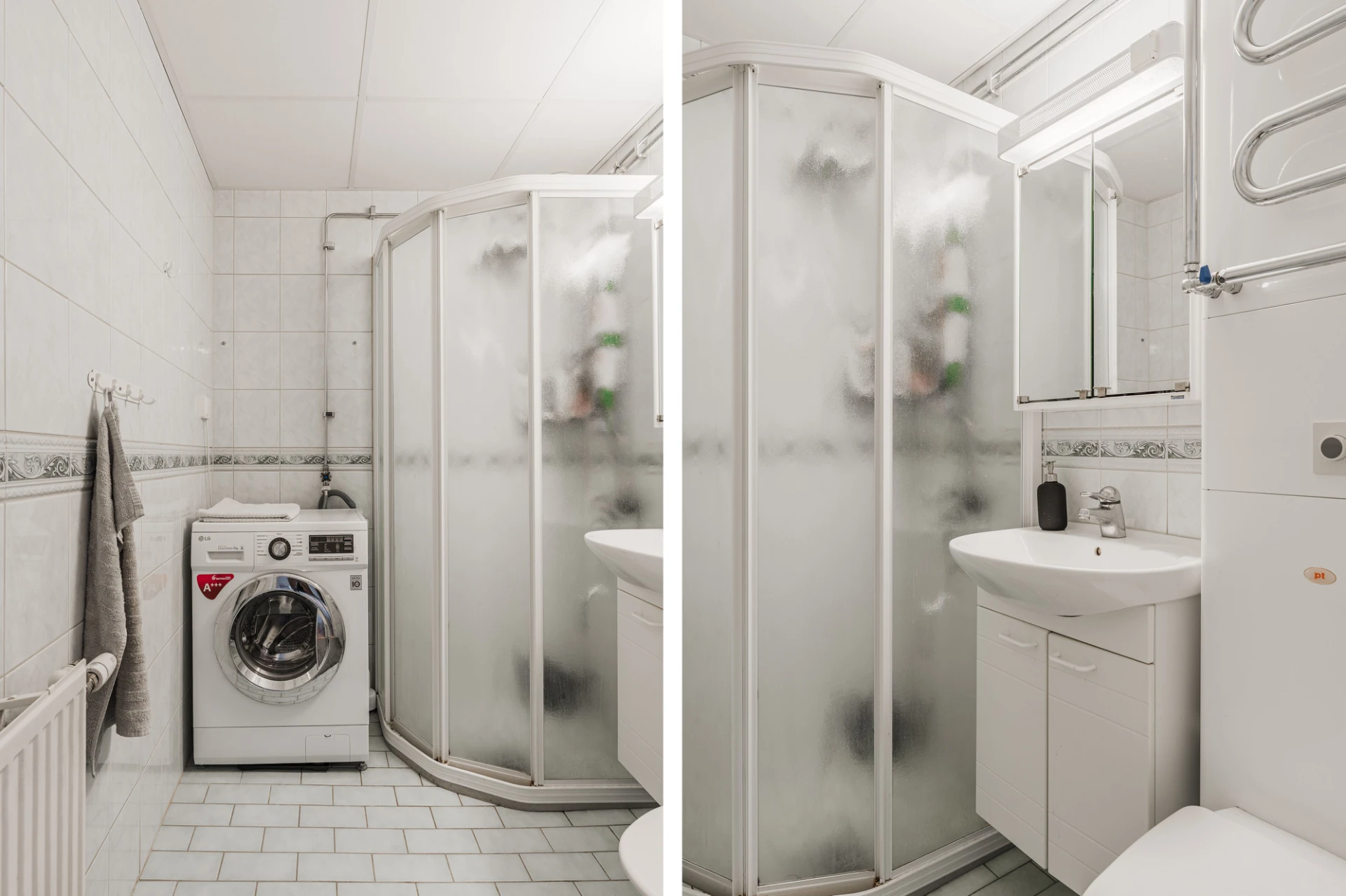 Helkaklat genomgående badrum utrustat med tvättmaskin, duschkabin, tvättställ med kommod, vägghängd spegel, handdukstork.