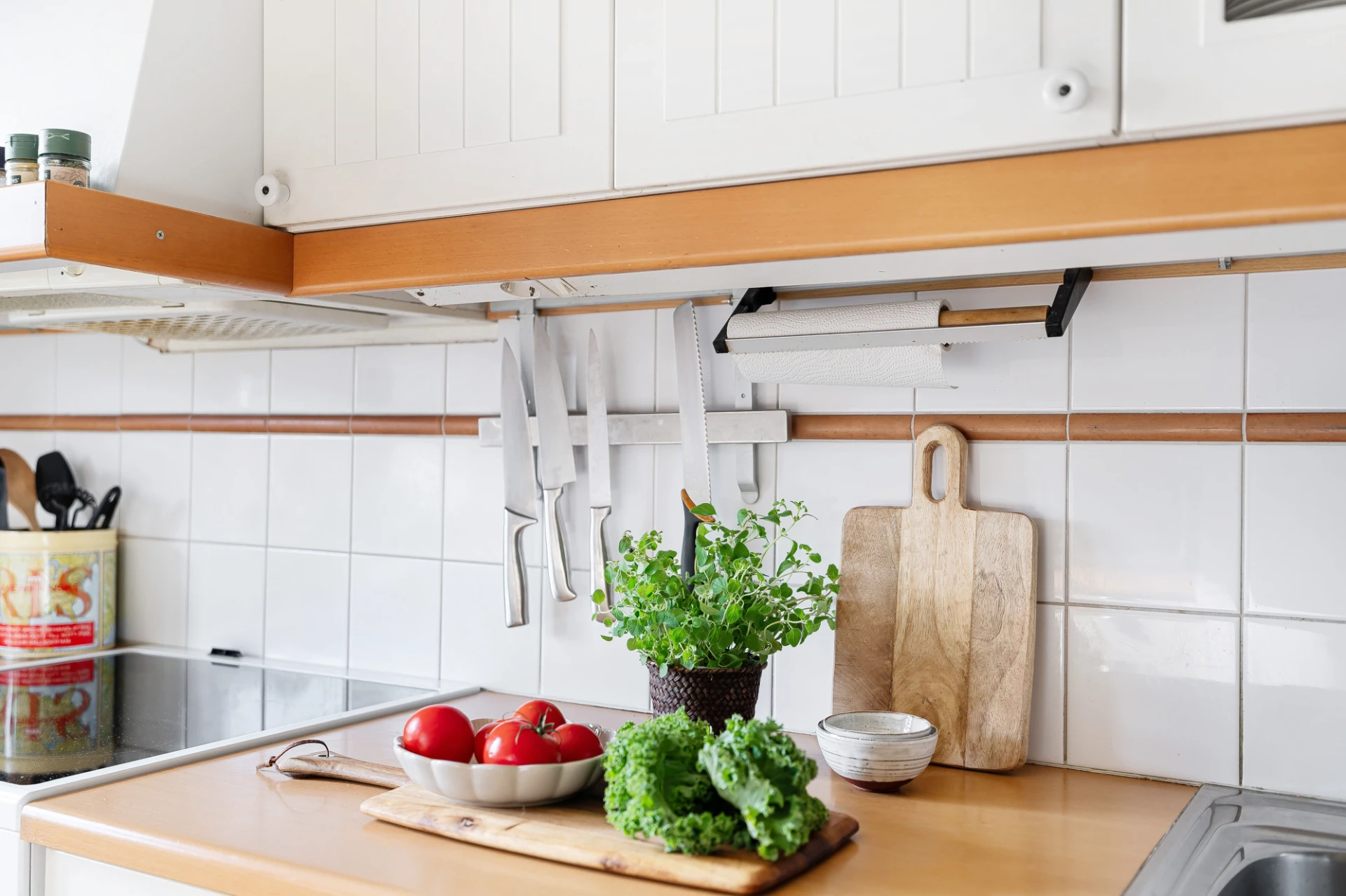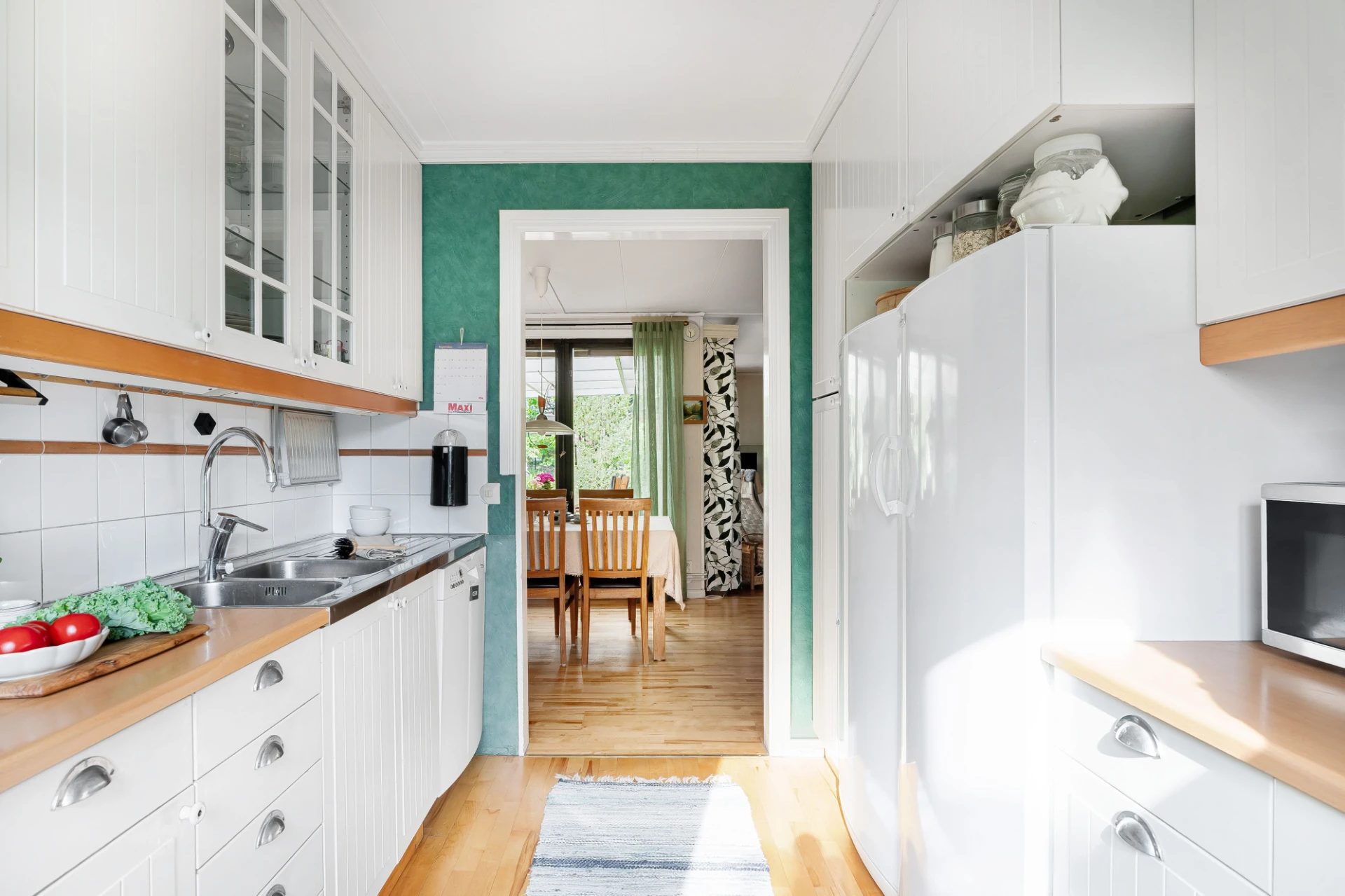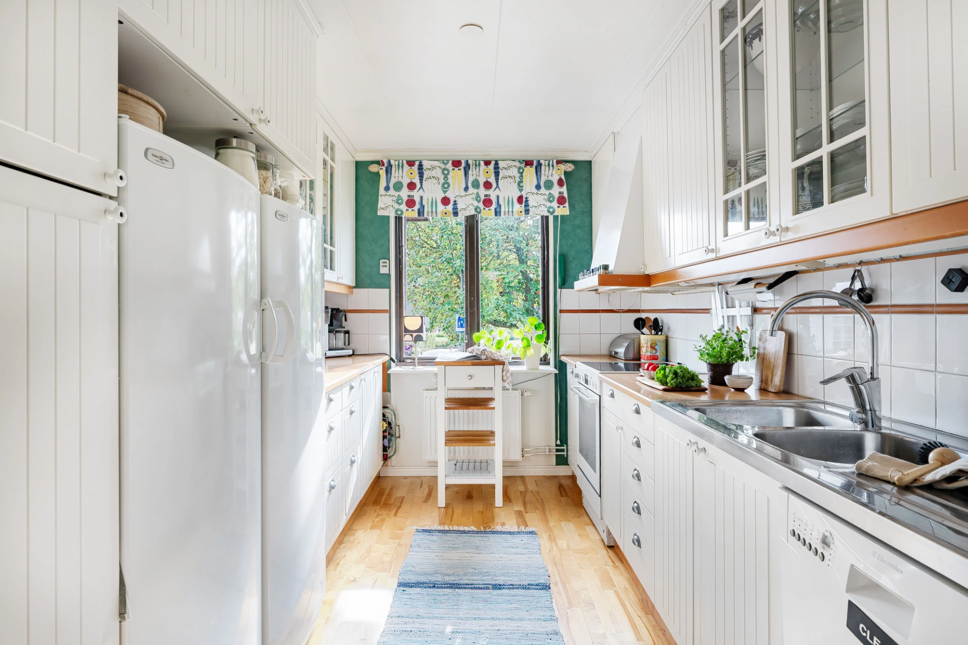 Parkettgolv och tapetserade väggar. Den maskinella utrustningen består av spis med ugn, spisfläkt, inbyggd diskmaskin samt kyl och frys i full höjd.