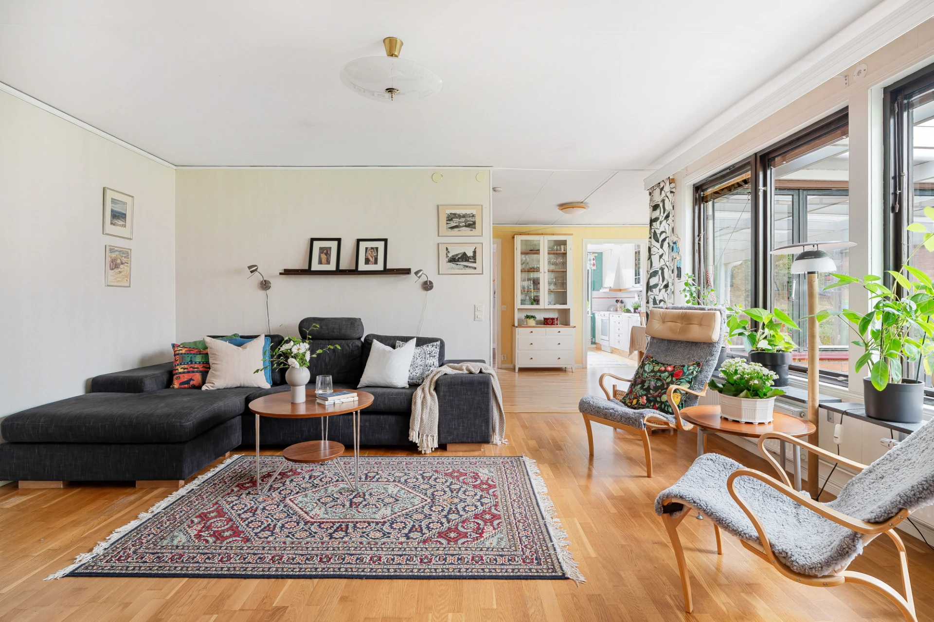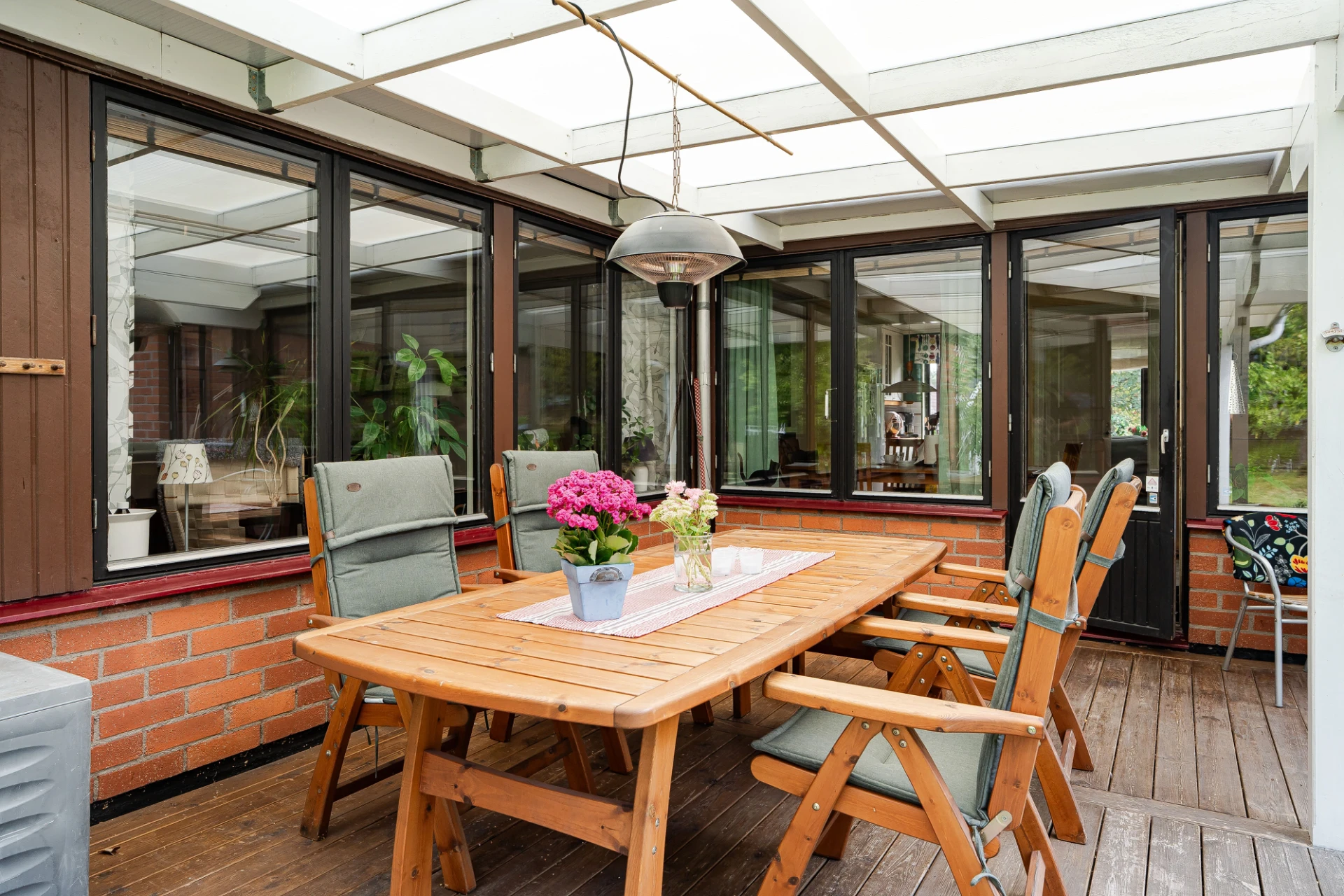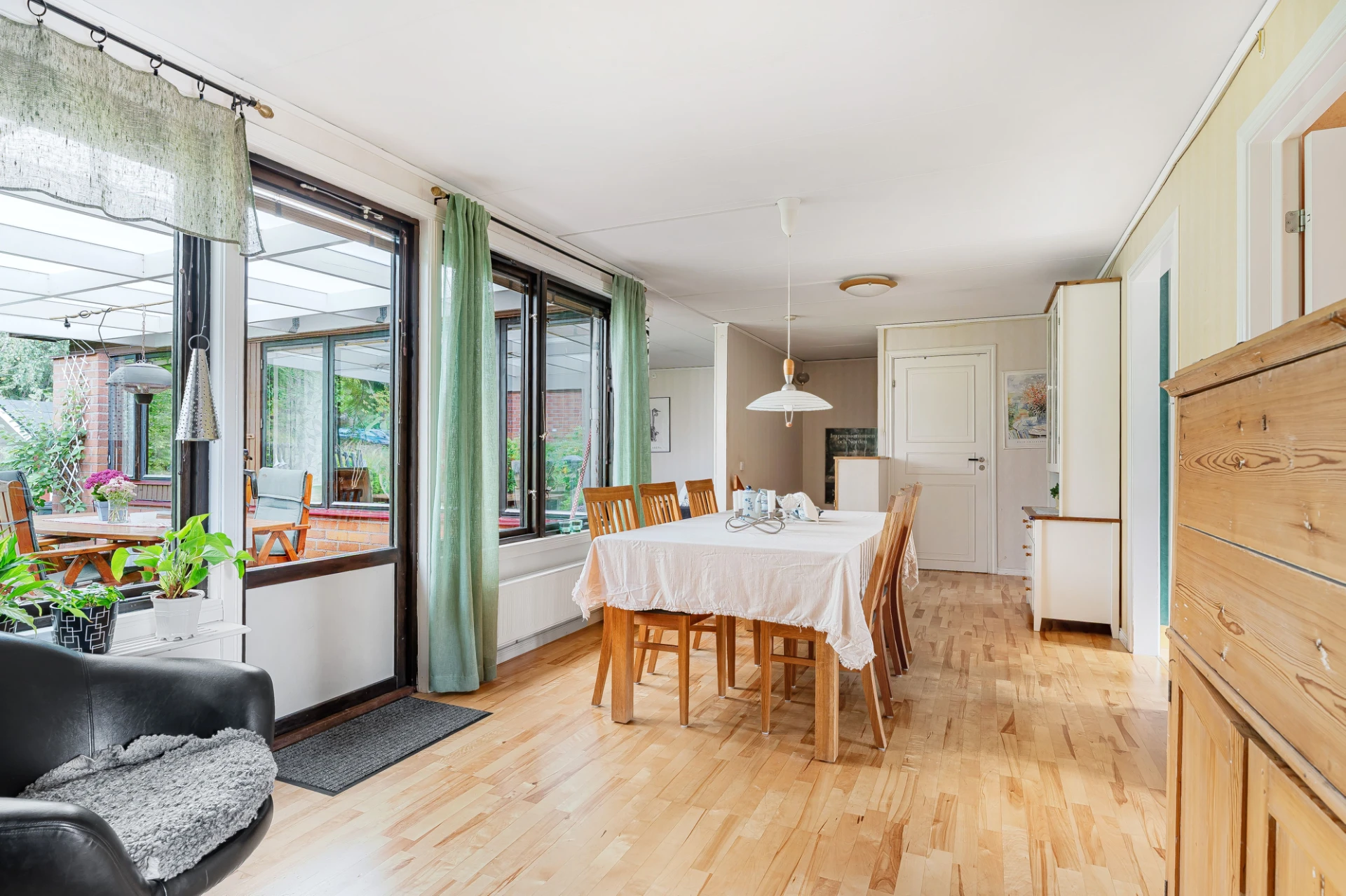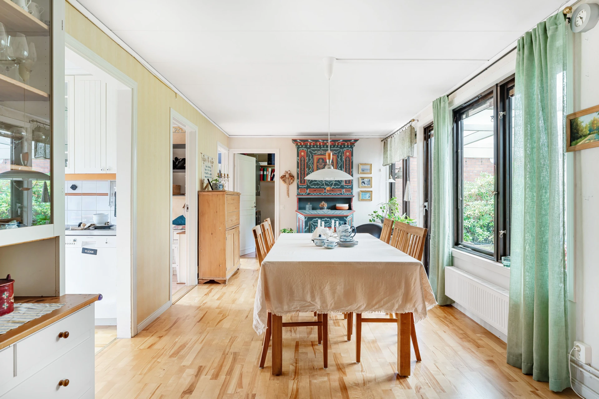 Parkettgolv och ljusa väggar. Här finns plats för större matbord. Från matrummet nås bostadens altan.