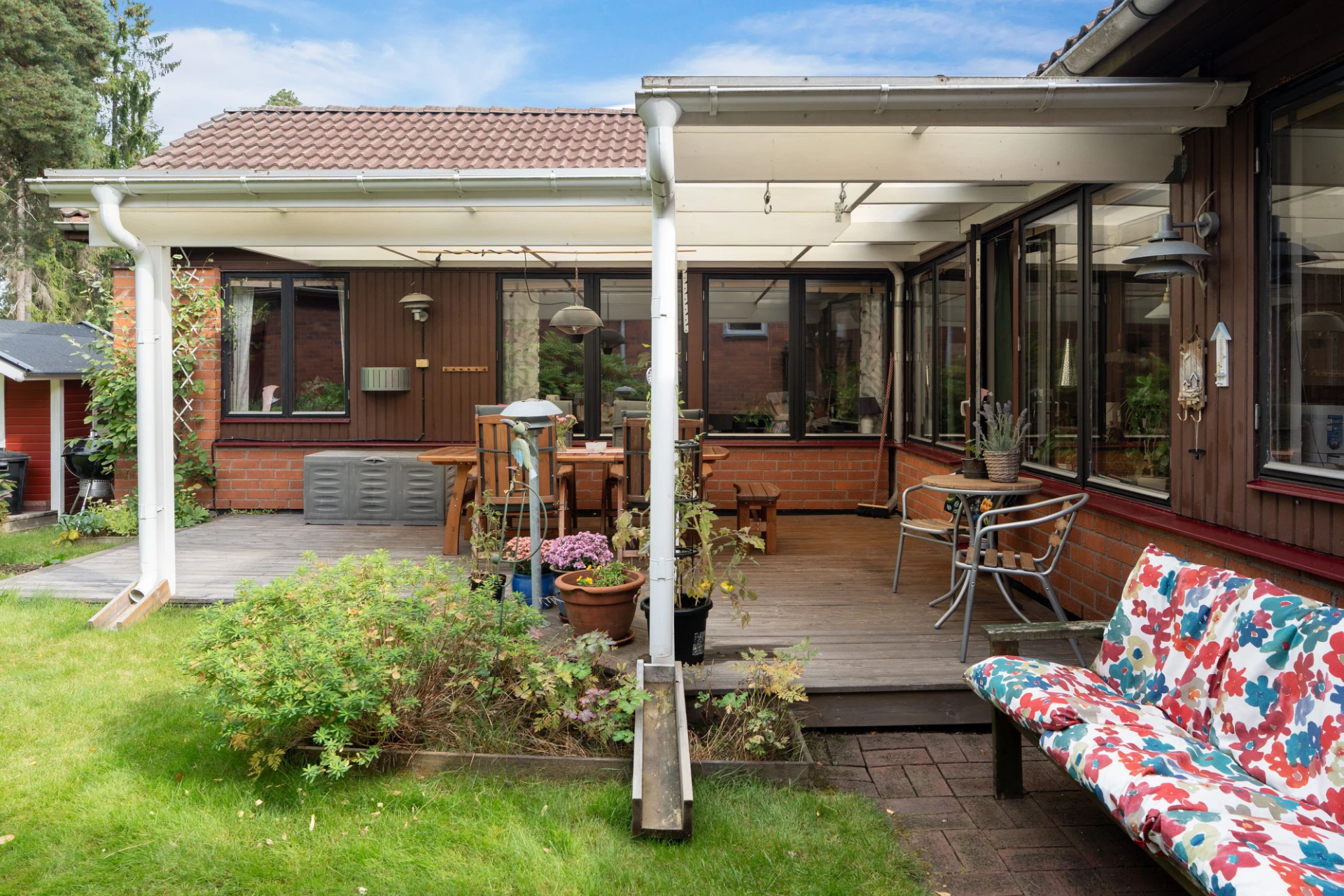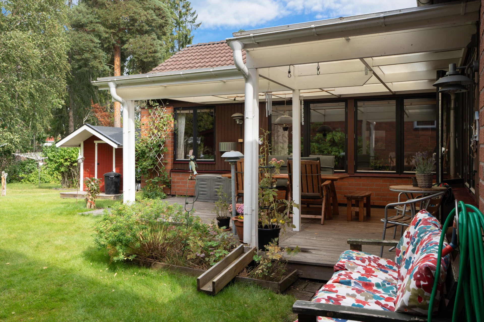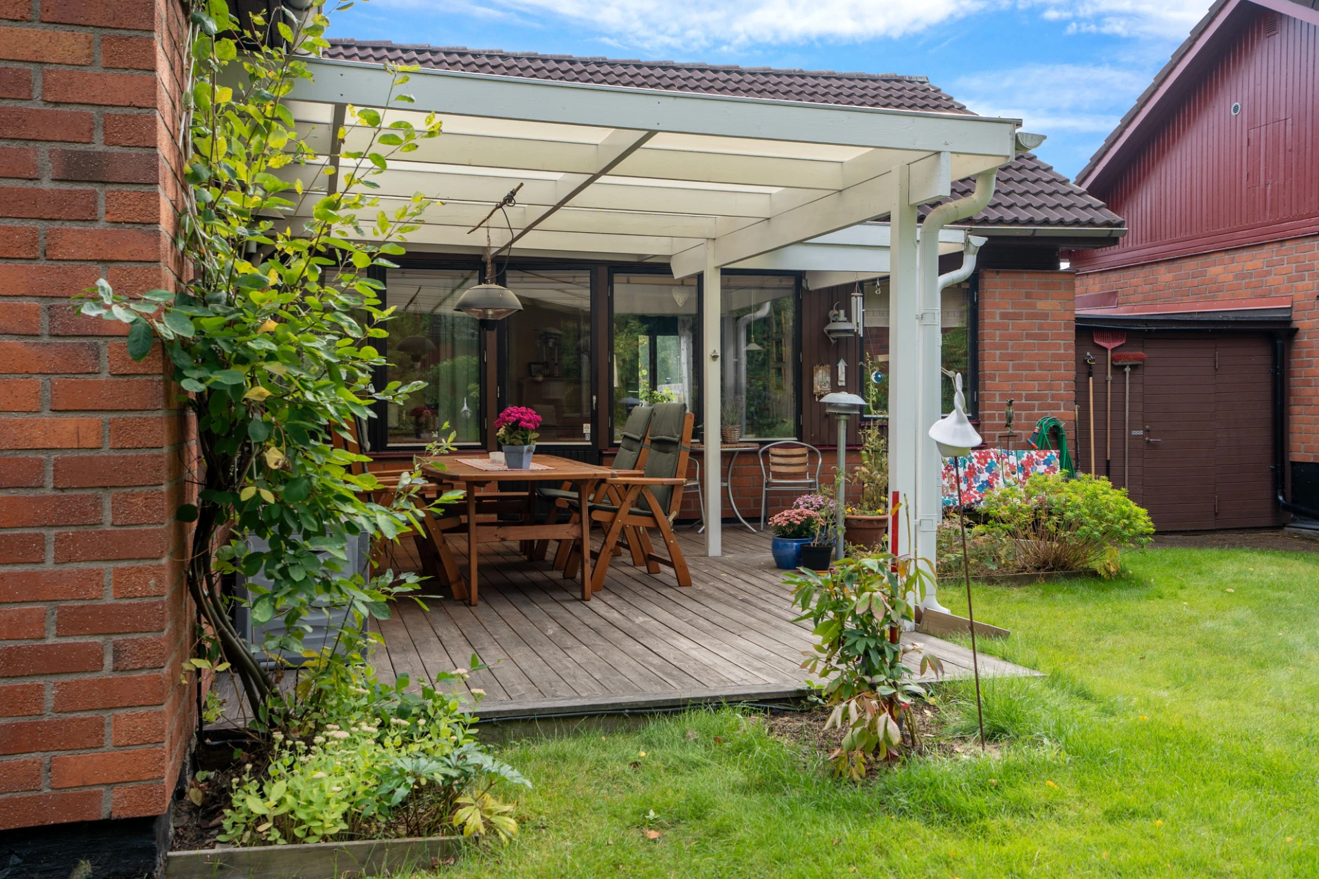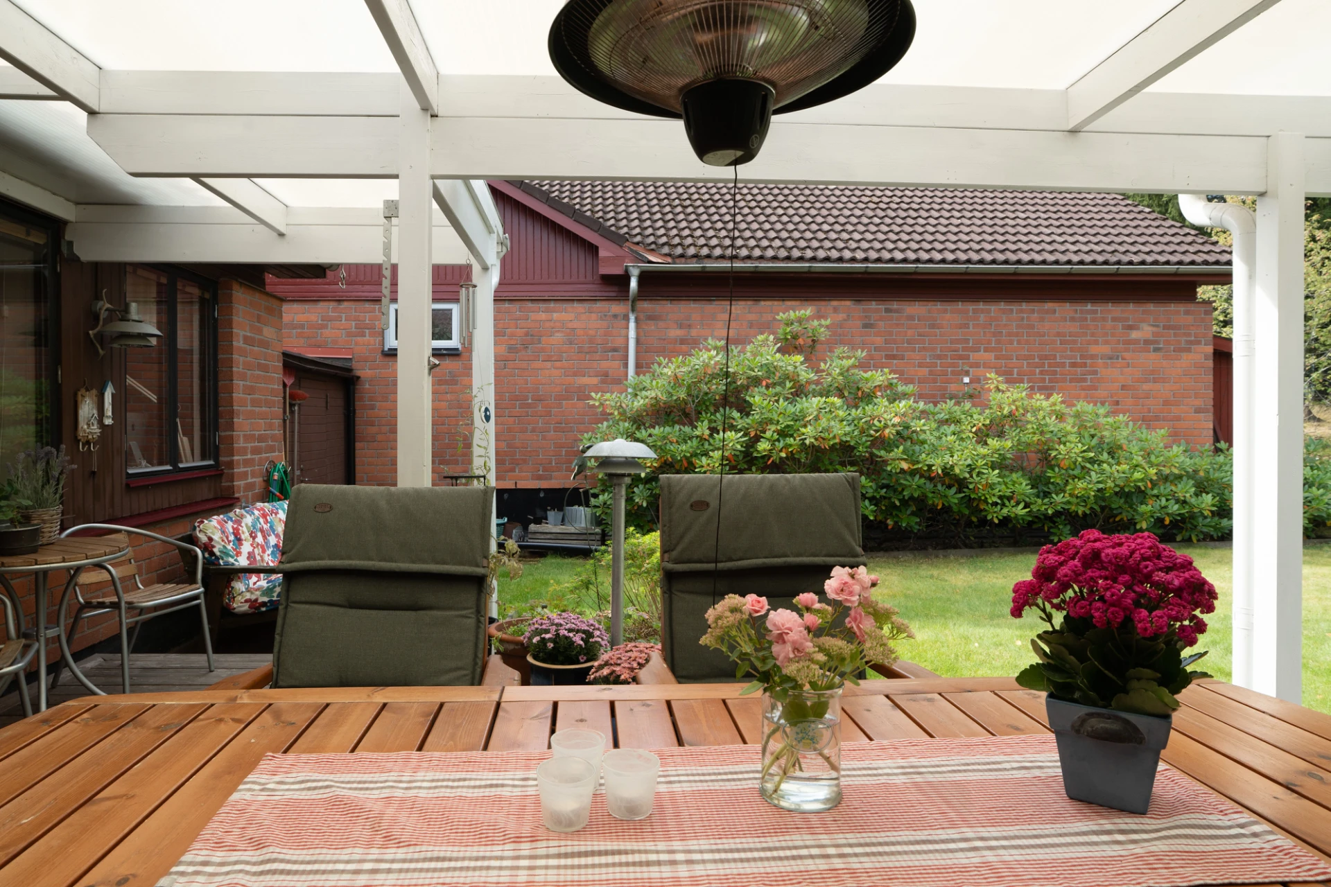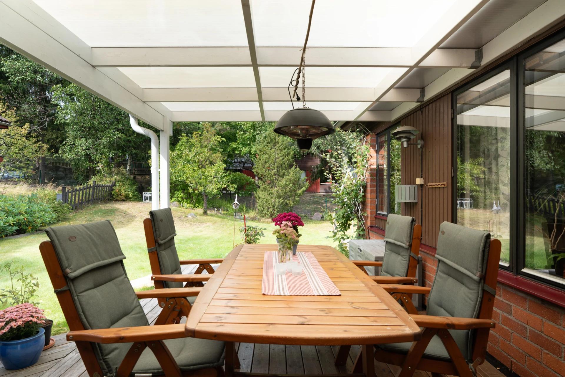 Parkettgolv och ljusa väggar. Här finns plats för större matbord. Från matrummet nås bostadens altan.