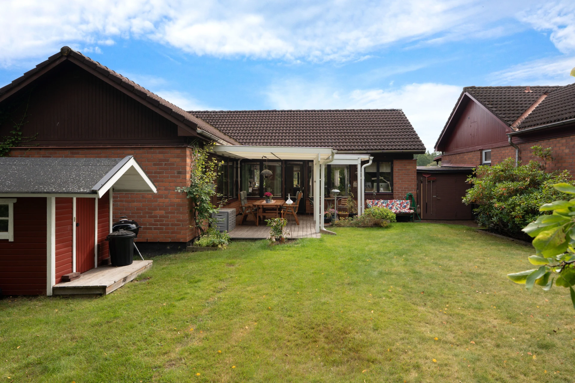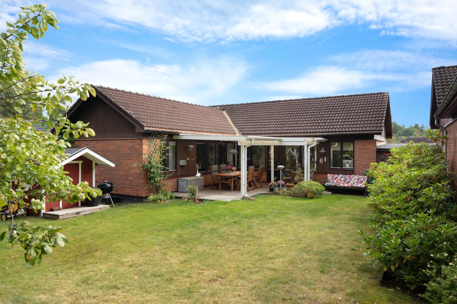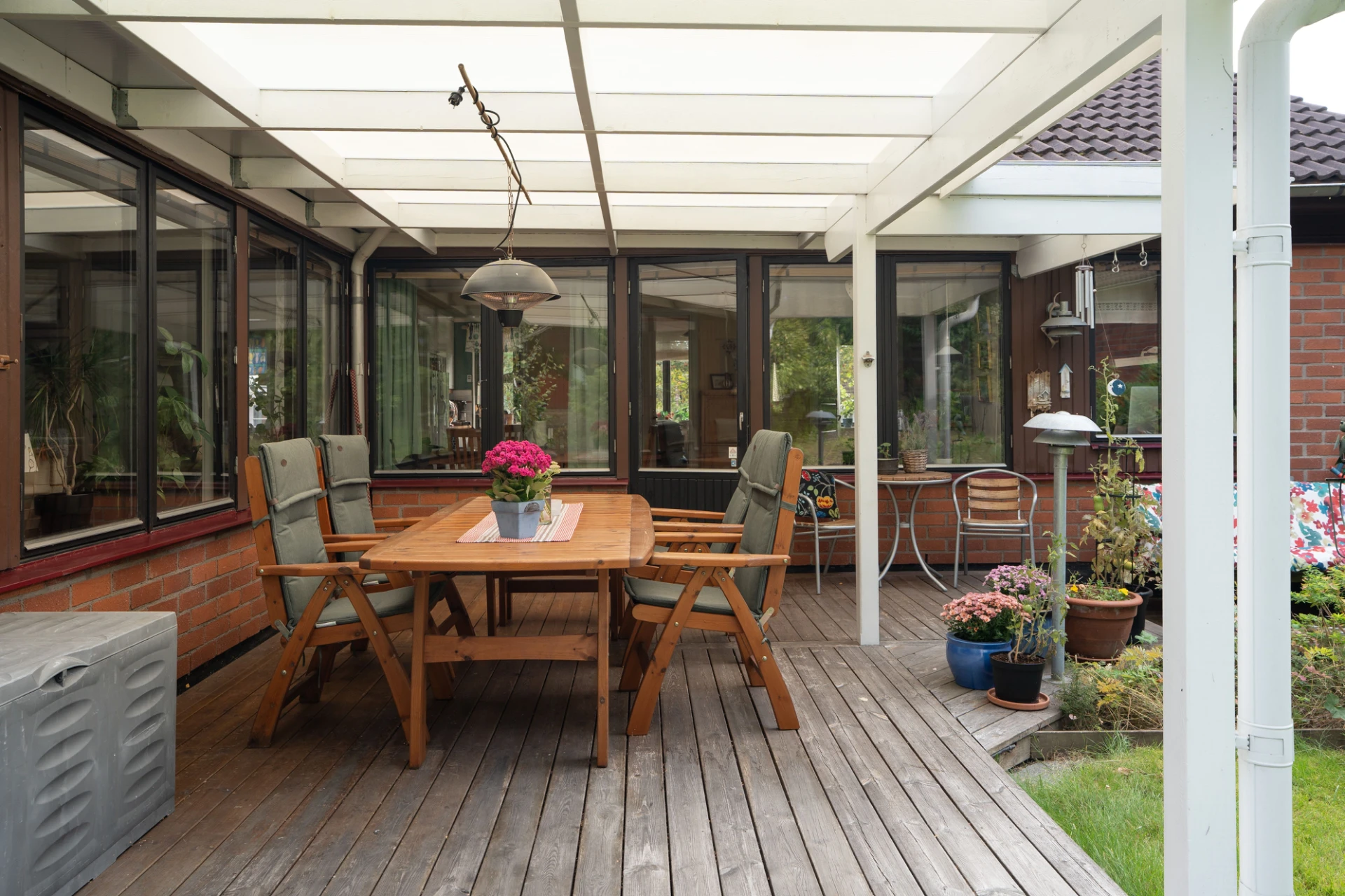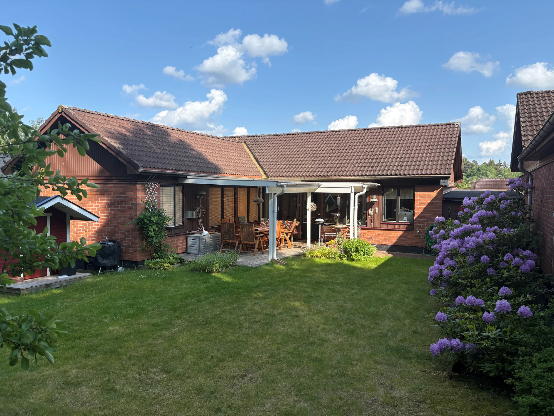 Parkettgolv och ljusa väggar. Här finns plats för större matbord. Från matrummet nås bostadens altan.