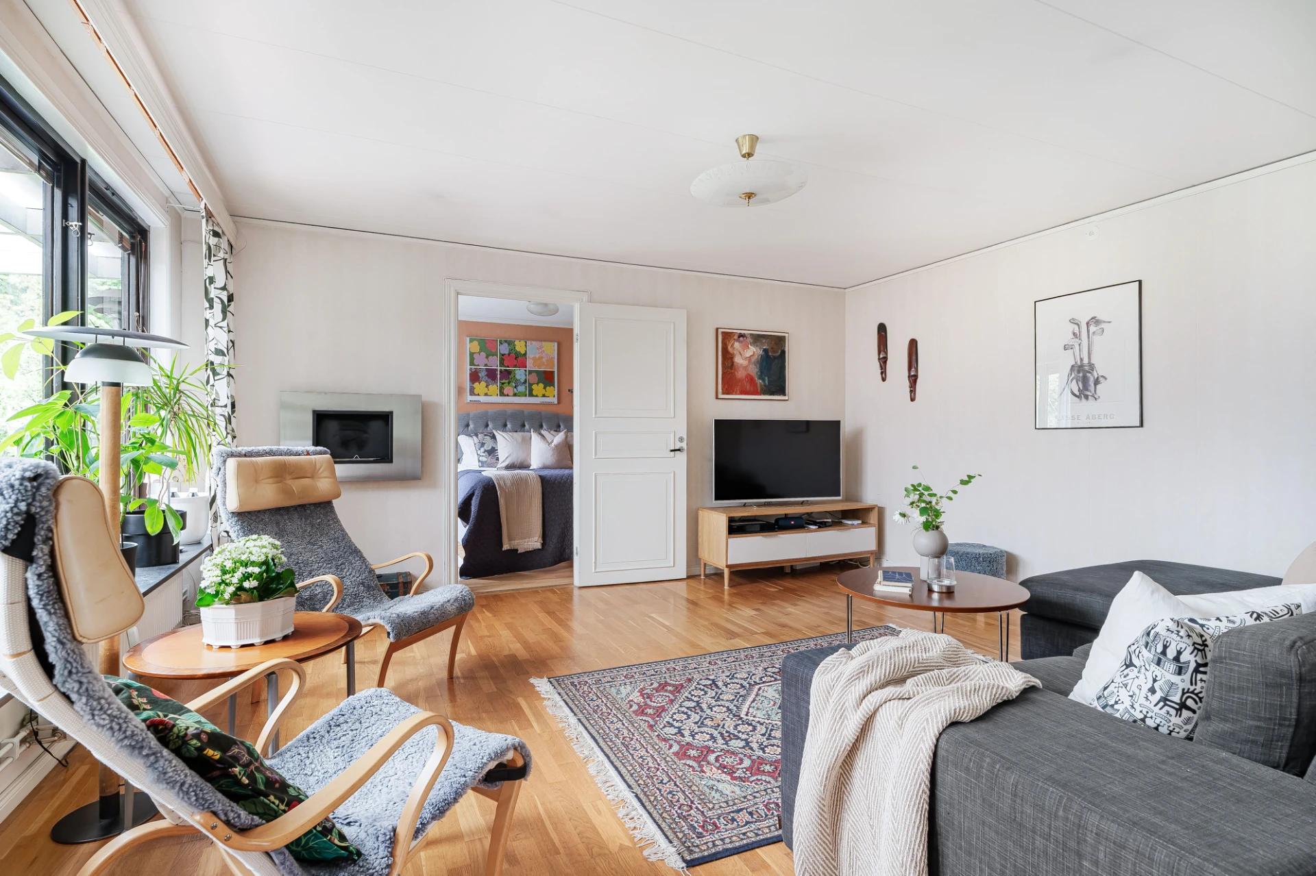 Parkettgolv och ljusa väggar. Här finns plats för soffa med tillhörande möblemang.