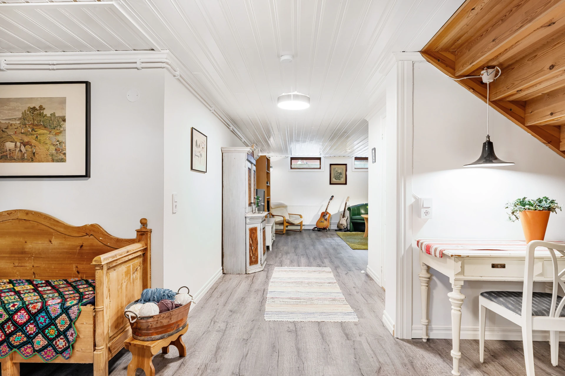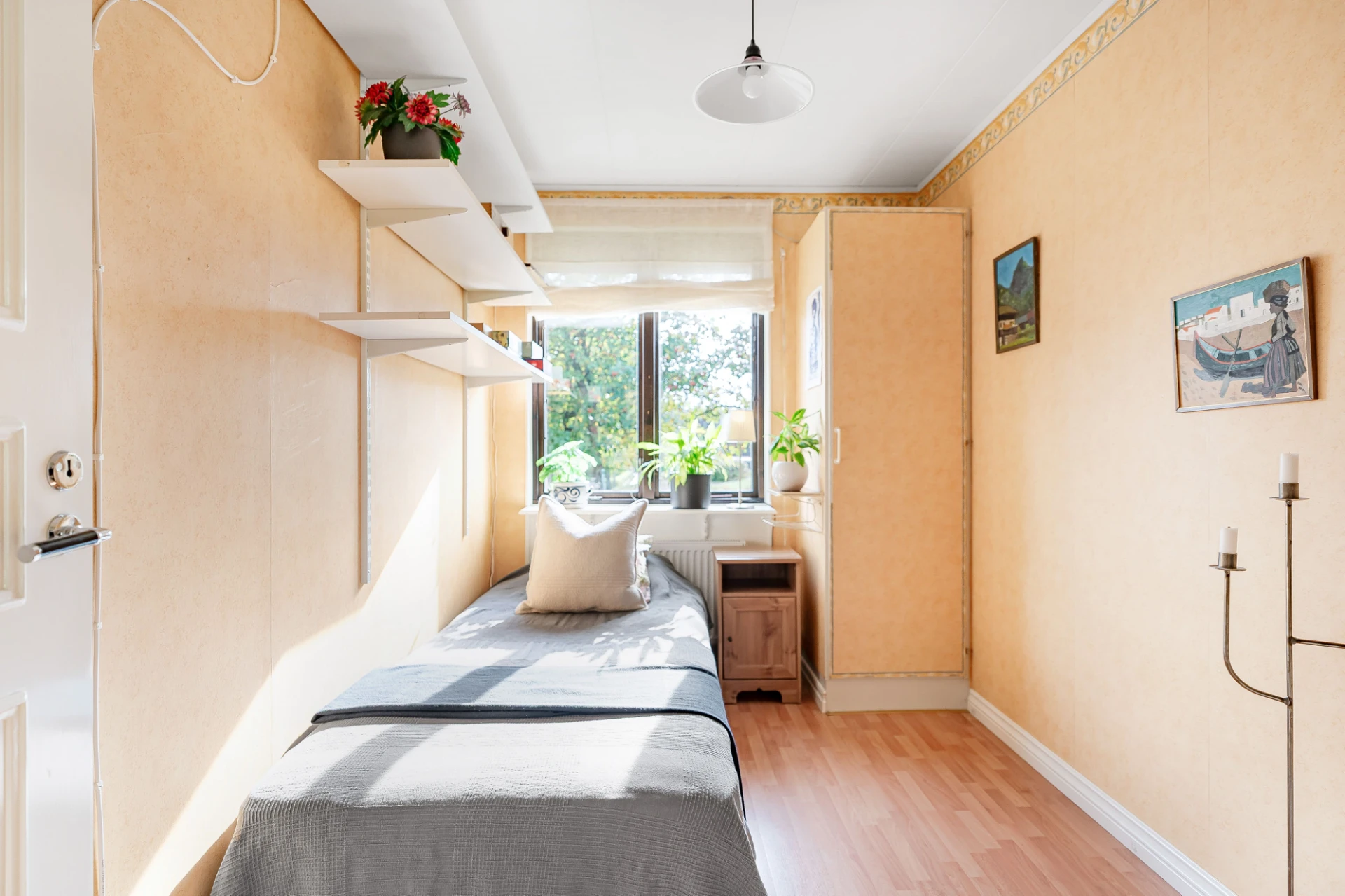 Parkettgolv och tapetserade väggar. Här finns plats för säng med tillhörande möblemang samt skrivbordshörna. Förvaring i garderob med skjutdörrar.
