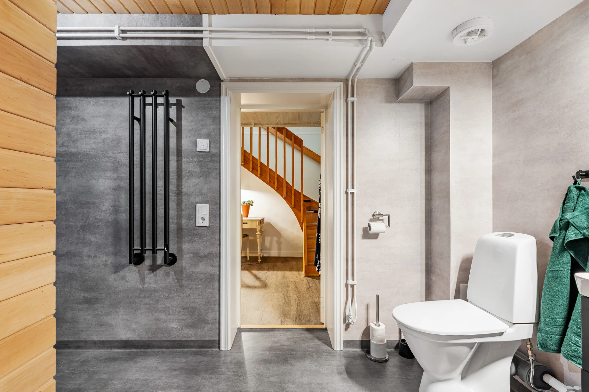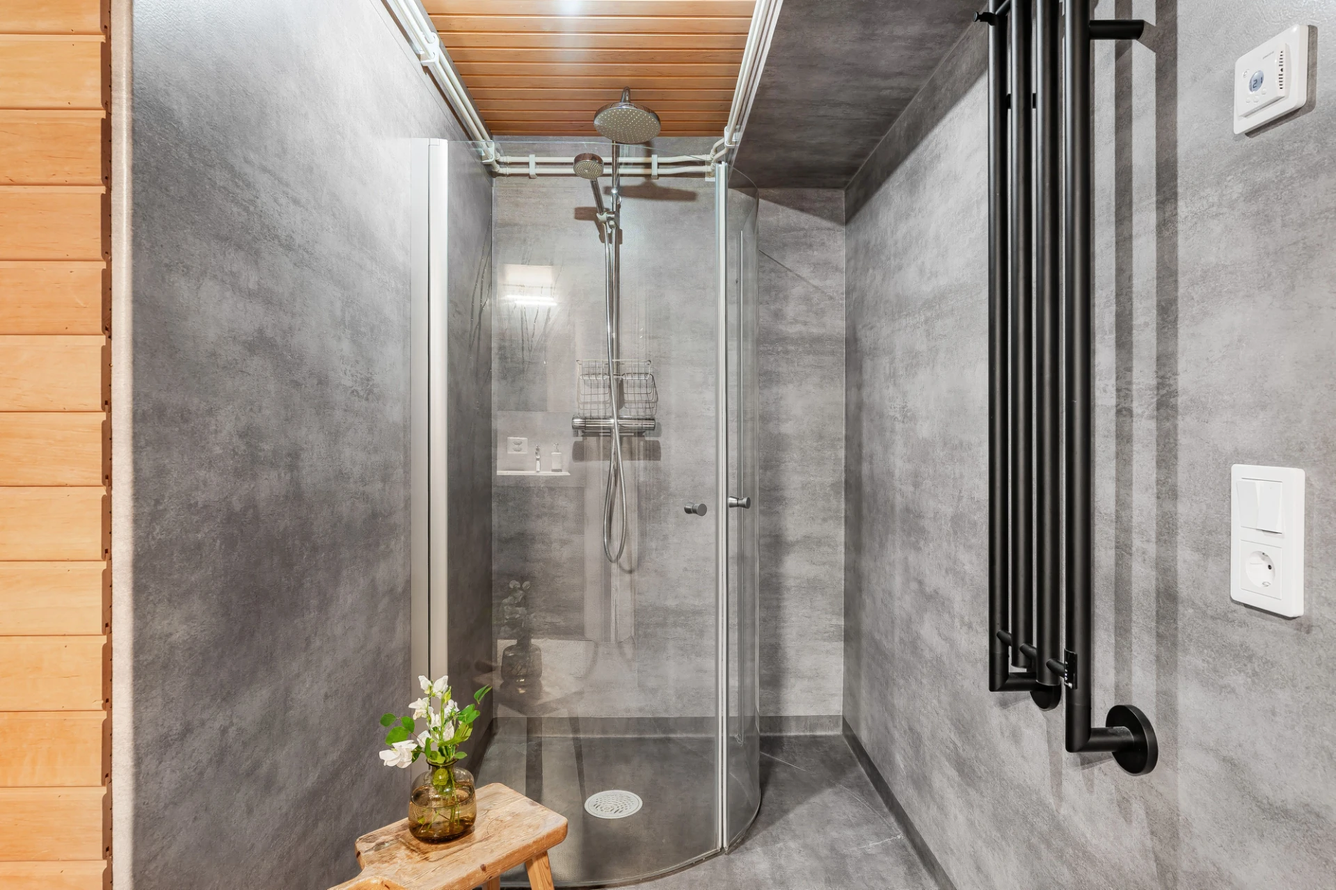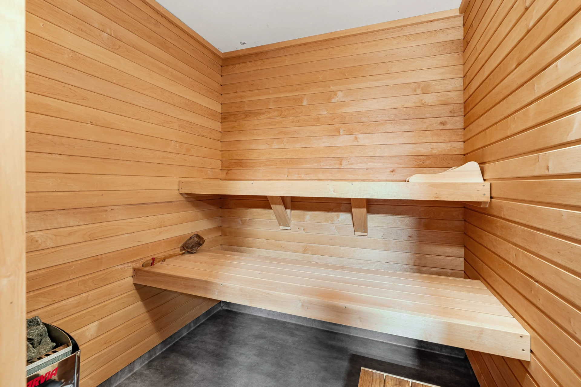 Plastmatta med golvvärme och våtrumstapet. Relaxen är utrustad med wc, handfat med kommod, vägghängd spegel, bastu, handdukstork samt dusch med vikbara glasdörrar.