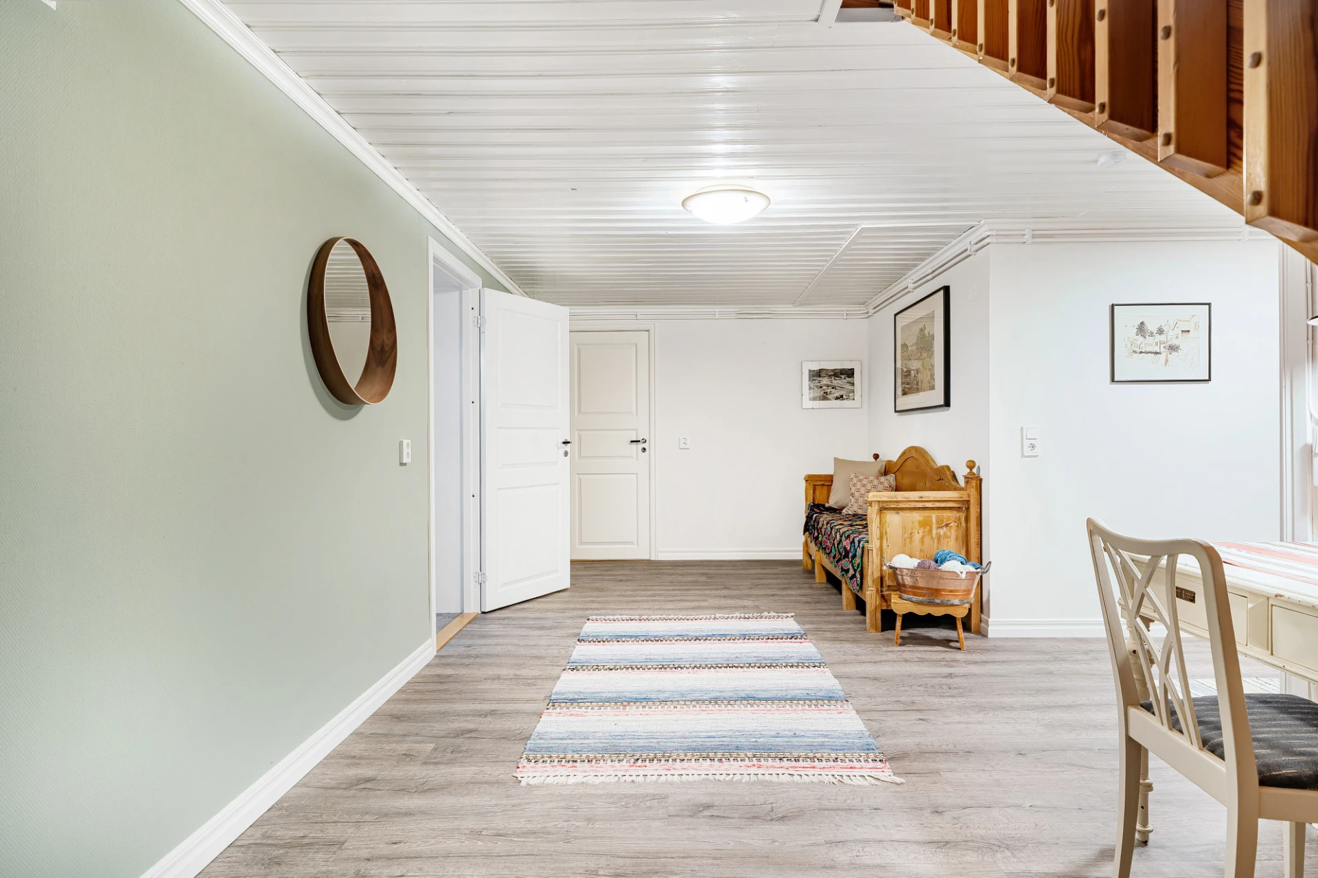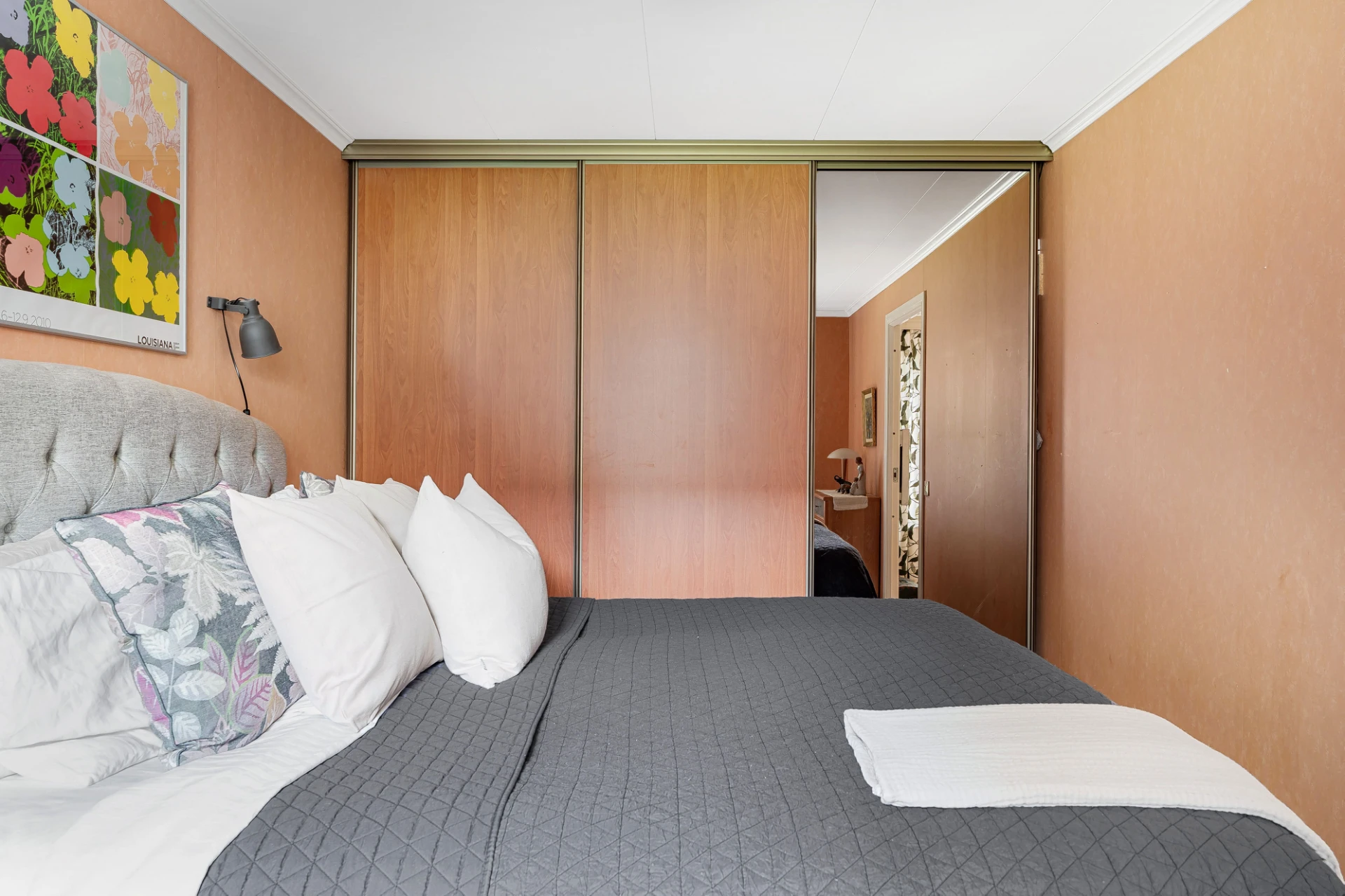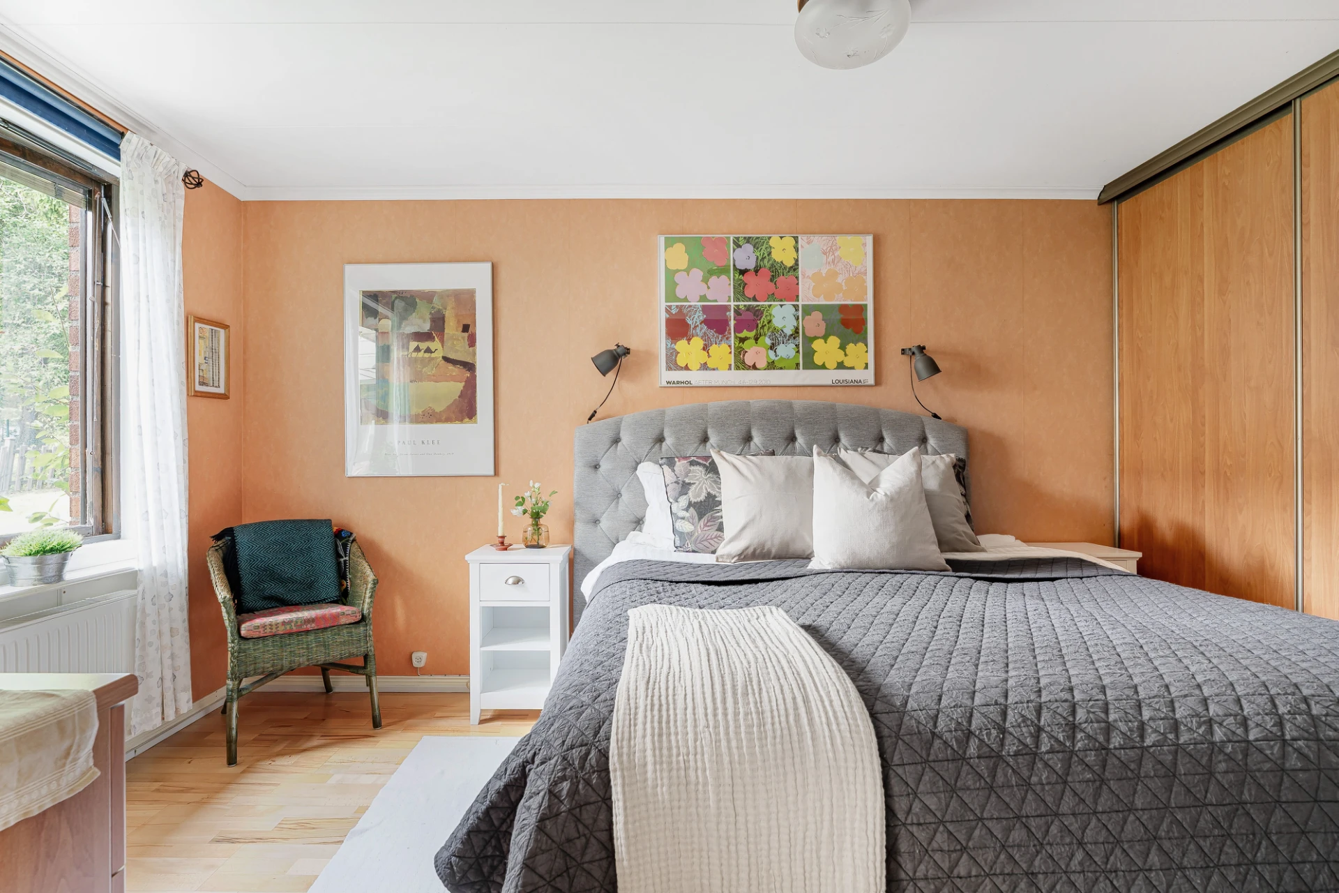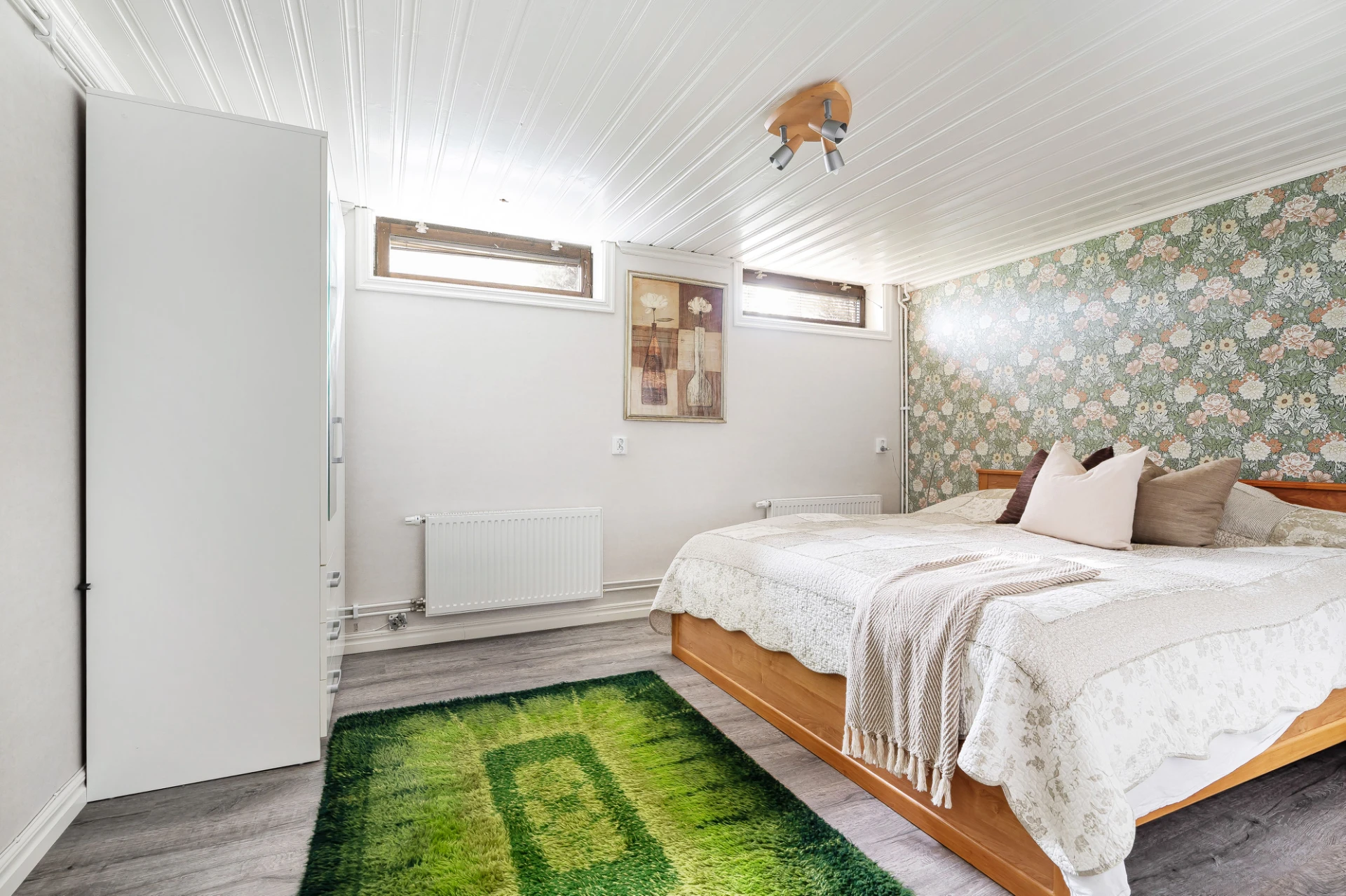 Laminatgolv och tapetserade väggar. Här finns plats för säng med tillhörande möblemang. Förvaring i inbyggd garderob.