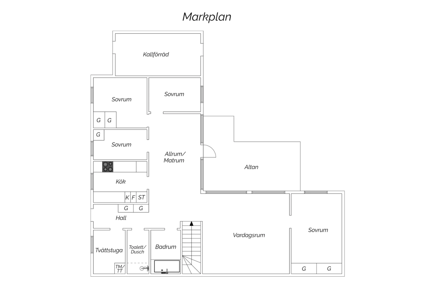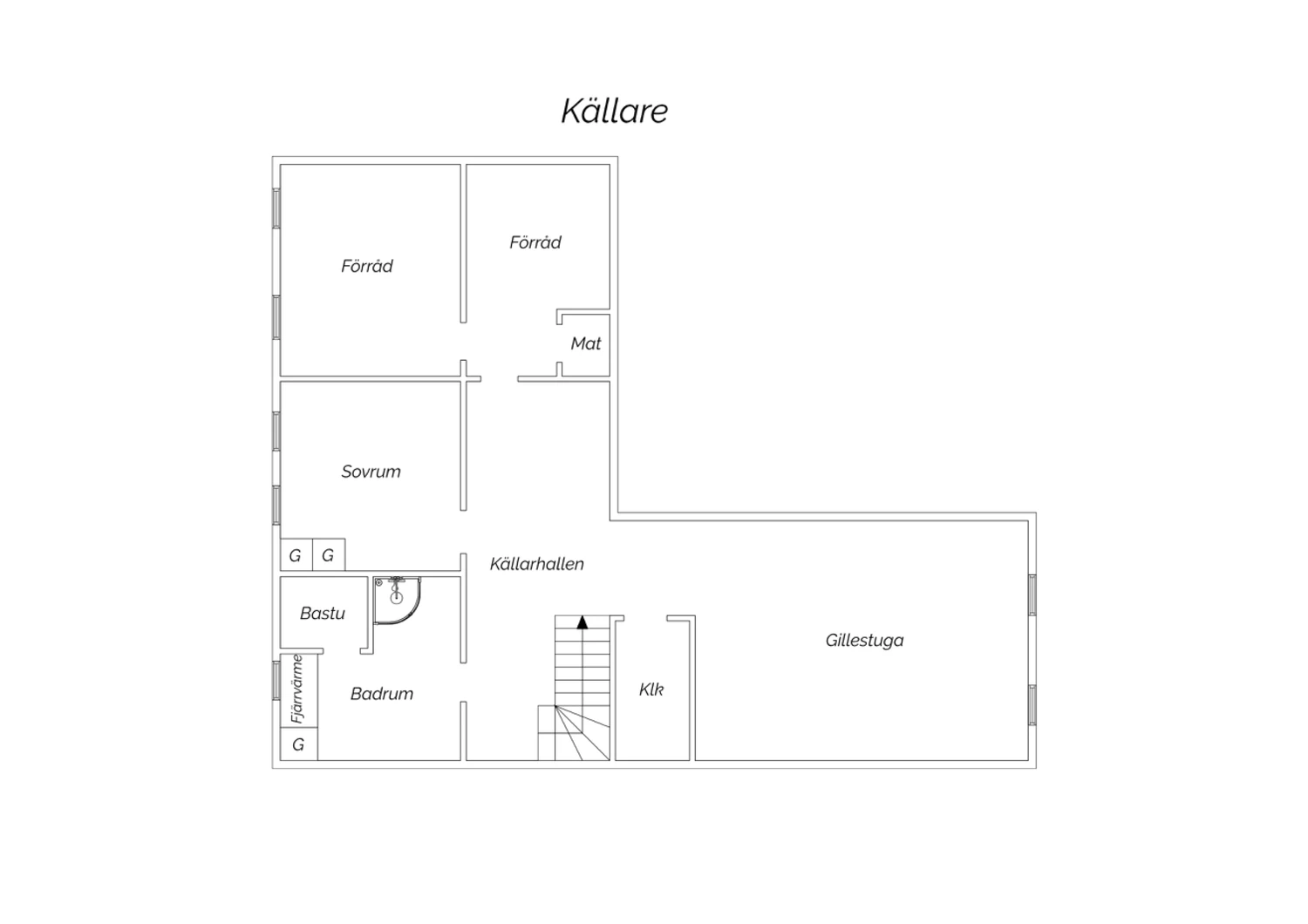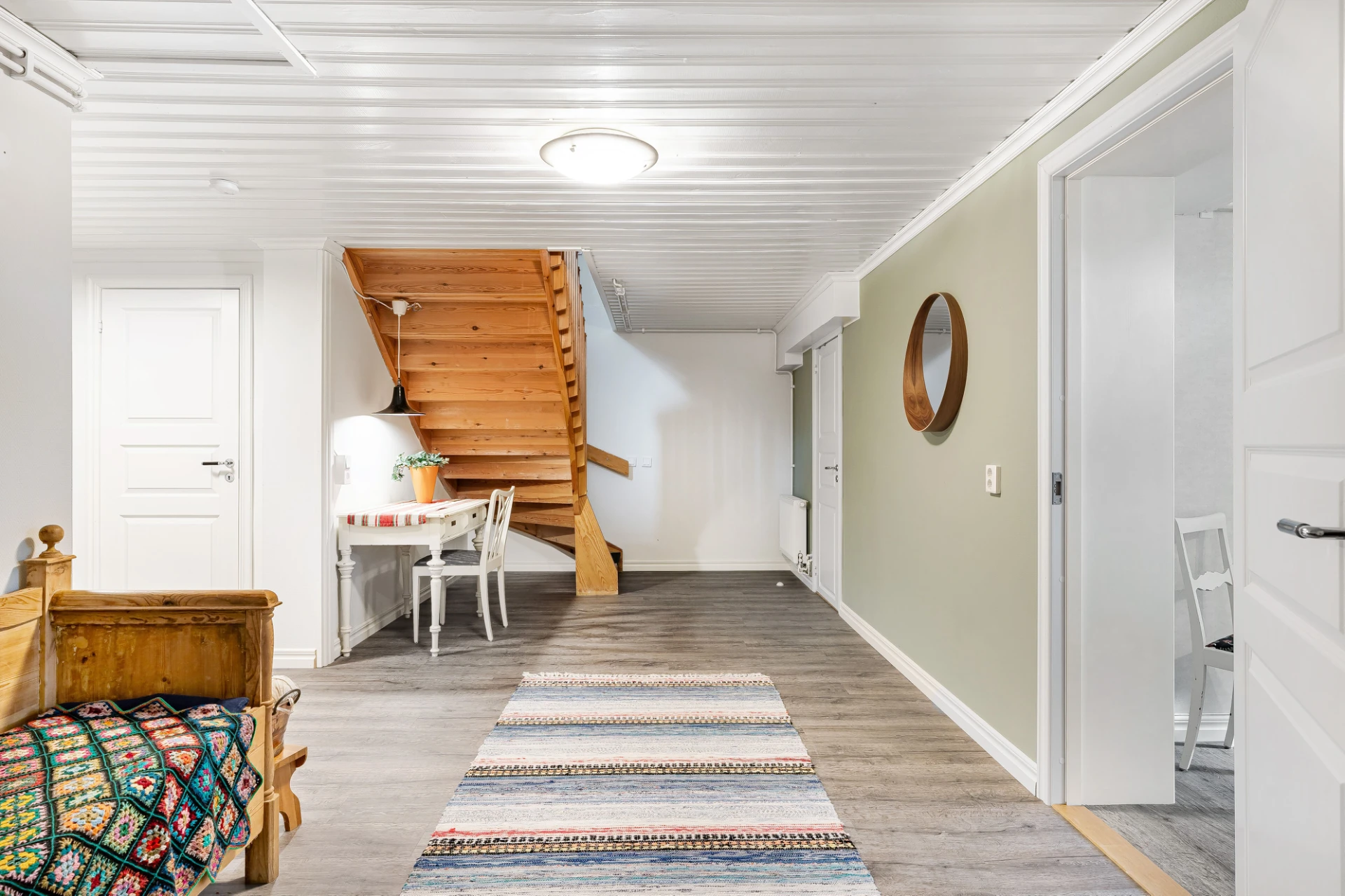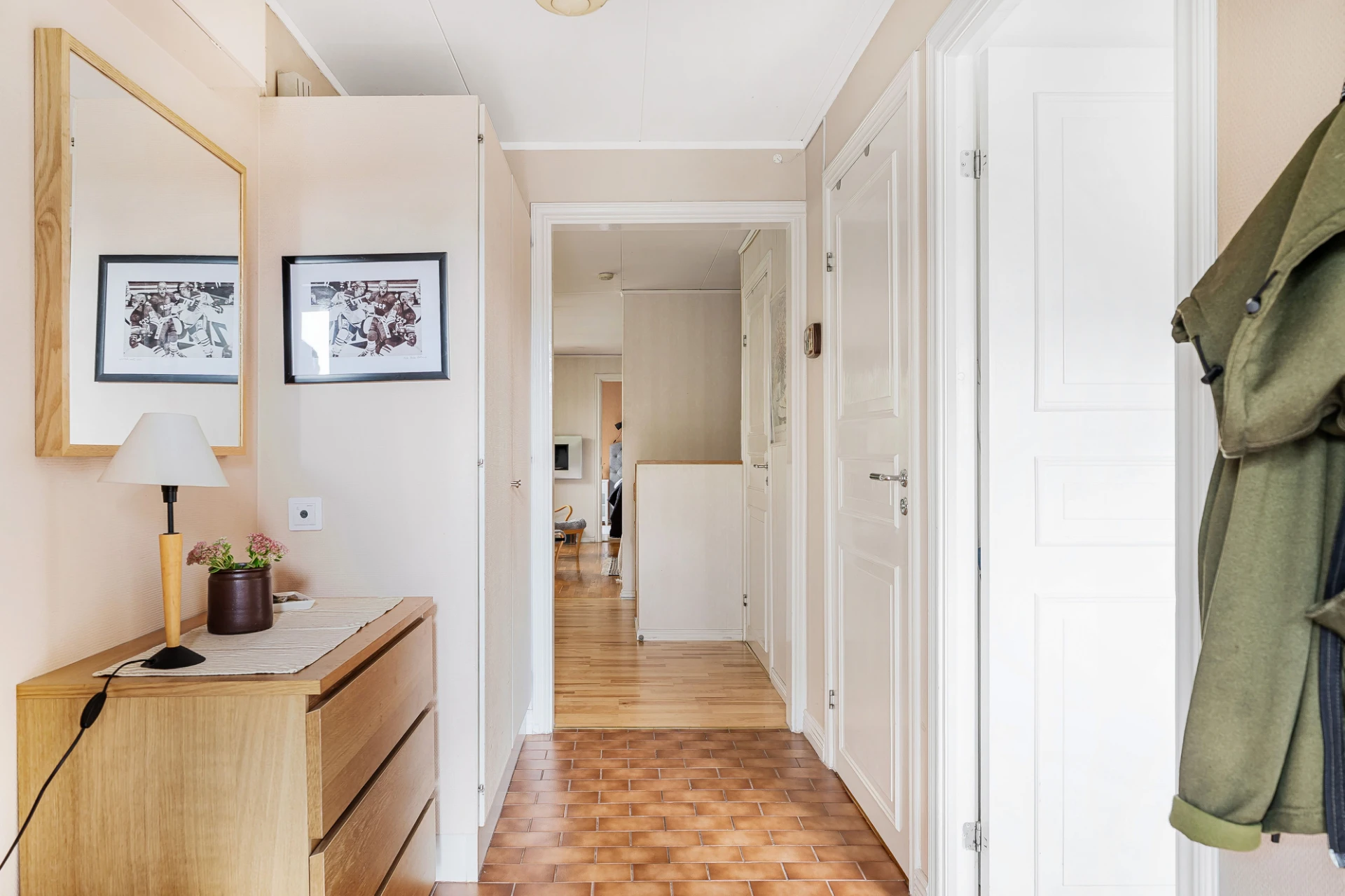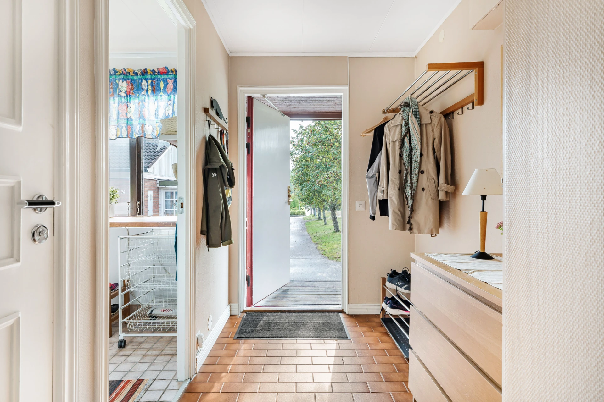 Klinkergolv med elburen golvvärme och ljusa väggar. Här finns plats för avhängning samt förvaring i platsbyggda garderober.