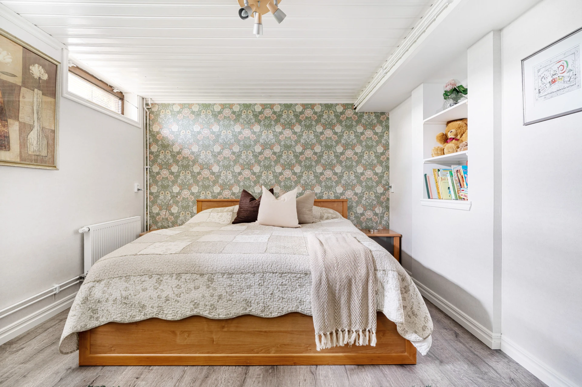 Laminatgolv och ljusa väggar med mönstrad fondvägg. Här finns plats för säng med tillhörande möblemang. Förvaring i garderob.