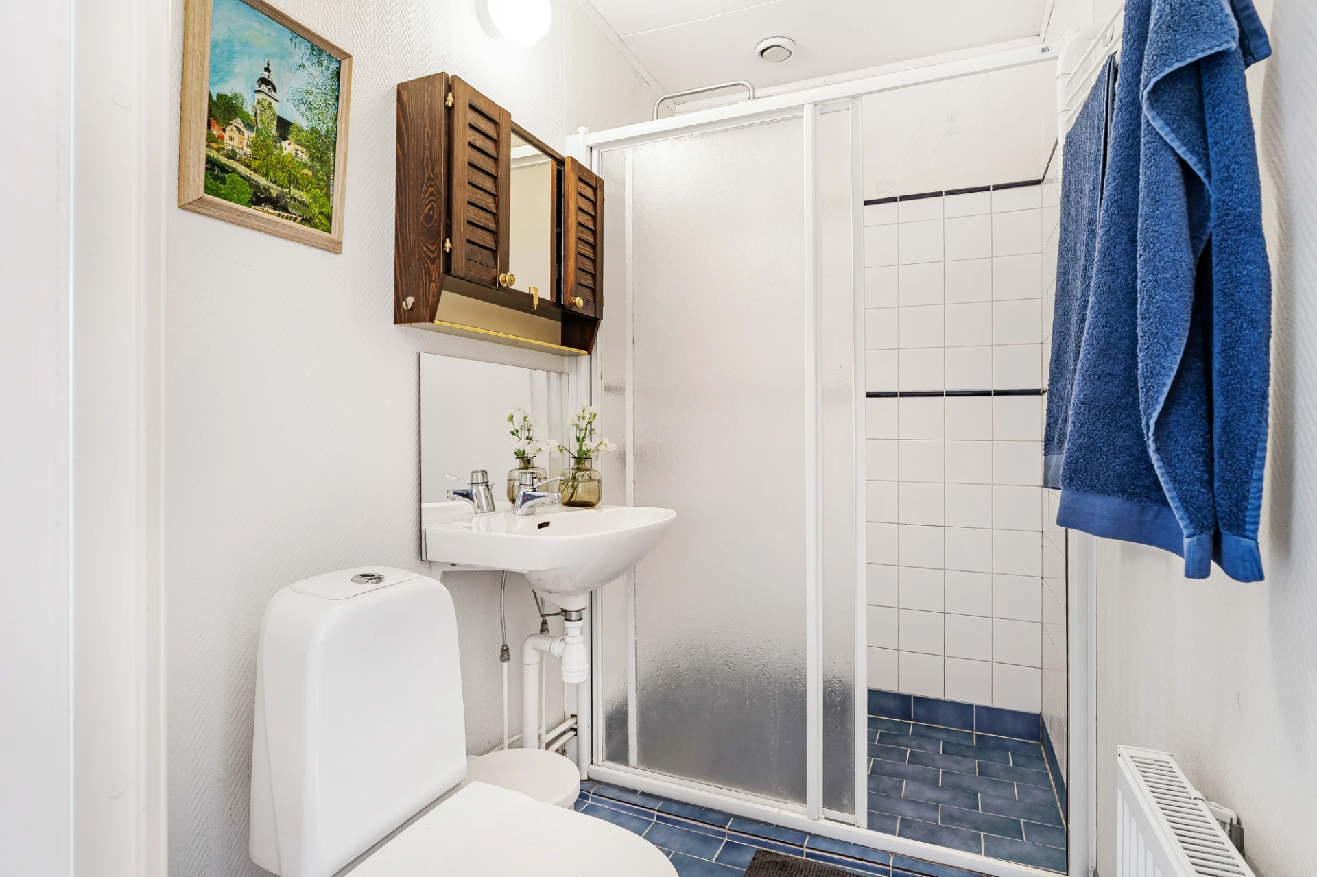 Klinkergolv och ljusa väggar. Badrummet är utrustad med wc, handfat, vägghängt spegelskåp samt dusch.