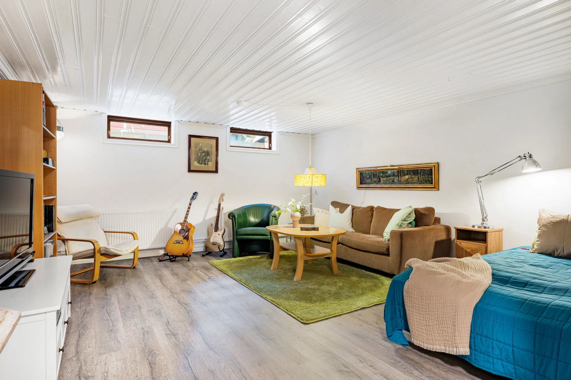 Laminatgolv och ljusa väggar. Här finns plats för soffa med tillhörande möblemang.