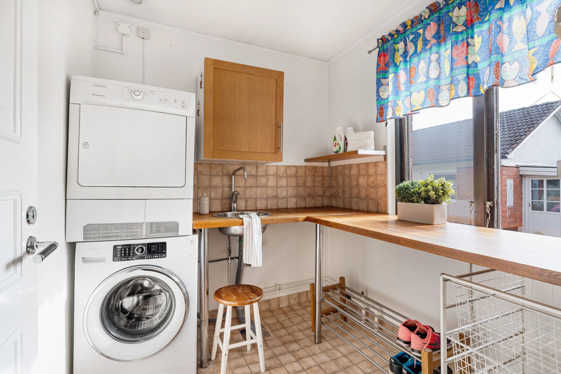 Klinkergolv och ljusa väggar. Tvättstugan är utrustad med tvättmaskin, torktumlare, tvättho, arbetsbänk samt förvaringsskåp.