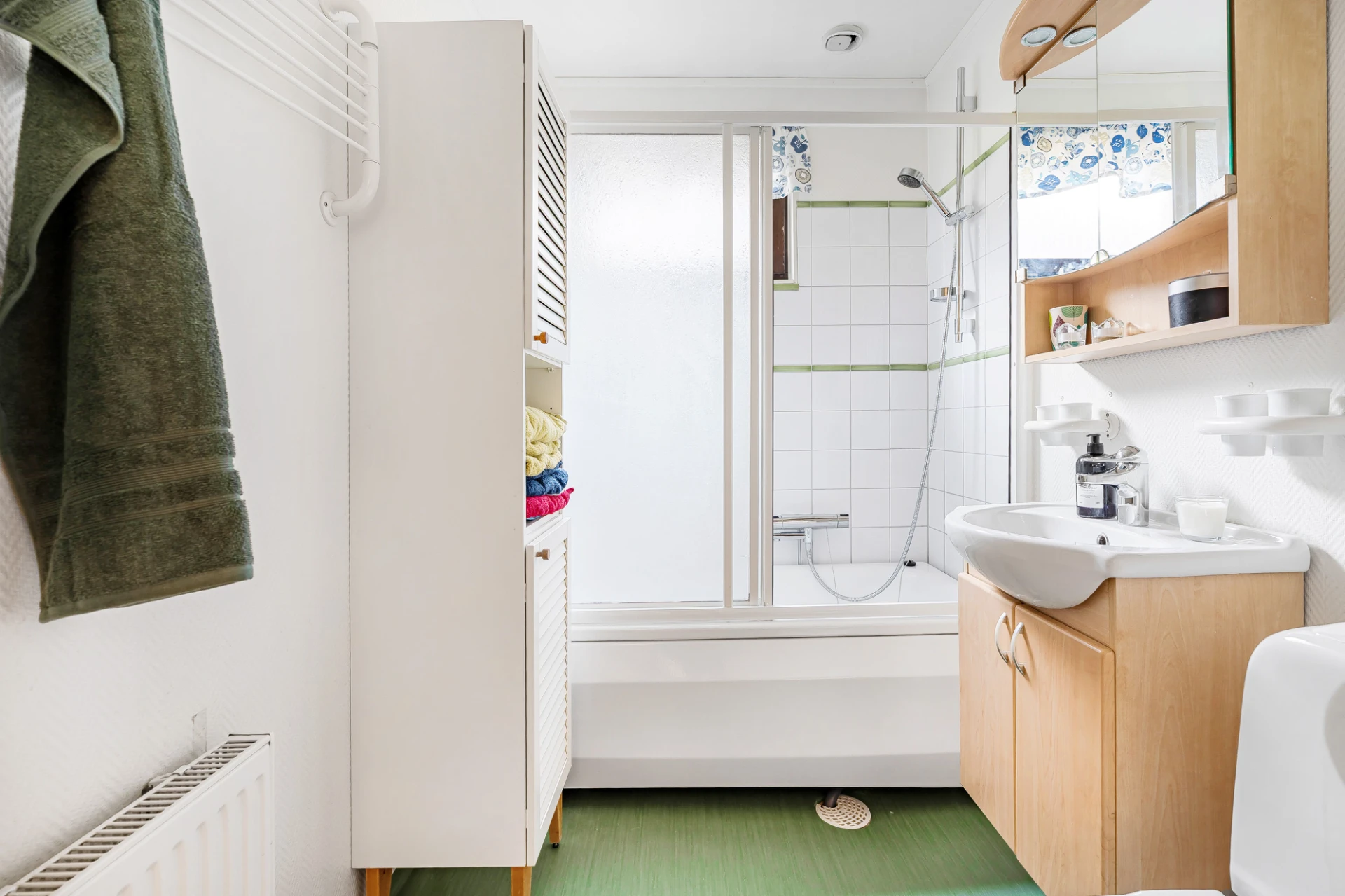 Plastmatta och ljusa väggar. Badrummet är utrustad med wc, handfat med kommod, vägghängt spegelskåp samt badkar med dusch.