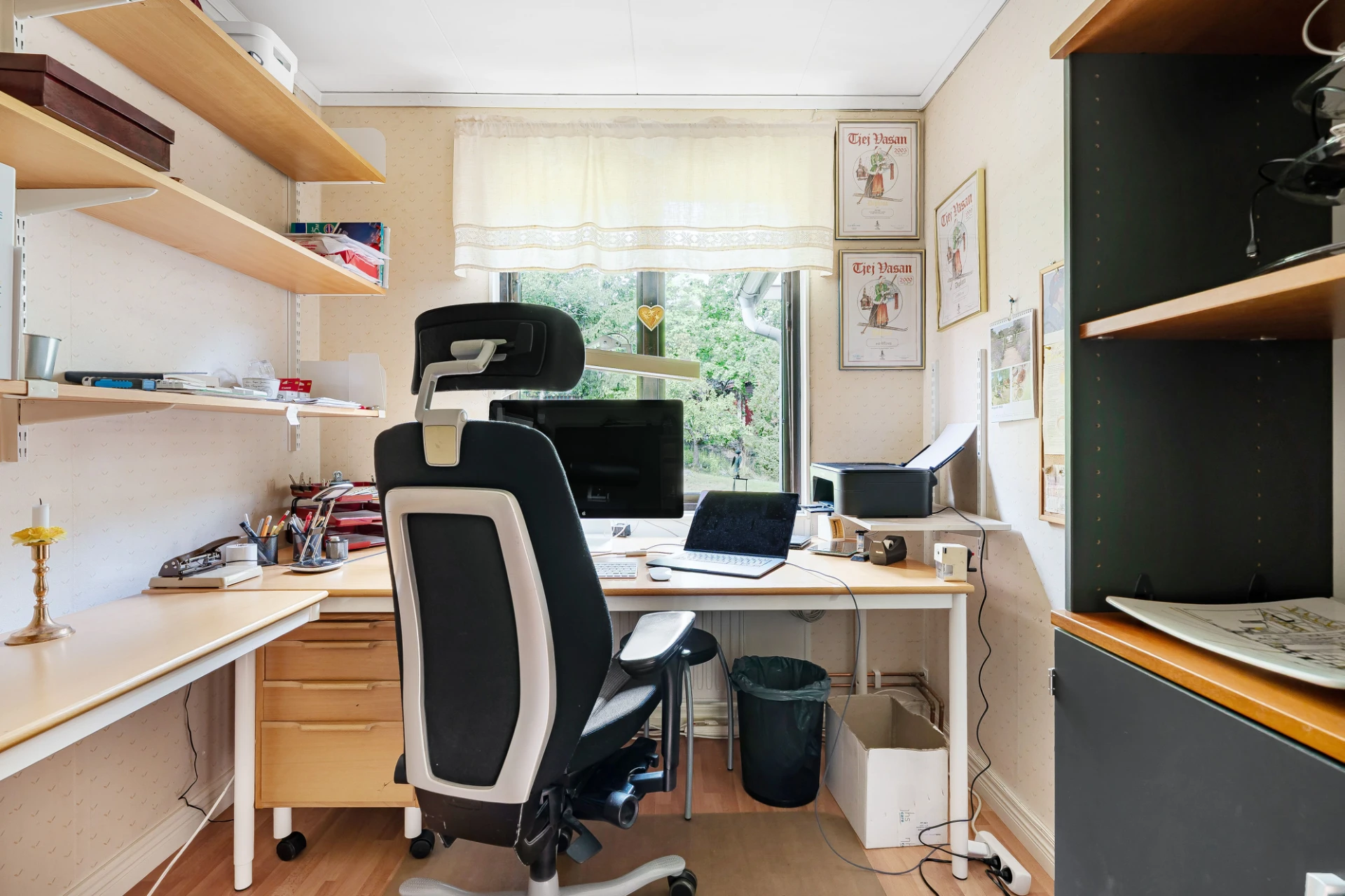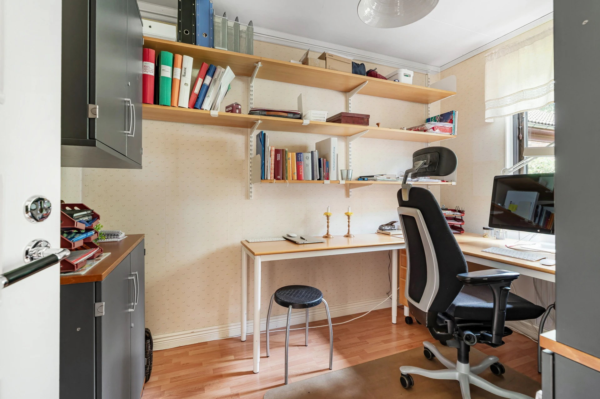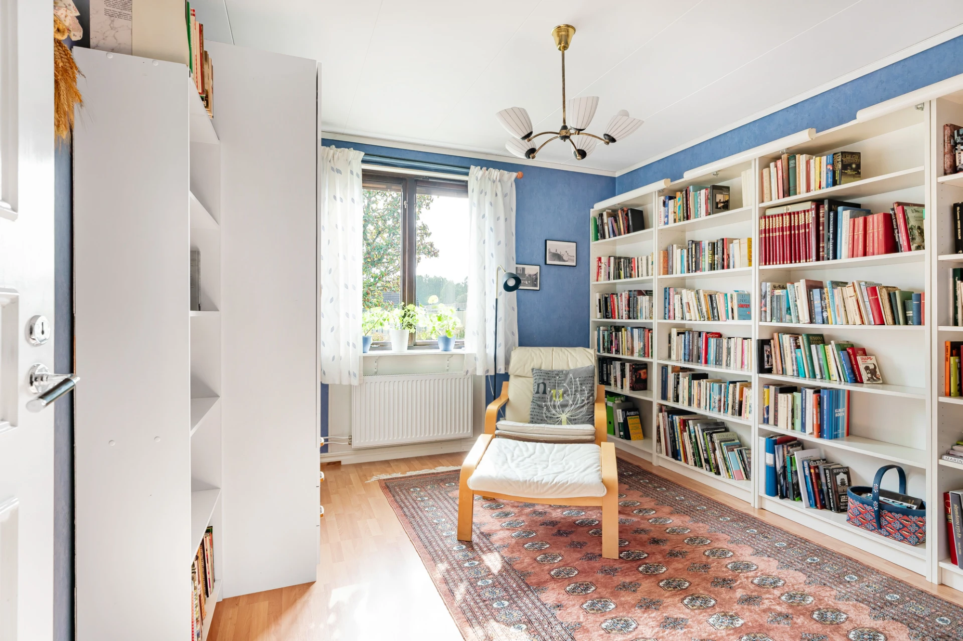 Laminatgolv och tapetserade väggar. Används idag som bibliotek.