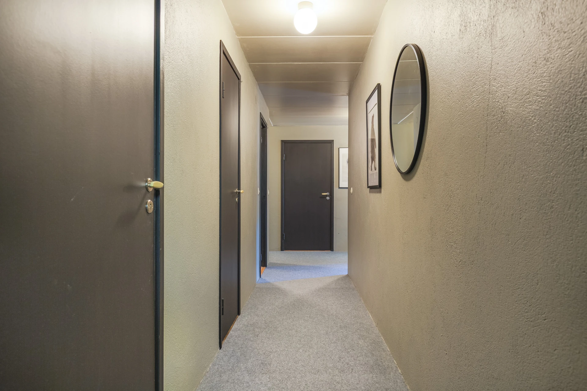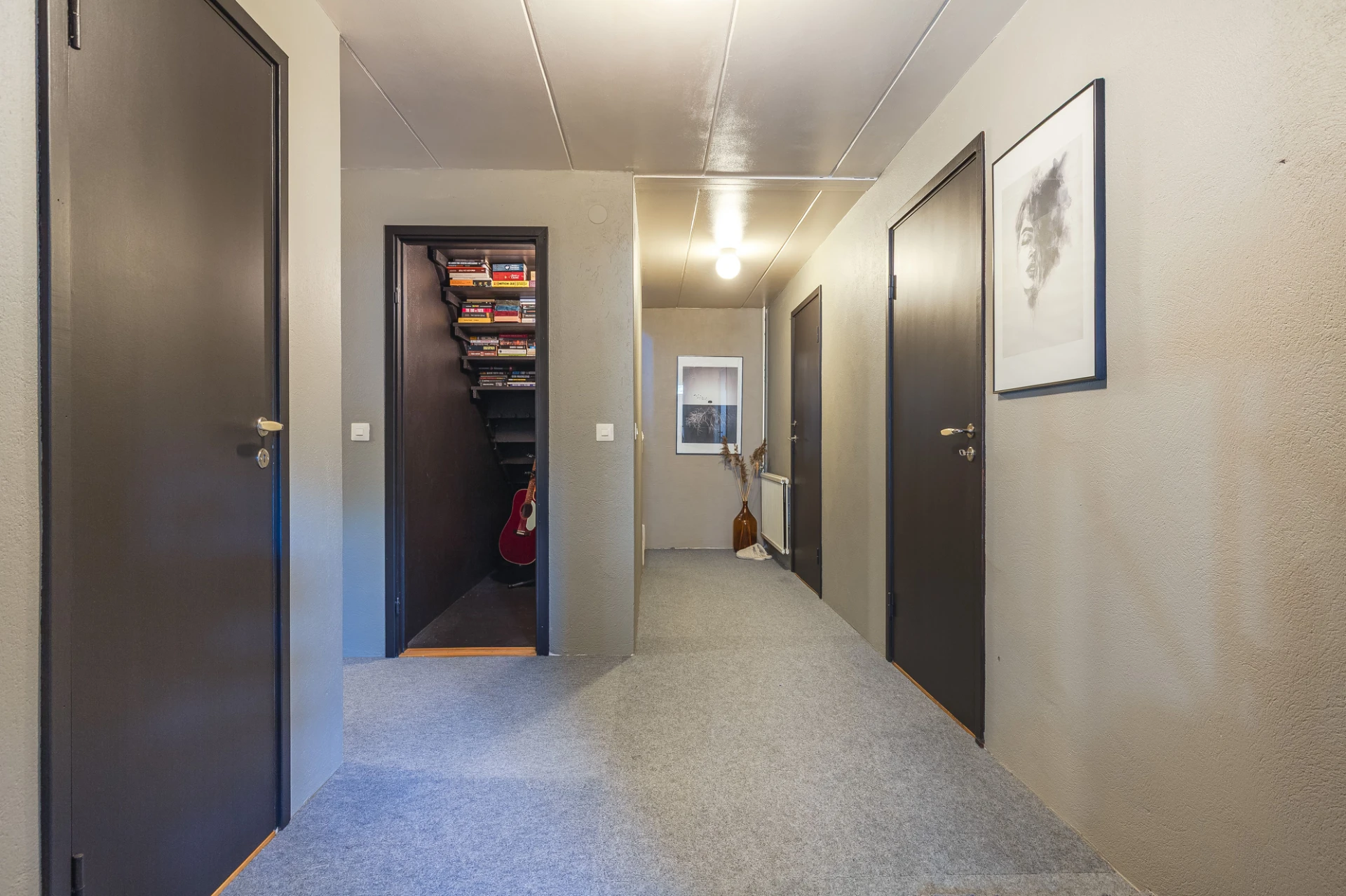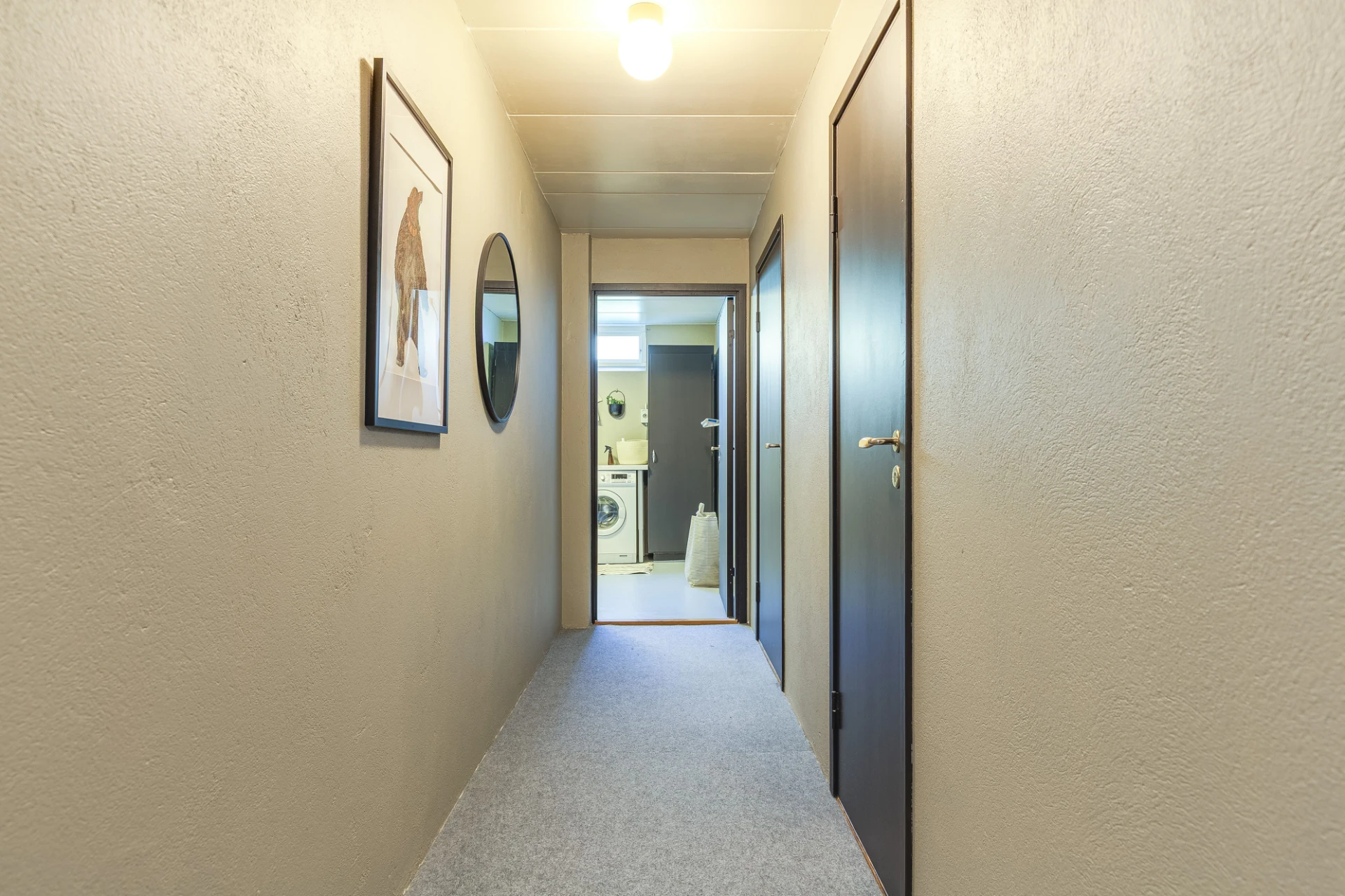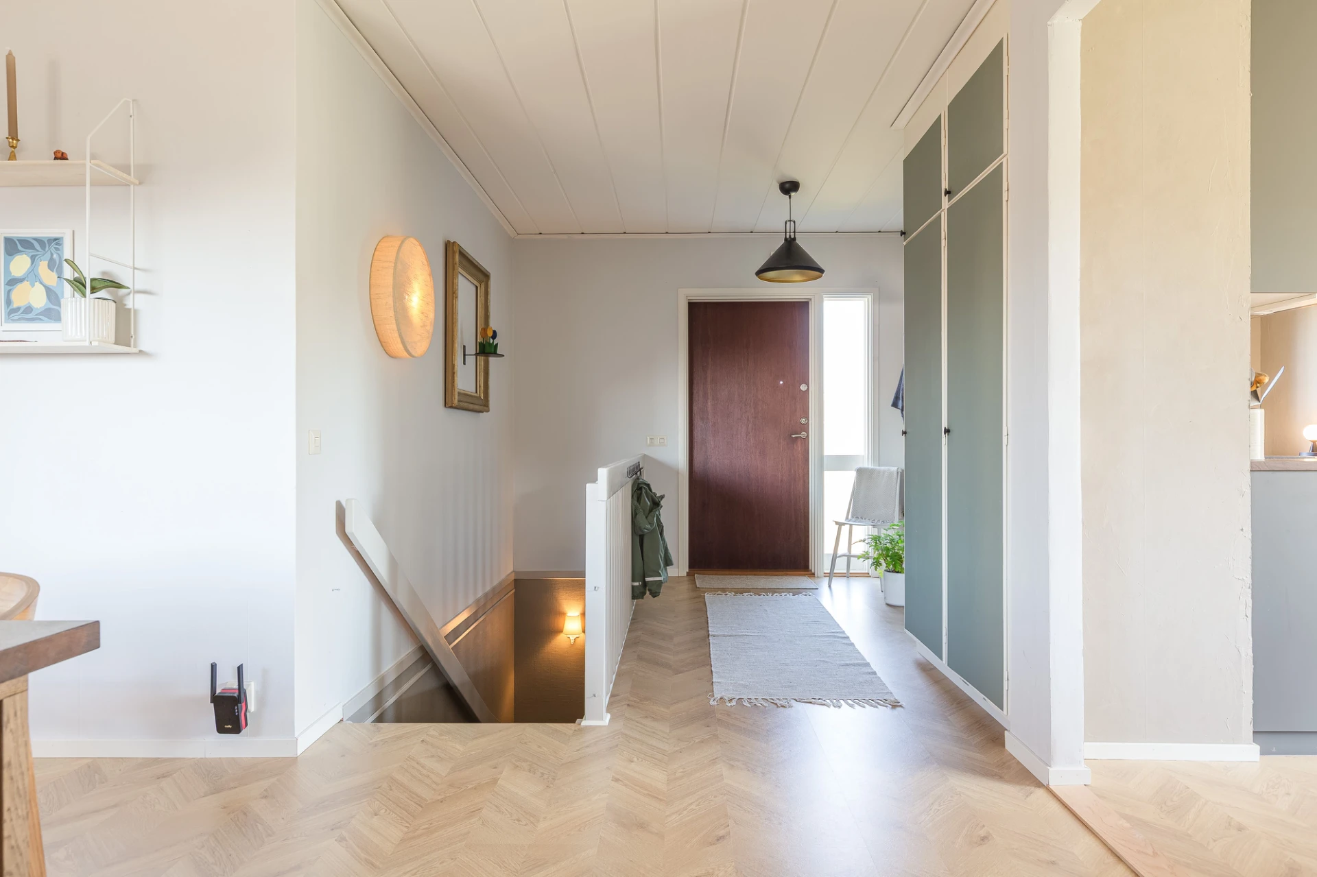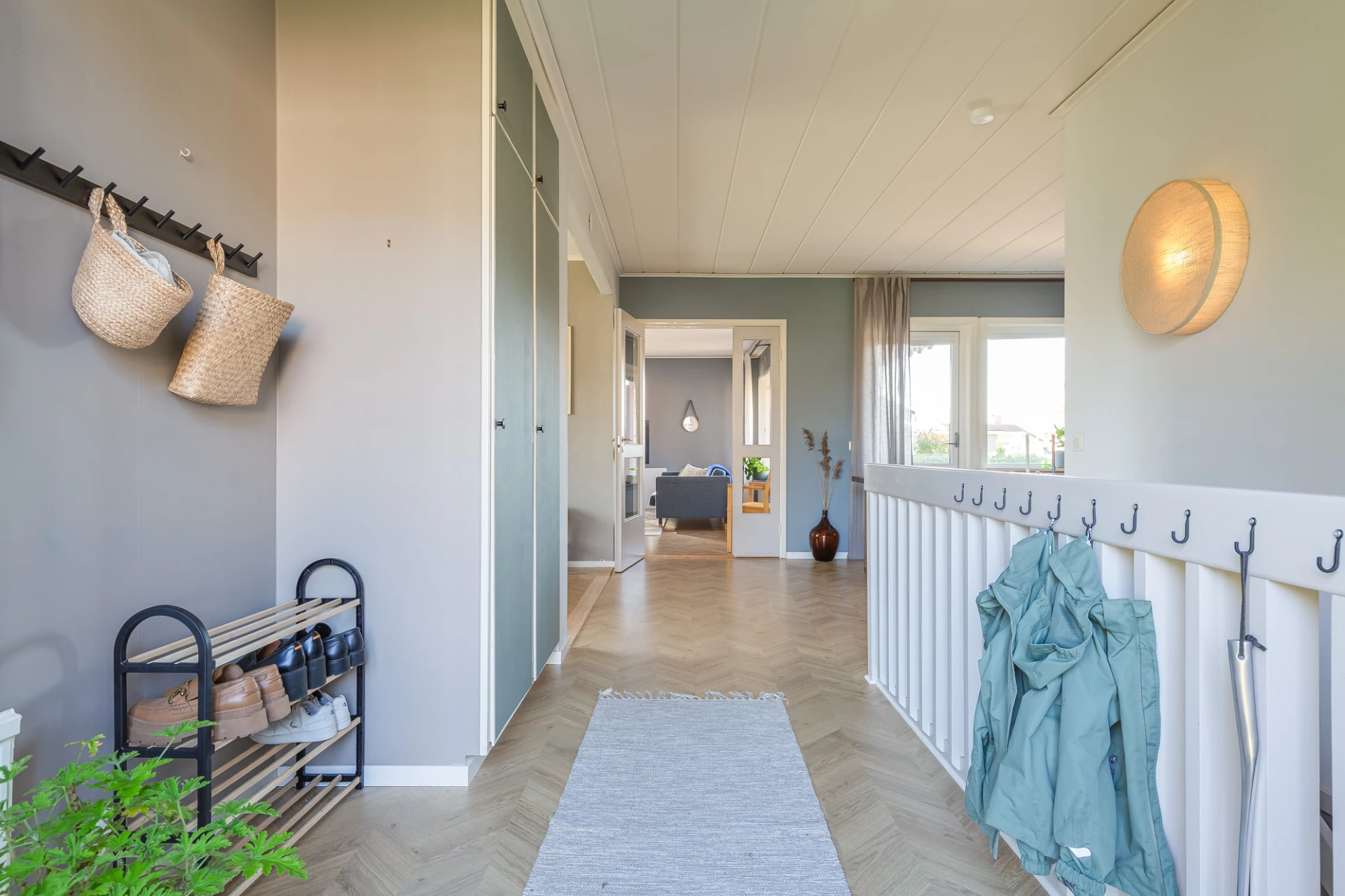 Laminatgolv och ljusgrå väggar. Plats för avhängning samt förvaring i platsbyggda garderober.