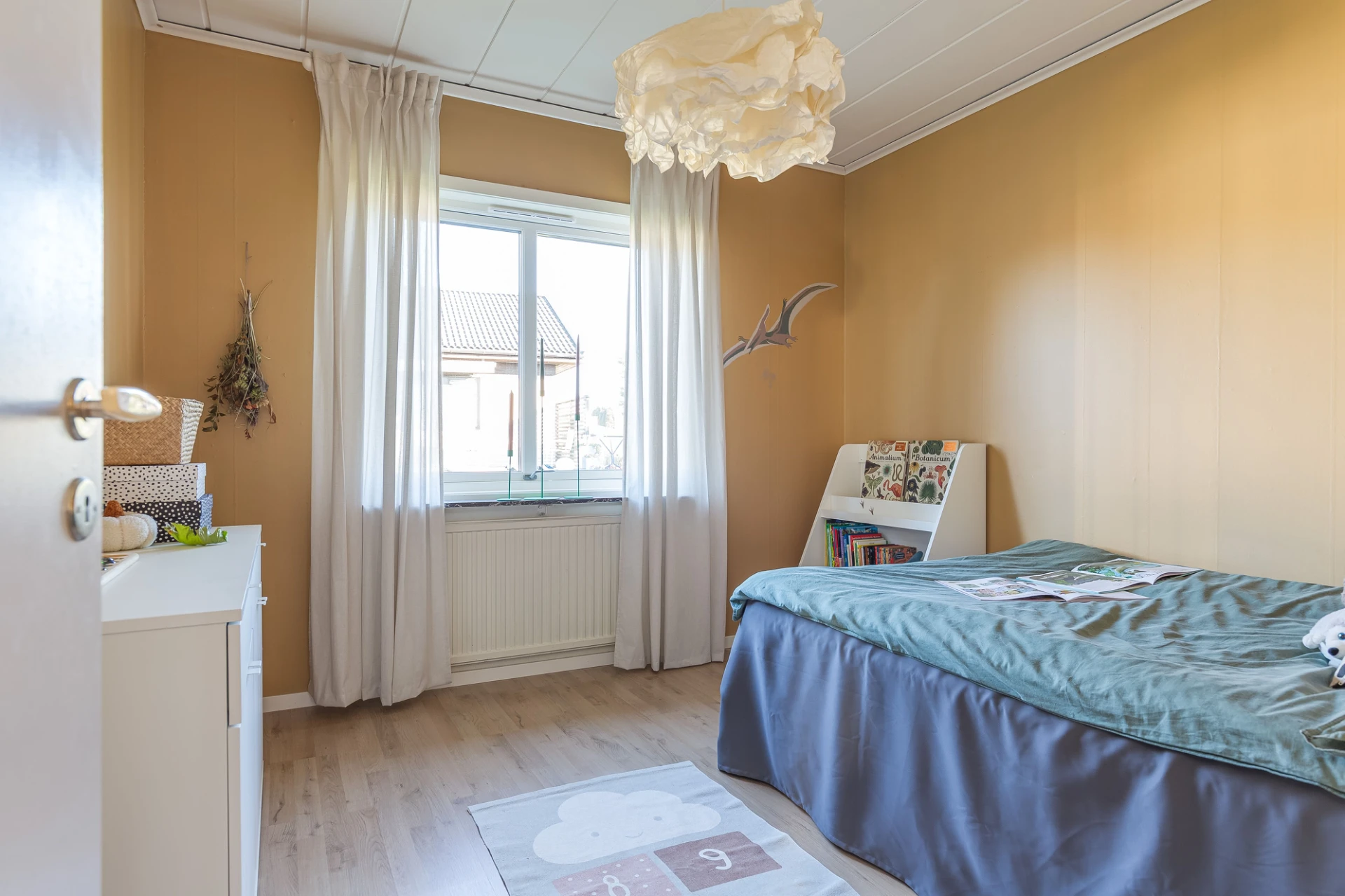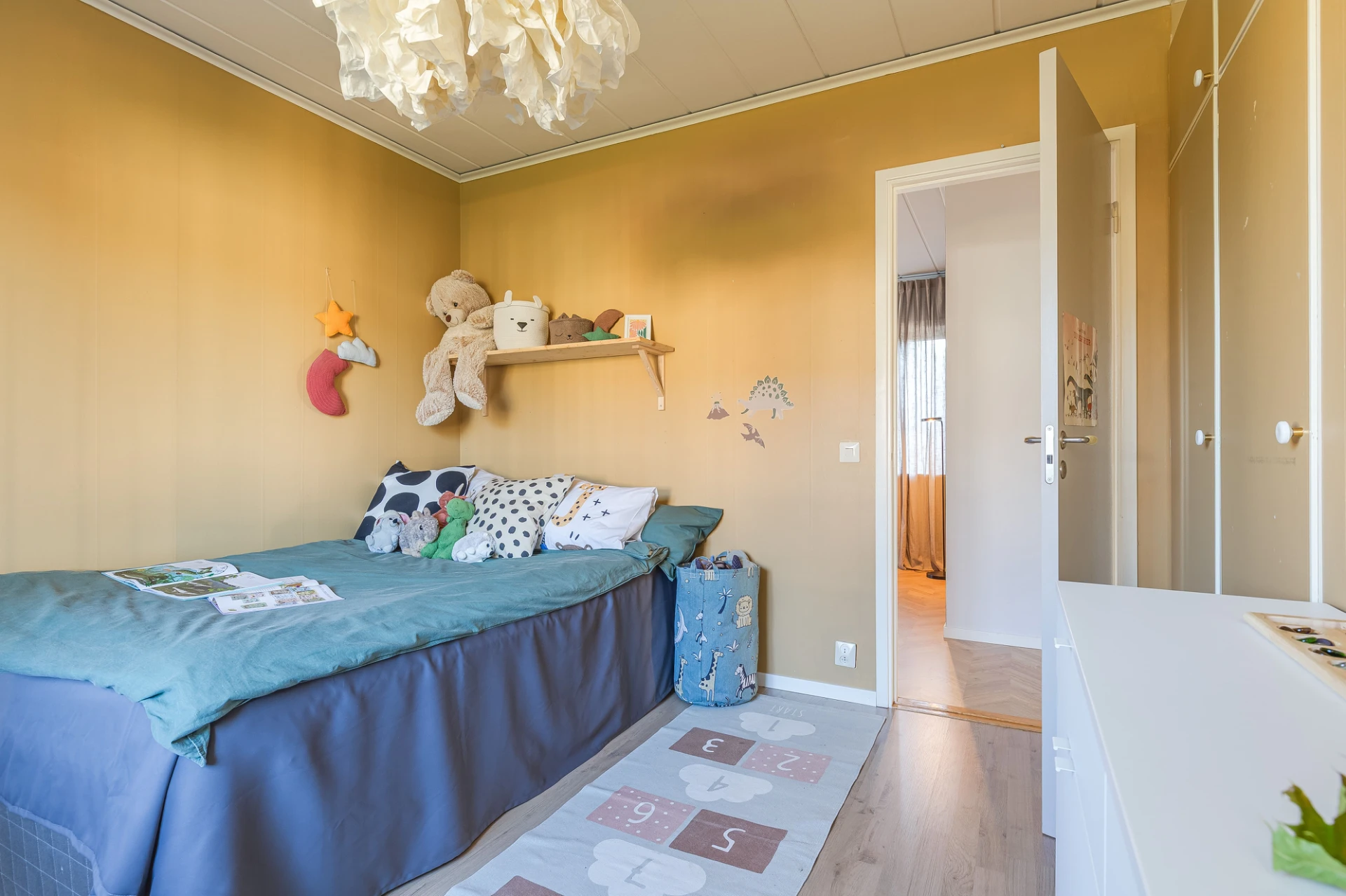 Laminatgolv och gula väggar. Här finns plats för säng med tillhörande möblemang samt skrivbordshörna. Förvaring i platsbyggda garderober.