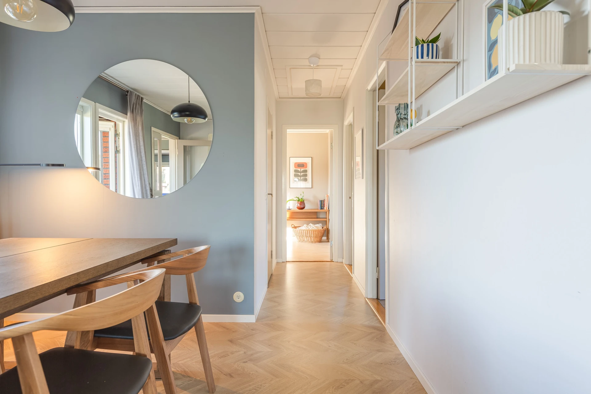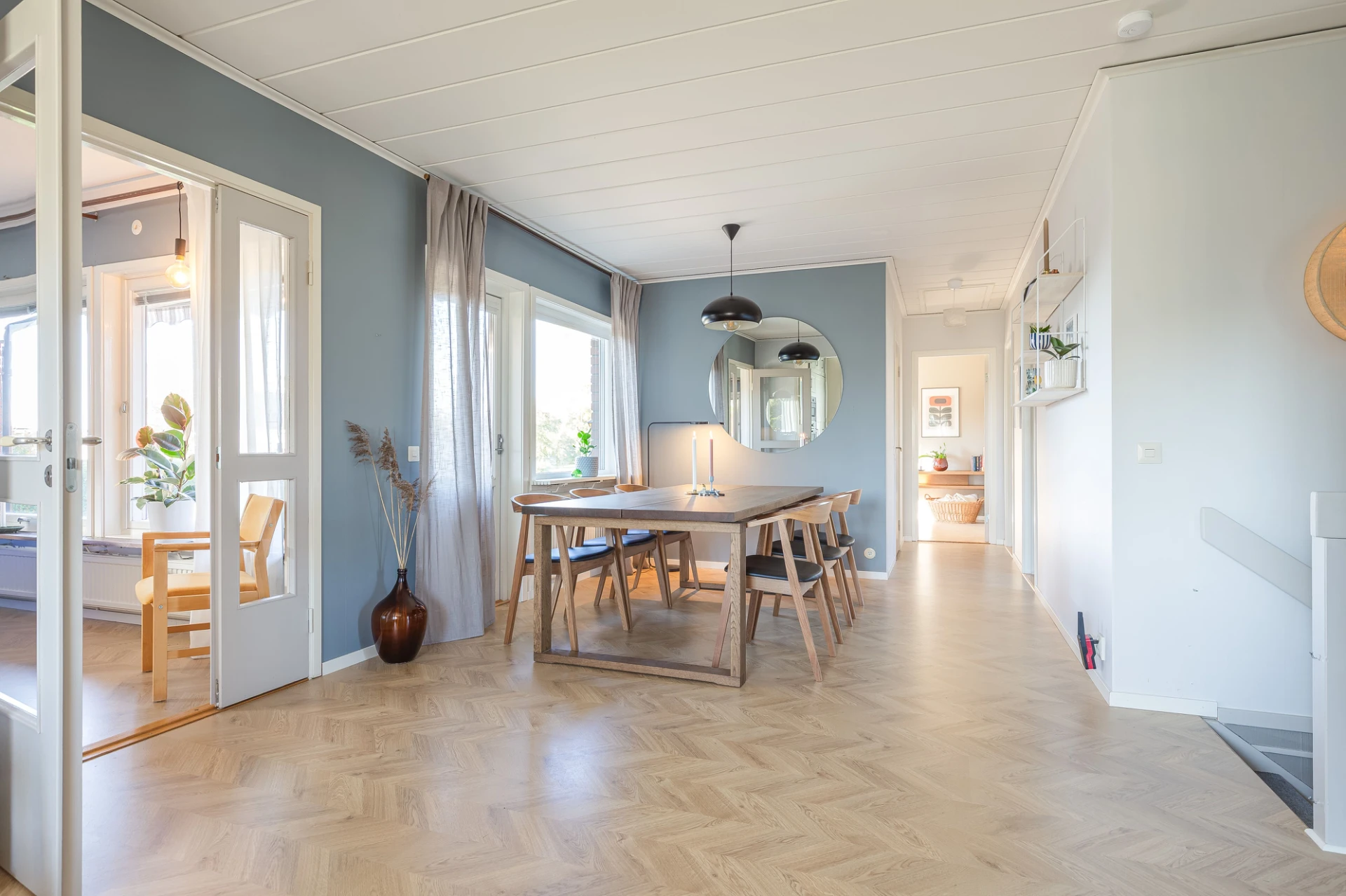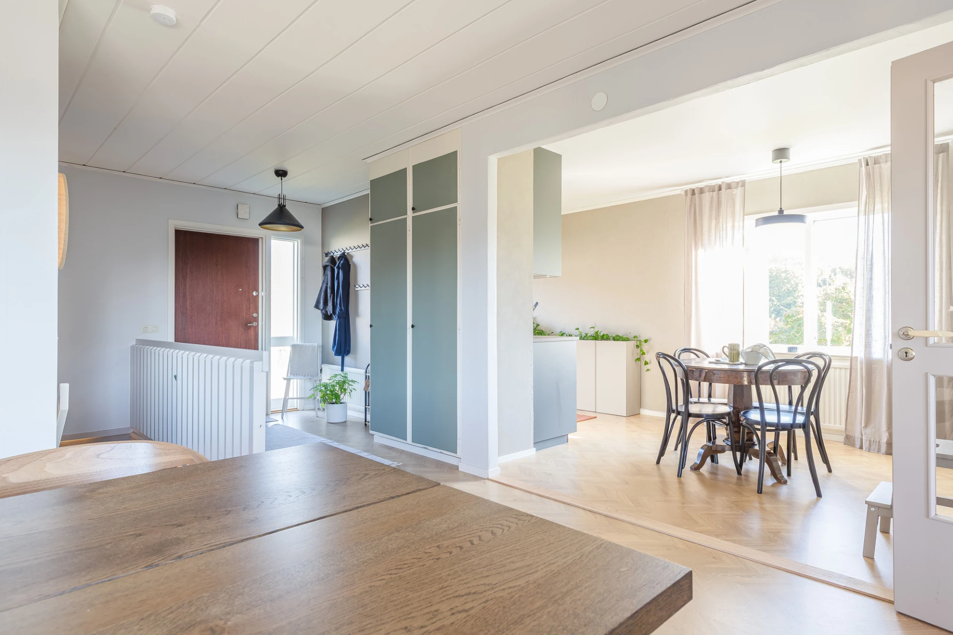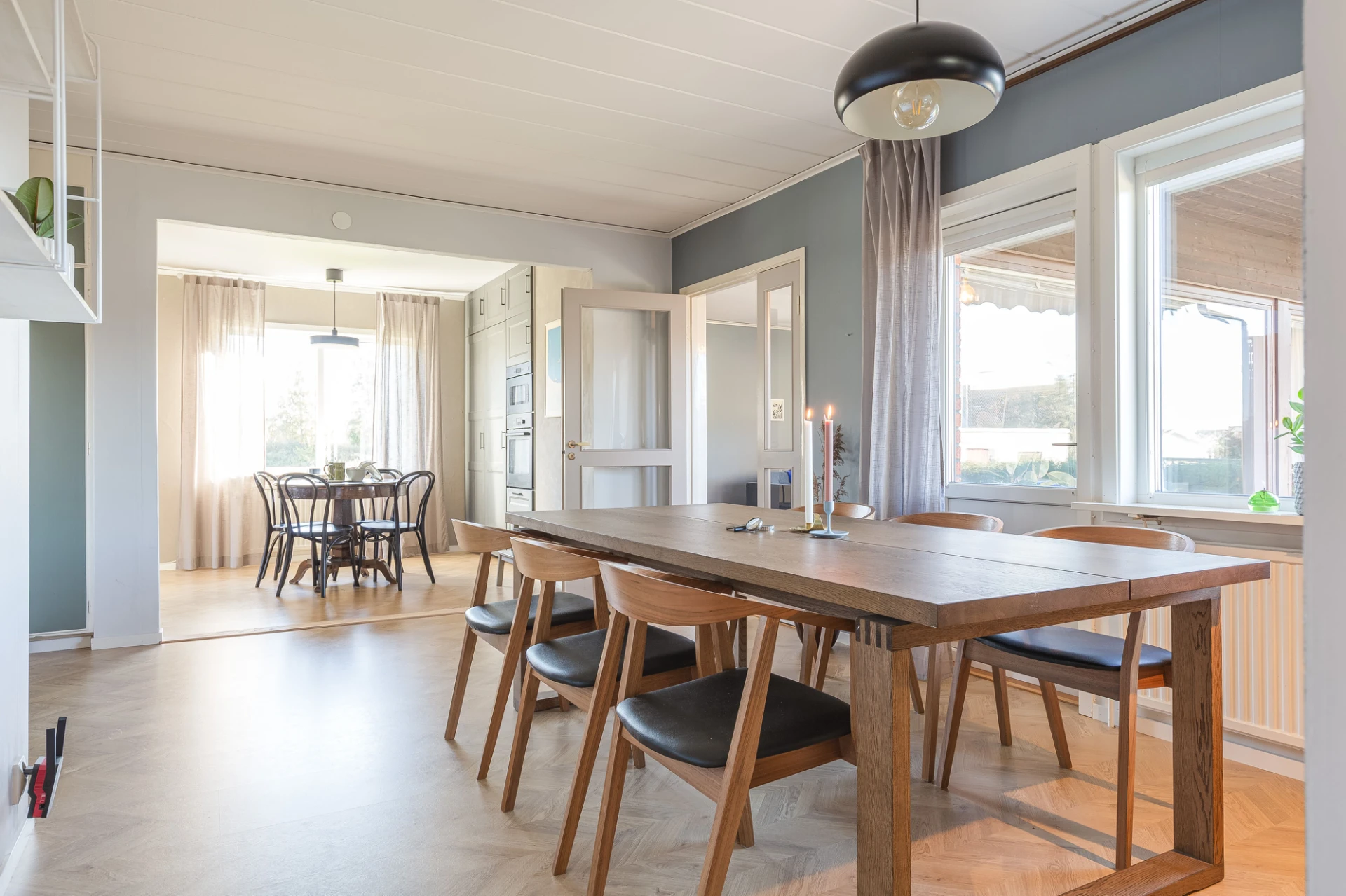 Laminatgolv och blå väggar. Här finns plats för större matbord. Från matrummet nås bostaden soliga altan i söderläge.