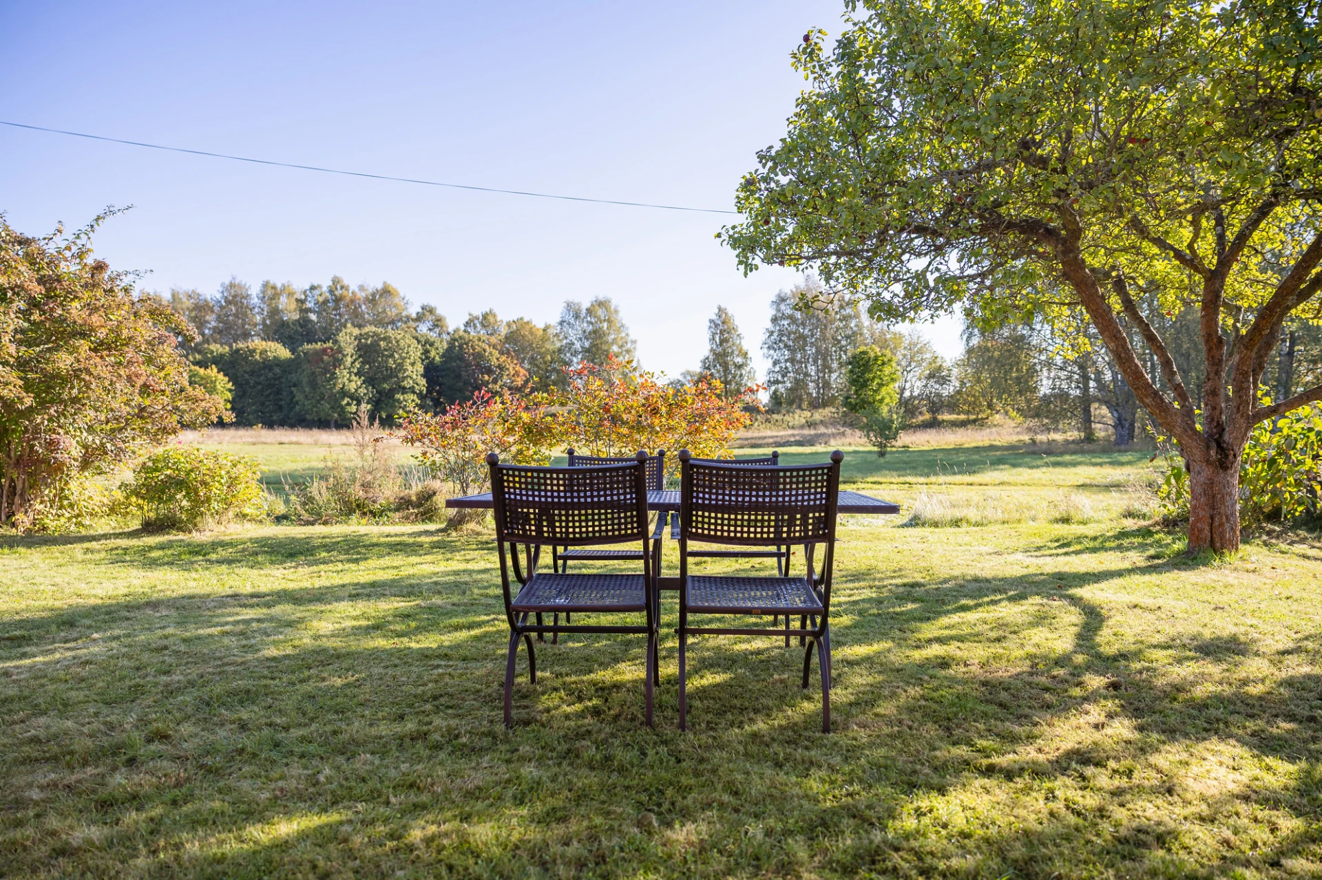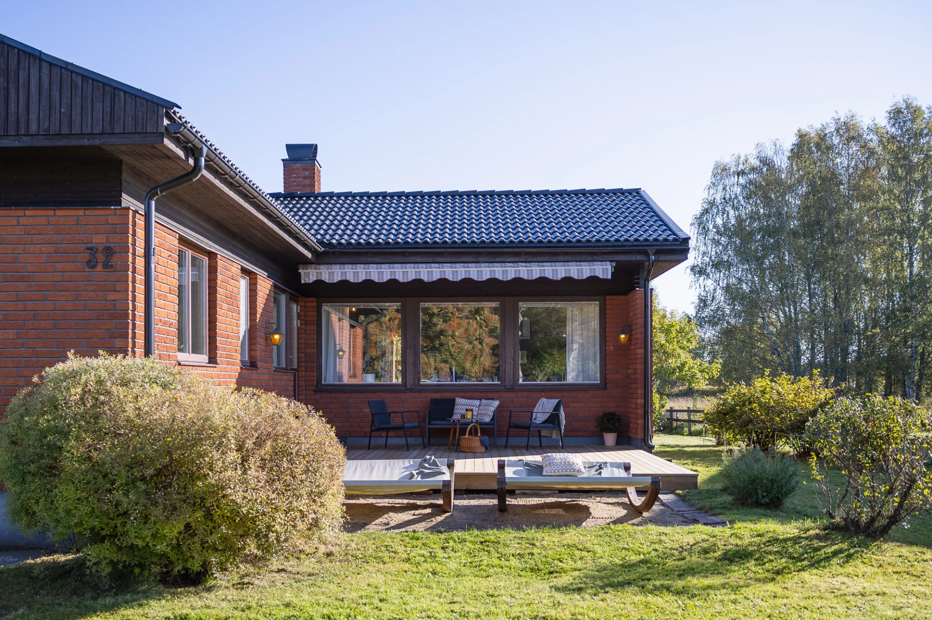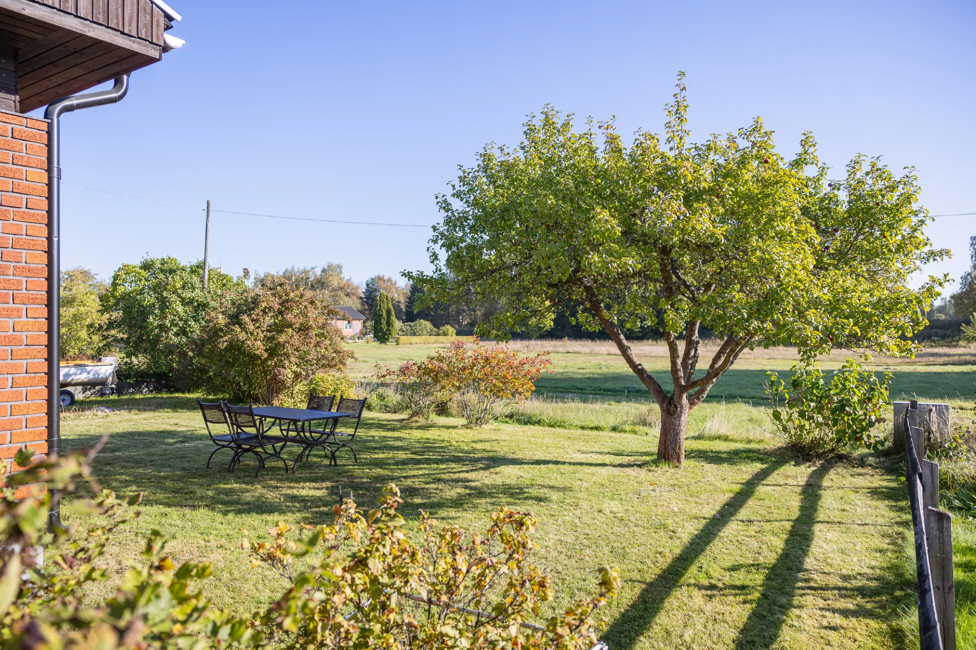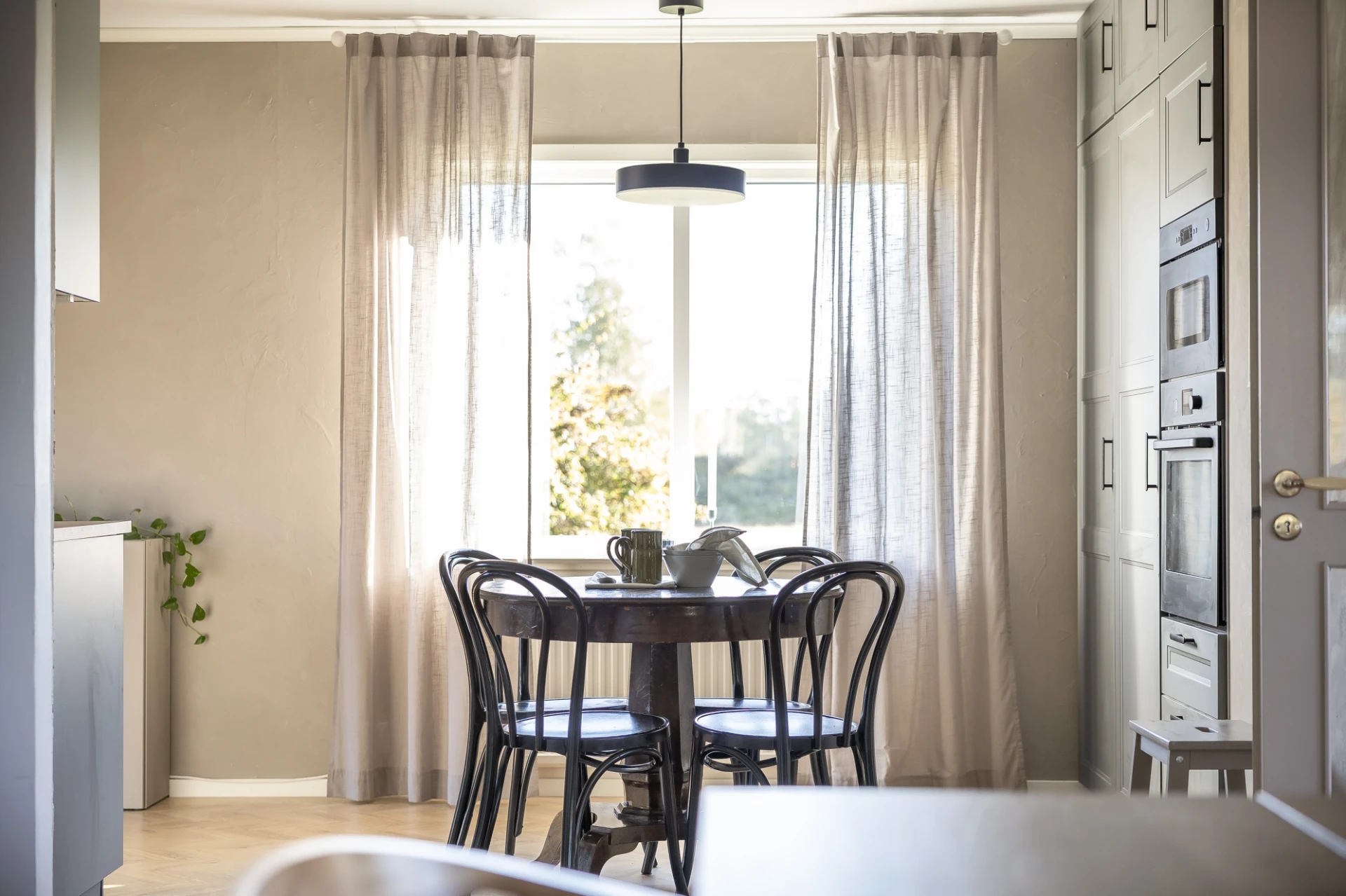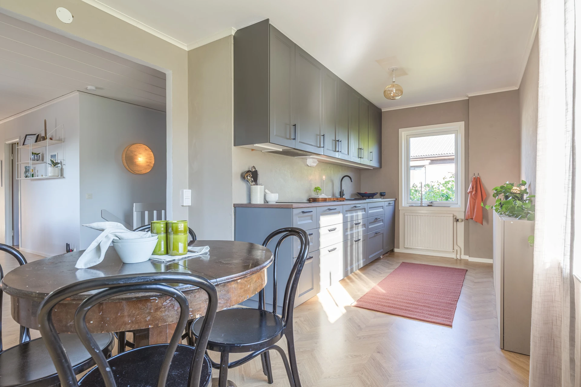 Laminatgolv och blå väggar. Här finns plats för större matbord. Från matrummet nås bostaden soliga altan i söderläge.