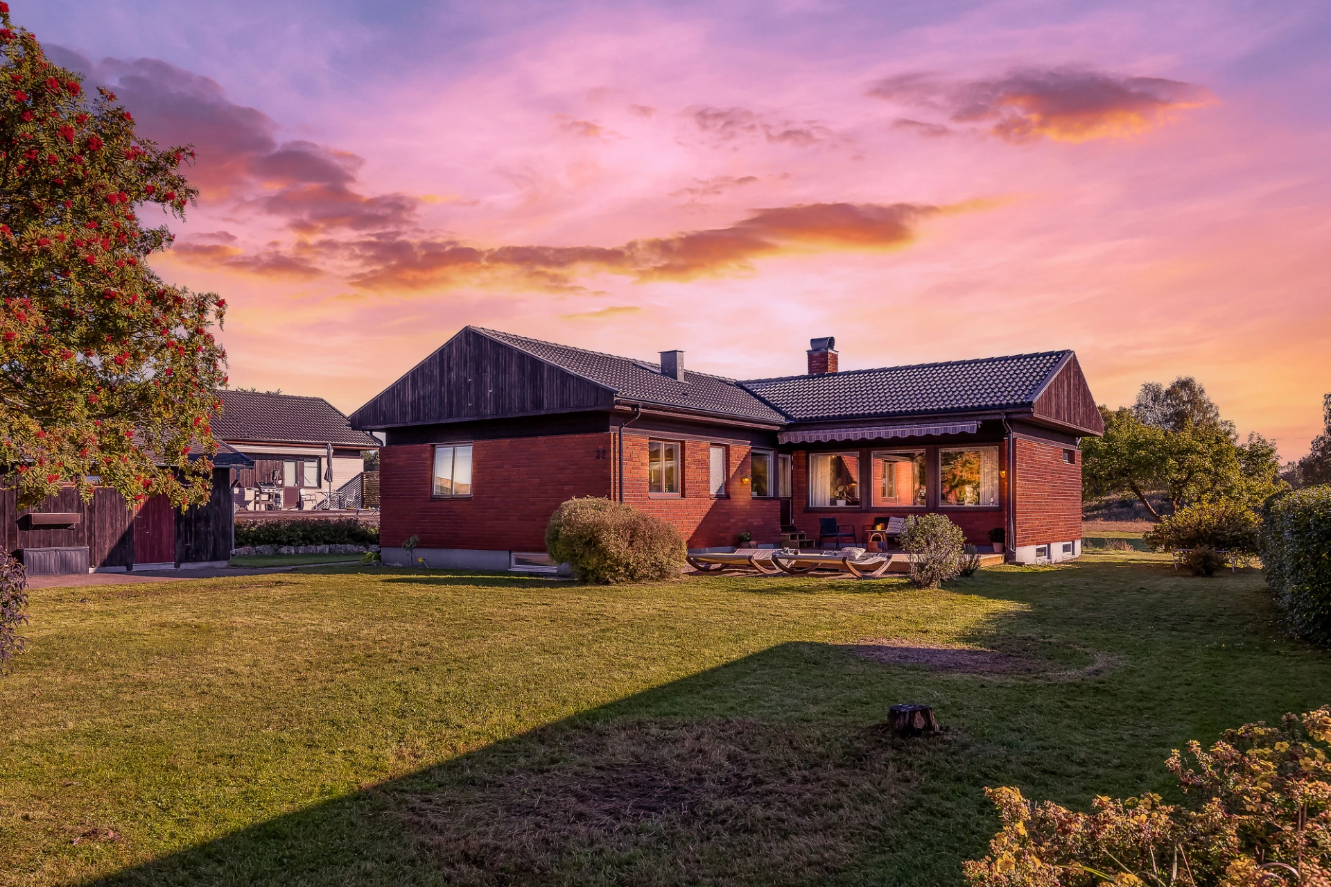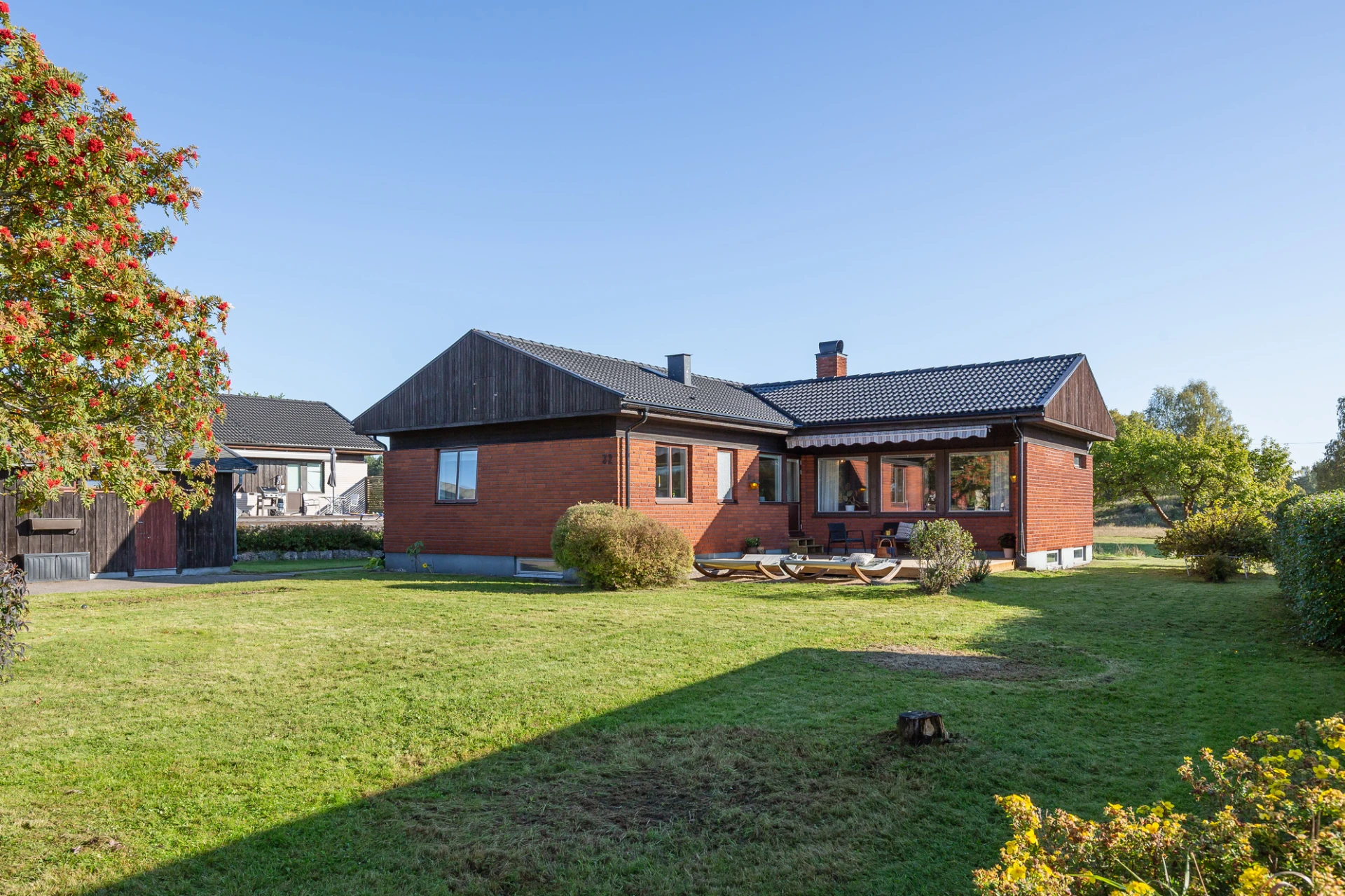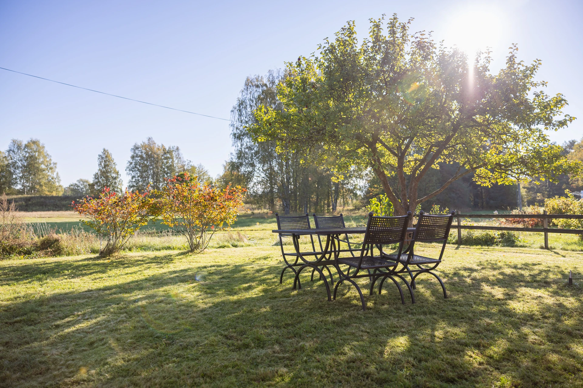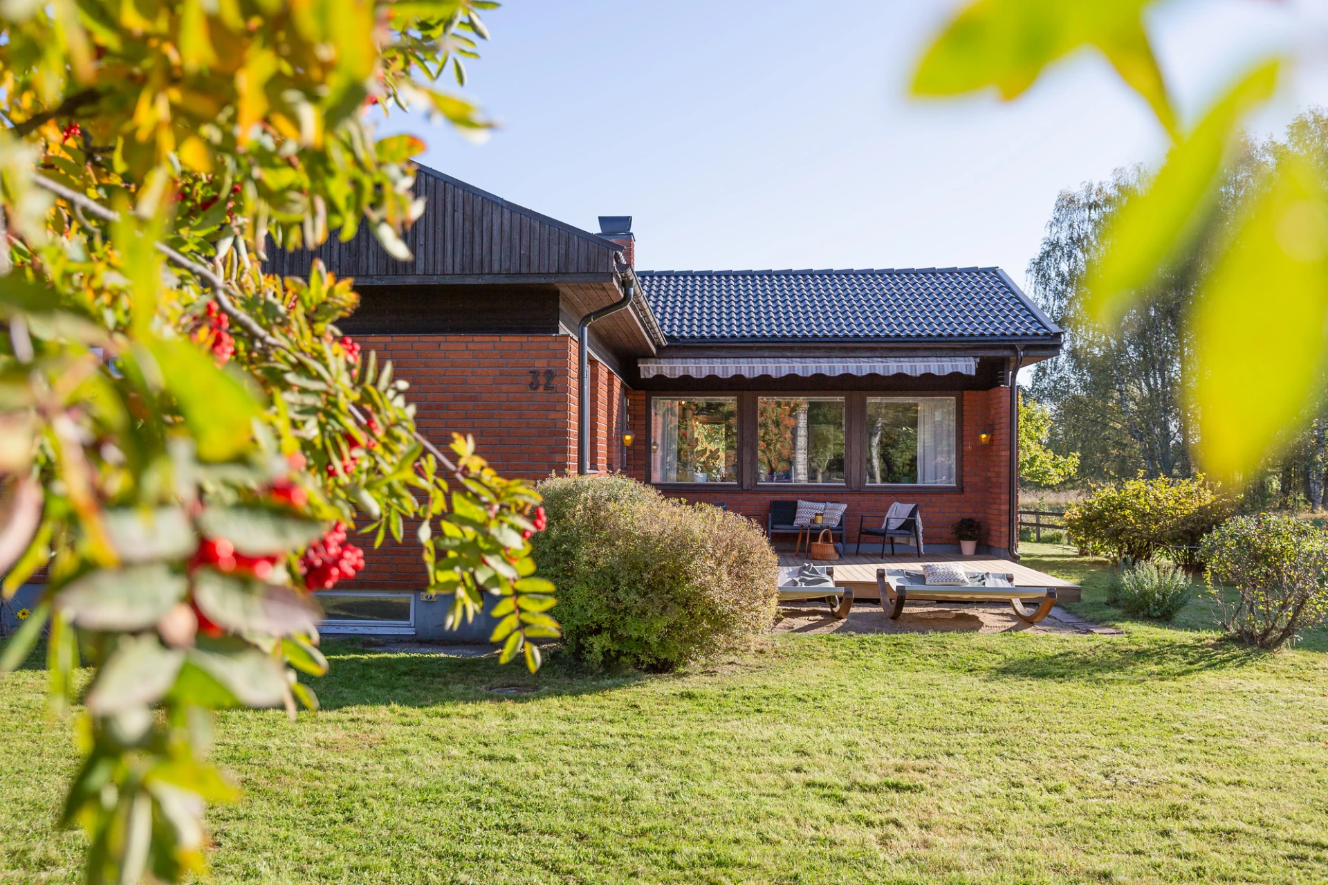Laminatgolv och blå väggar. Här finns plats för större matbord. Från matrummet nås bostaden soliga altan i söderläge.