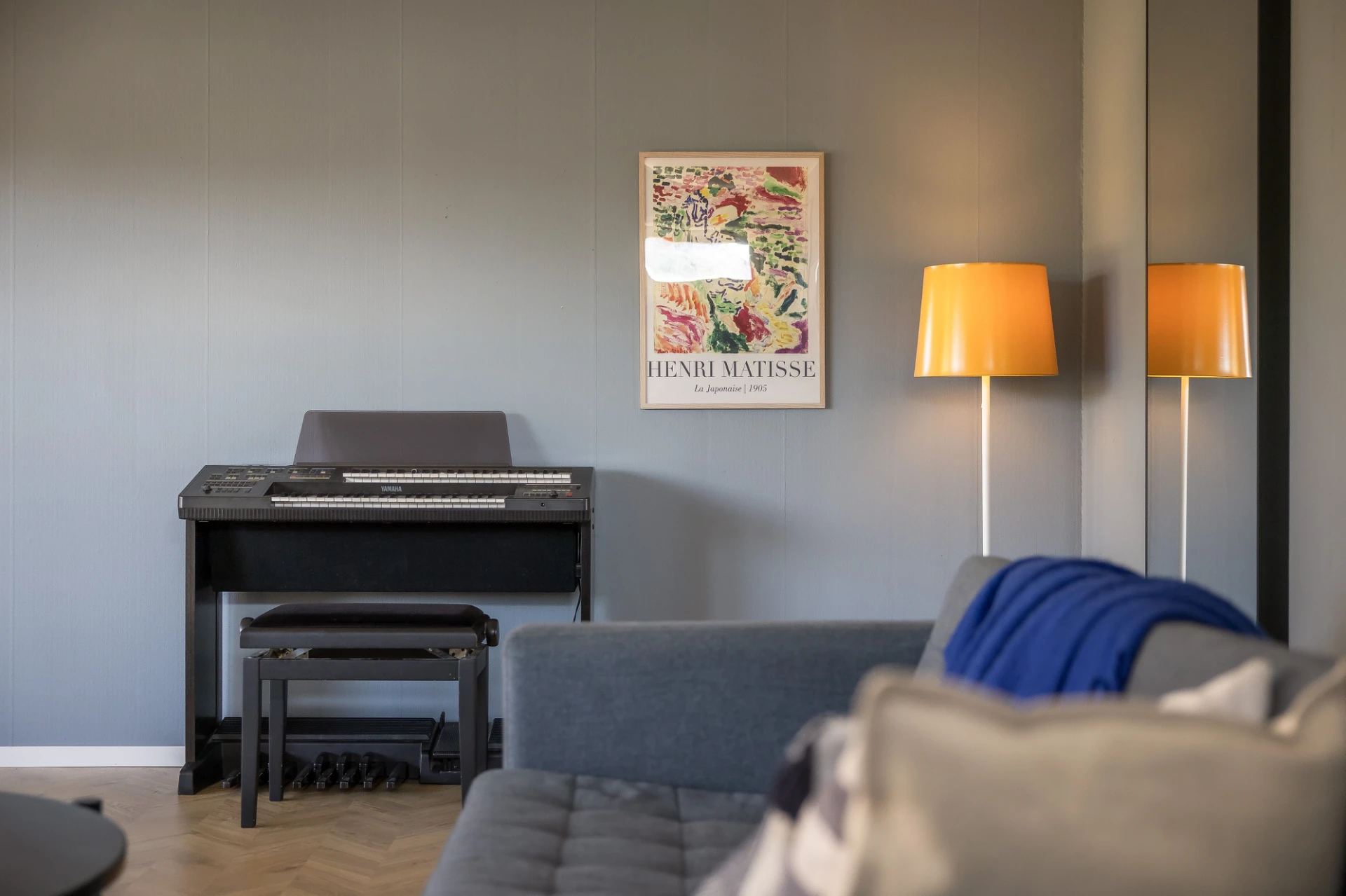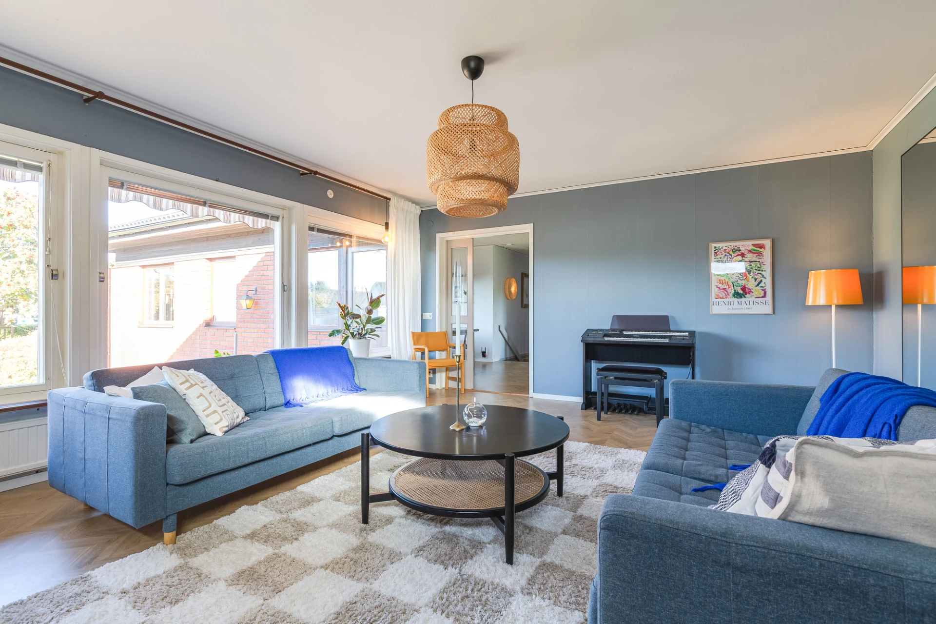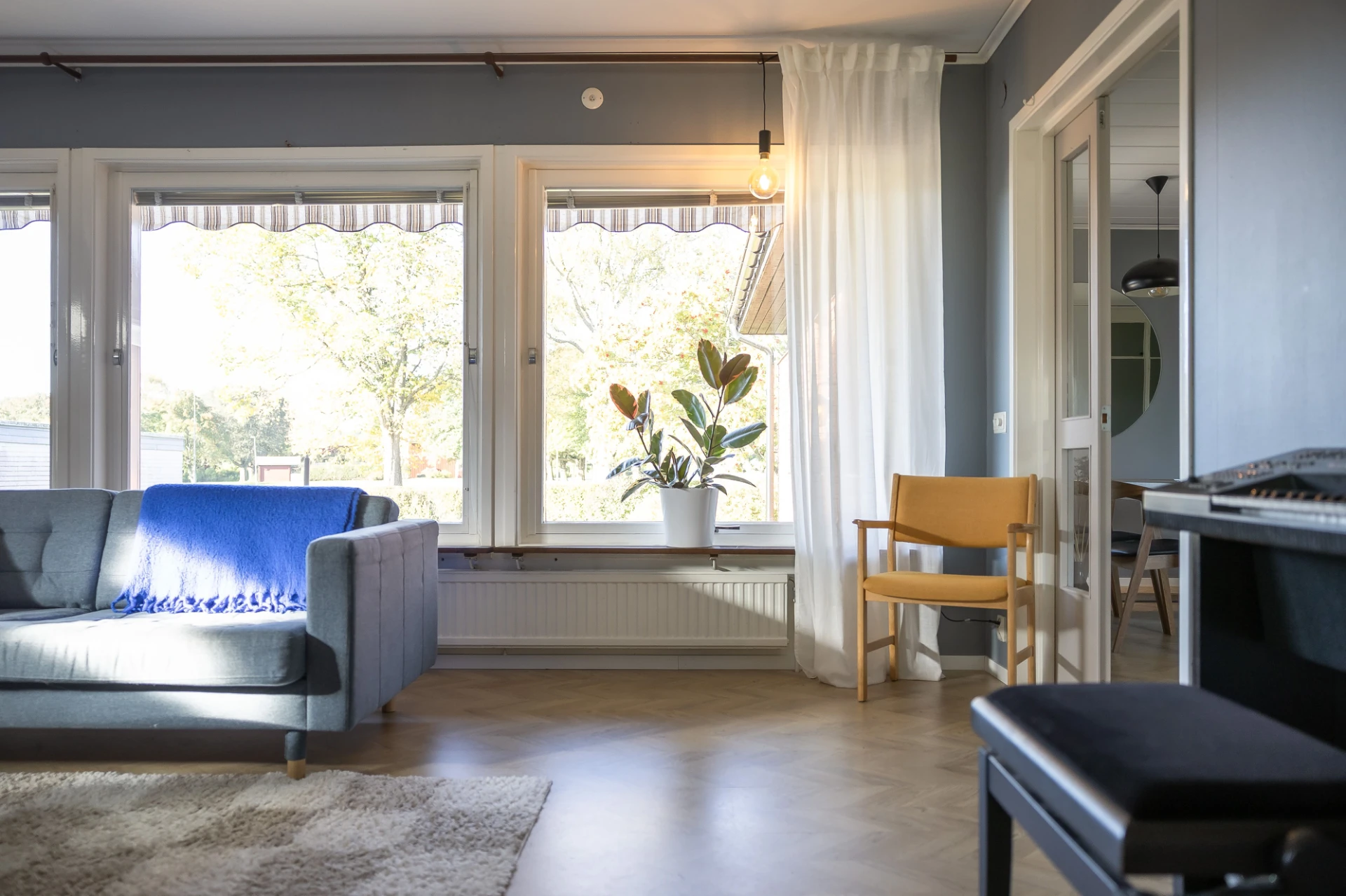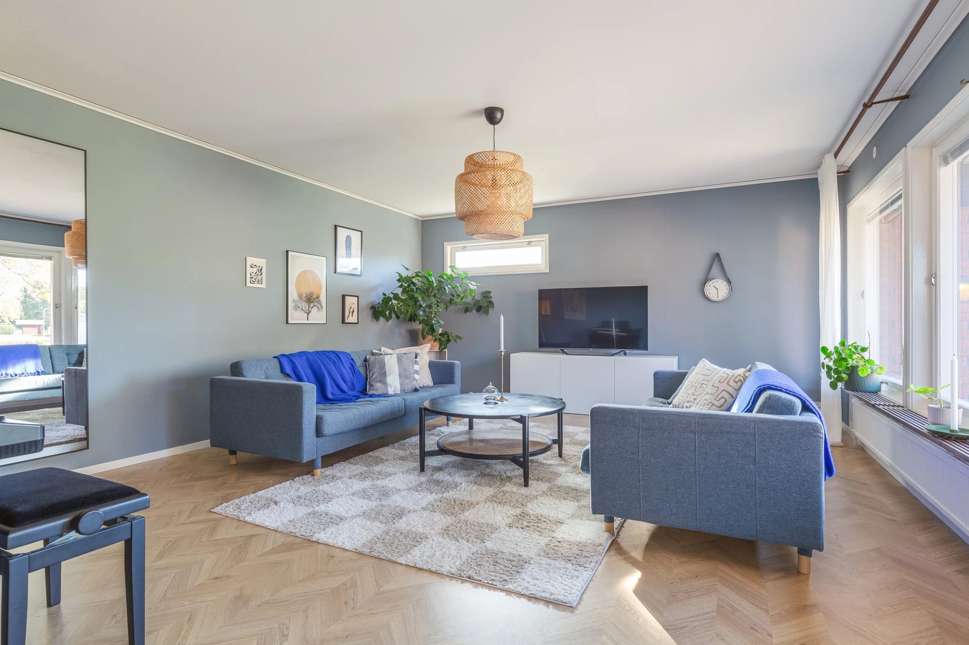 Laminatgolv och blå väggar. Här finns plats för soffa med tillhörande möblemang.