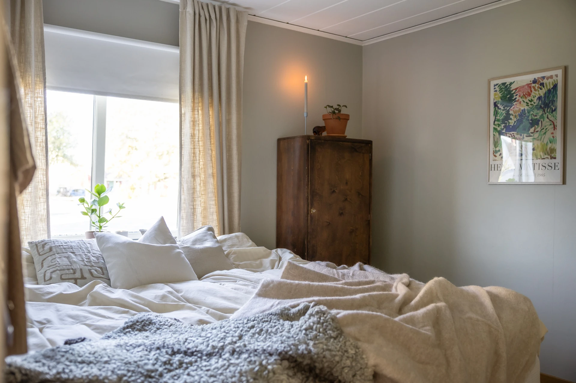 Laminatgolv och grön/gråa väggar. Här finns plats för säng med tillhörande möblemang. Förvaring i platsbyggda garderober.