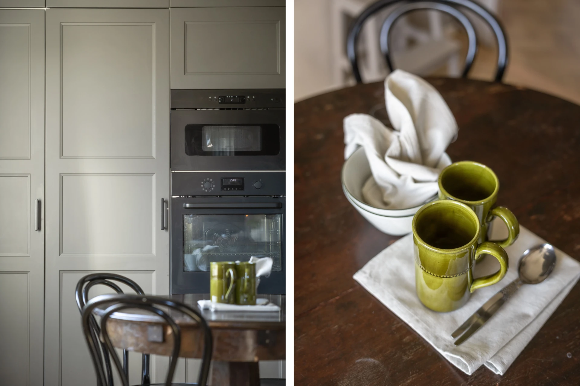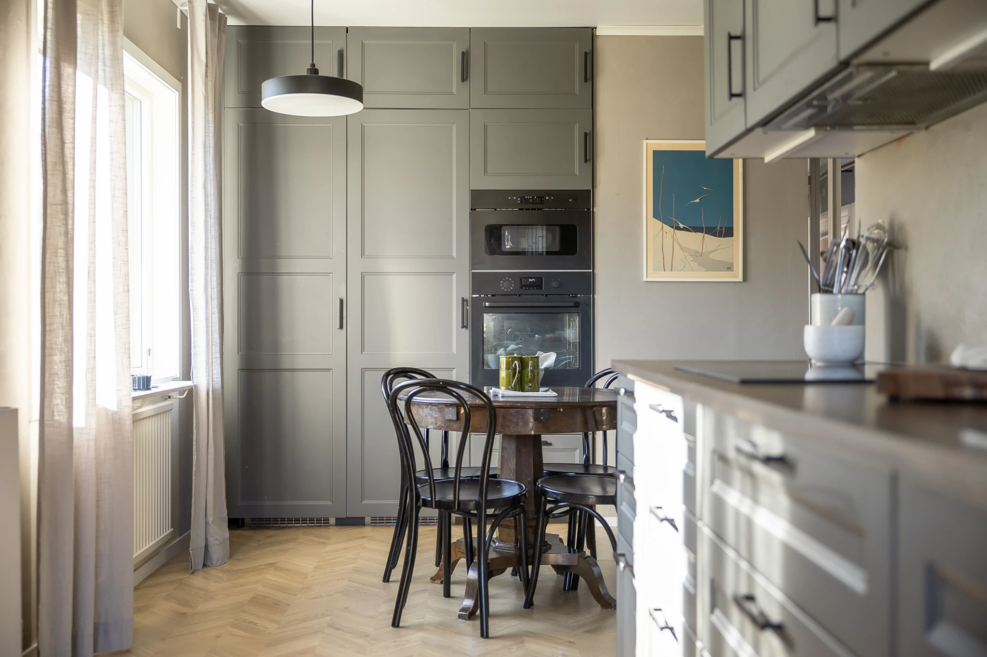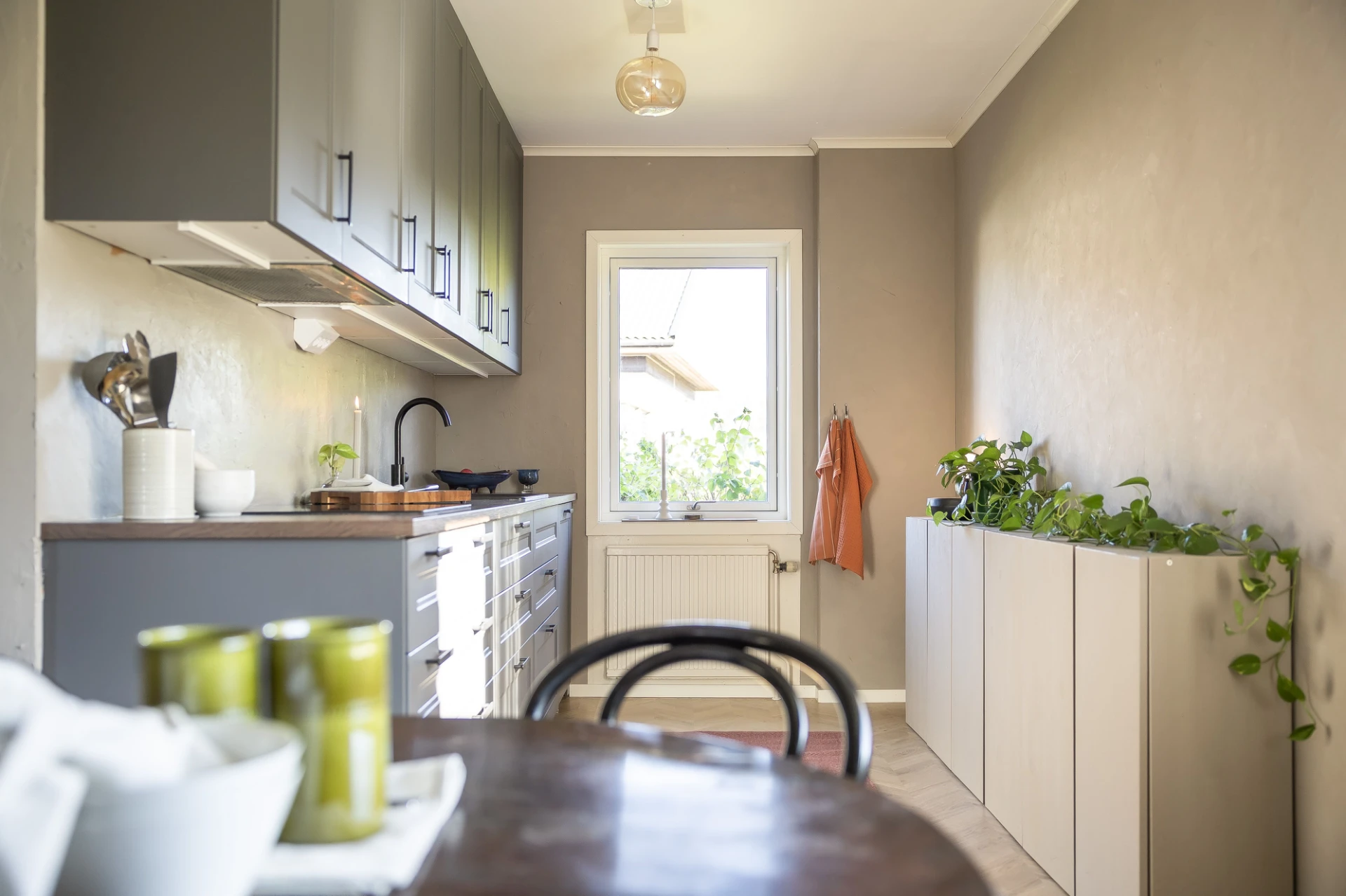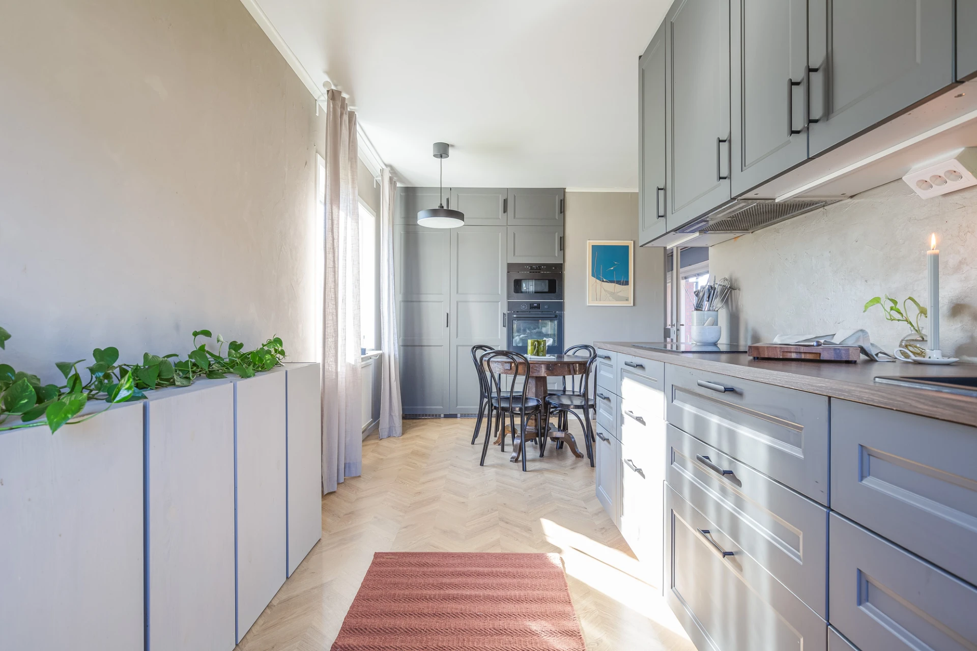 Laminatgolv och beiga väggar. Den maskinella utrustningen består av spishäll, spisfläkt, inbyggd ugn, inbyggd mikrovågsugn, integrerad diskmaskin samt kyl och frys. Matplats. Renoverat 2023-2024.