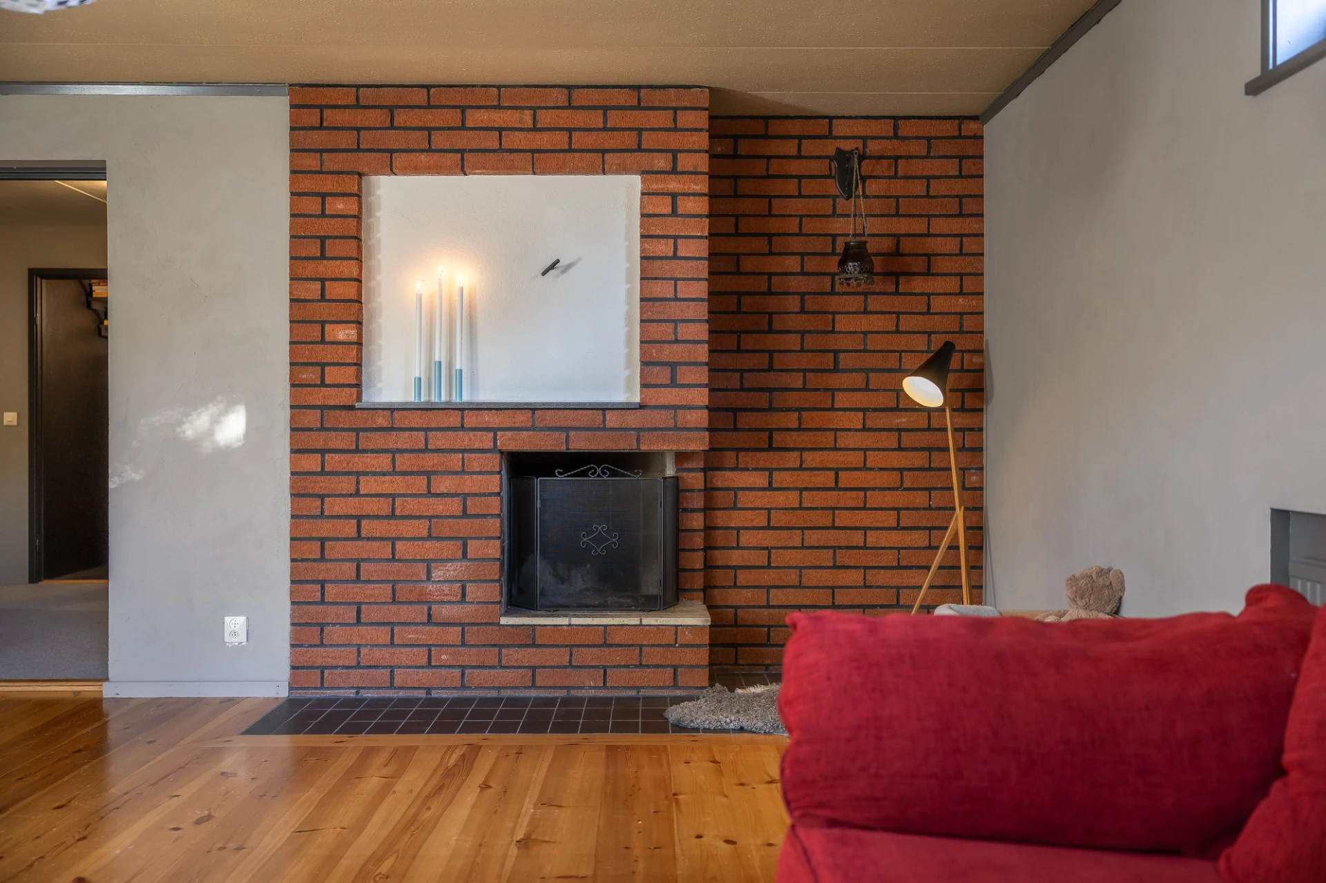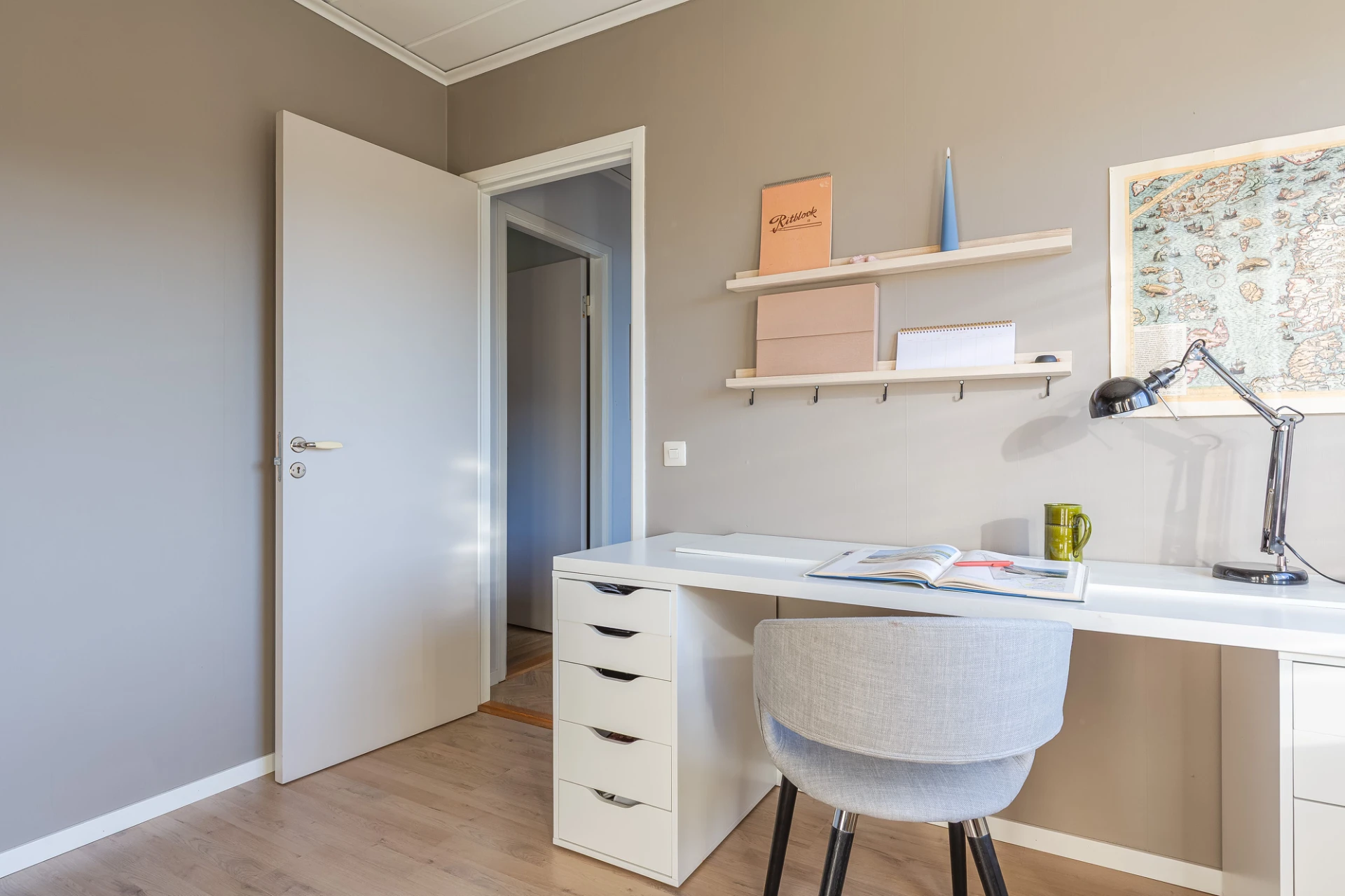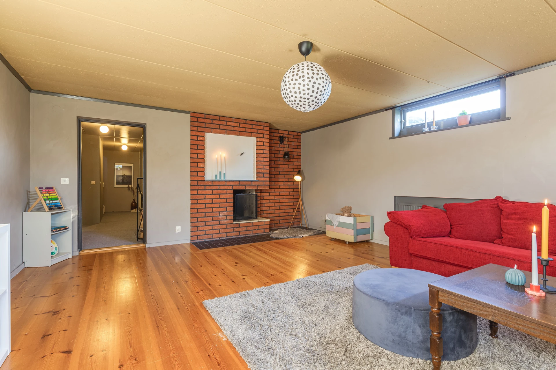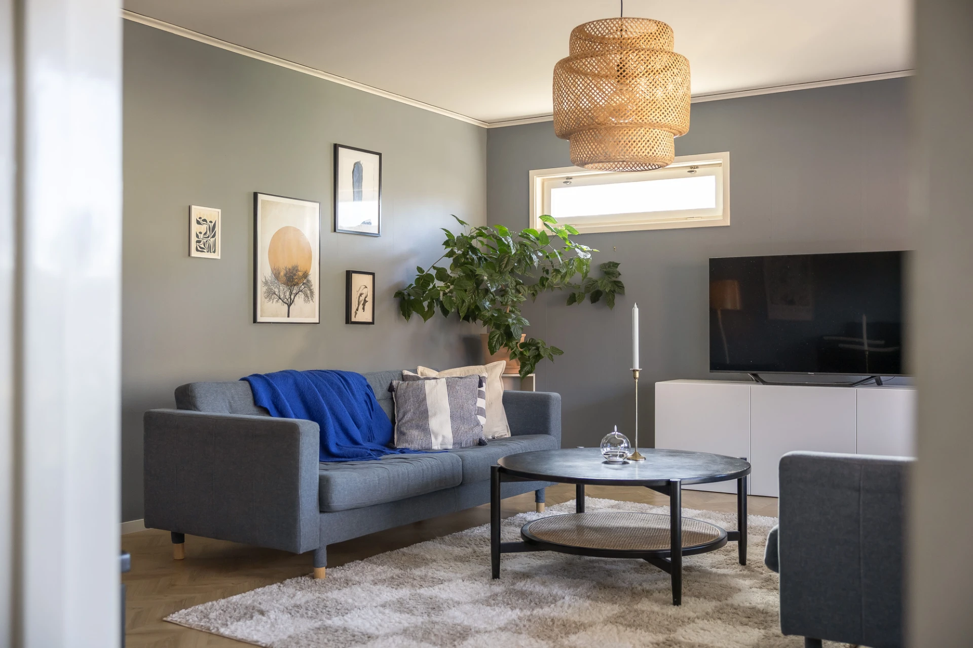 Trägolv och grå väggar. Här finns plats för soffa med tillhörande möblemang.