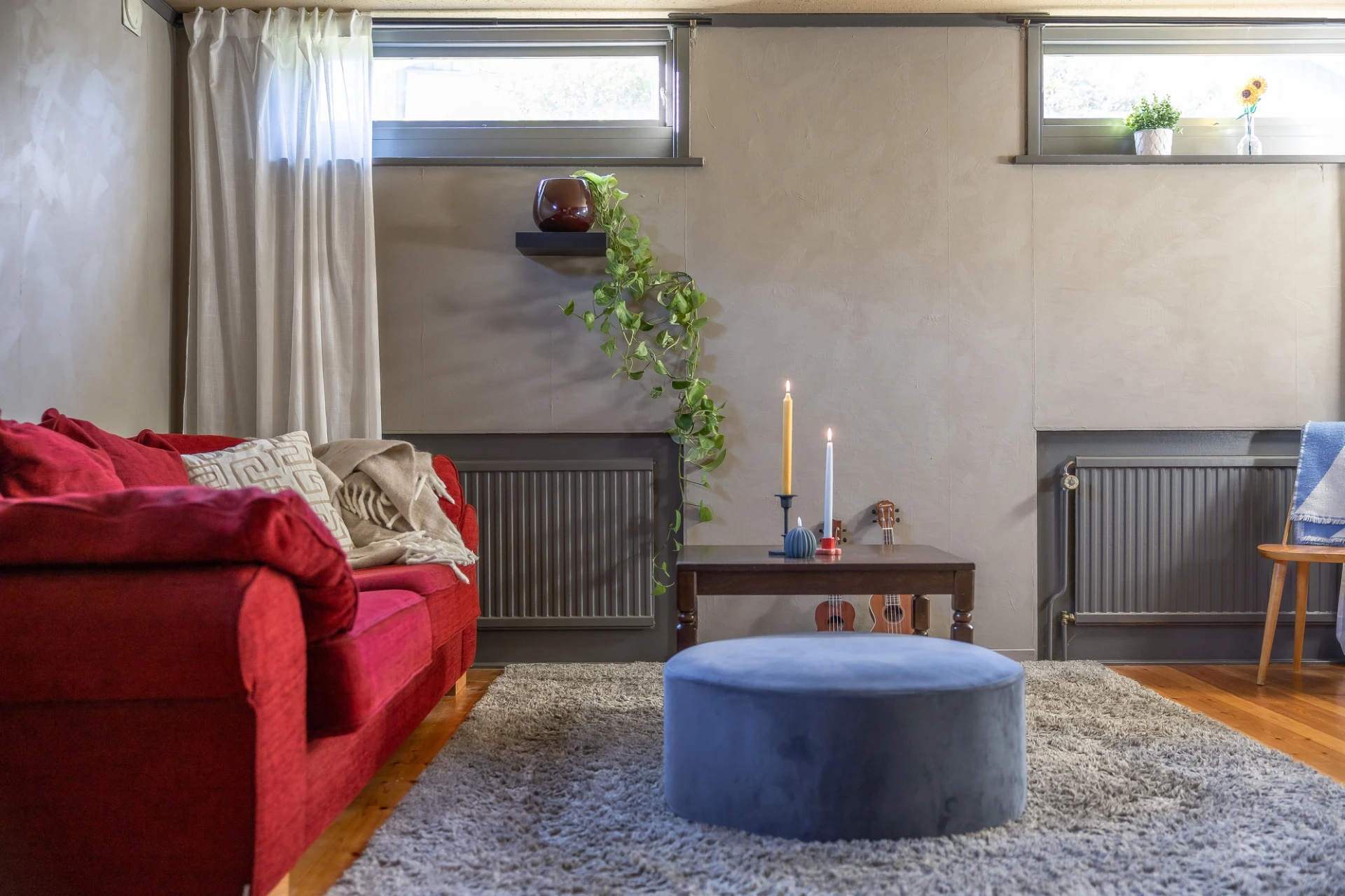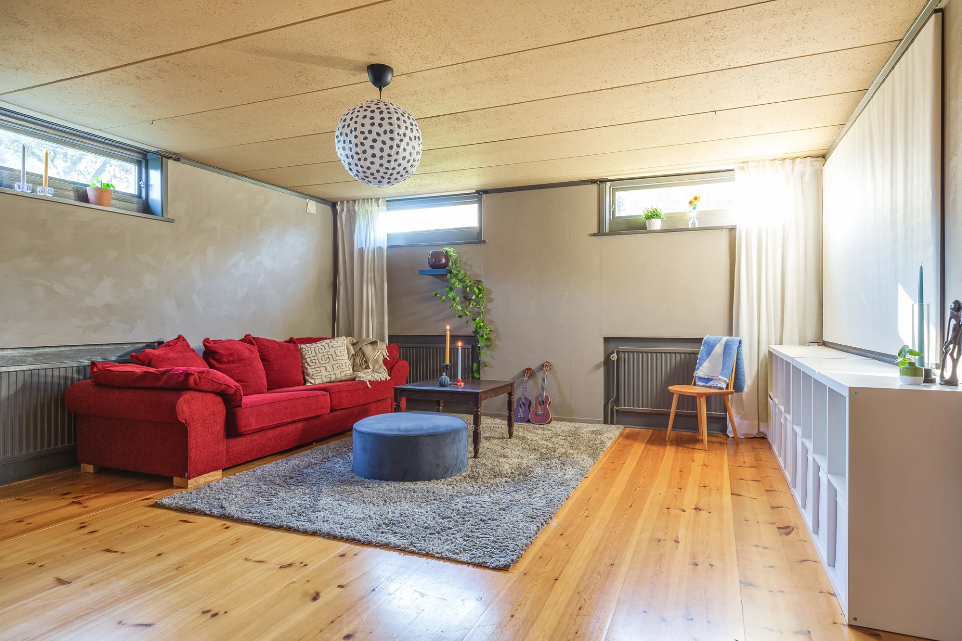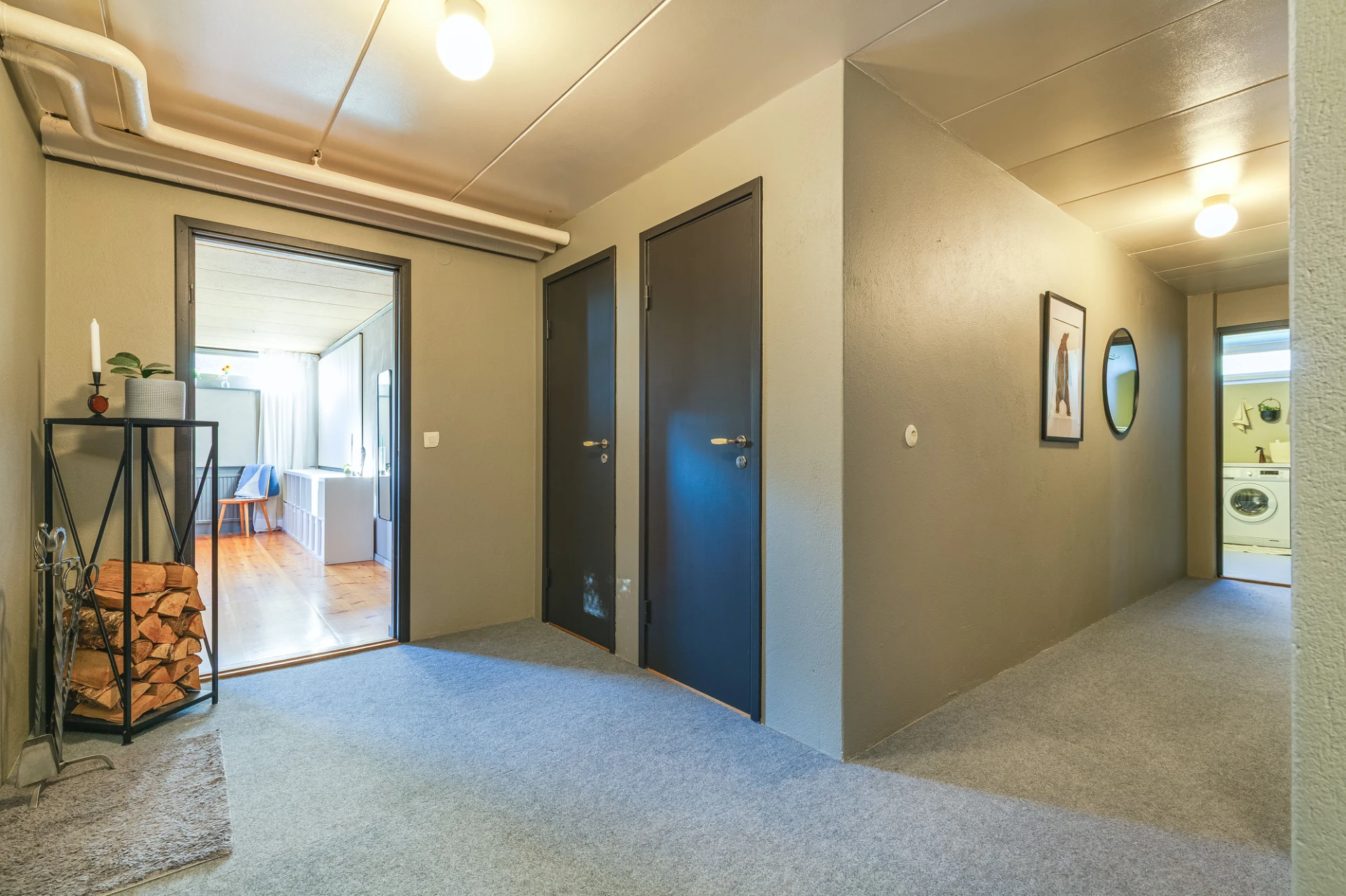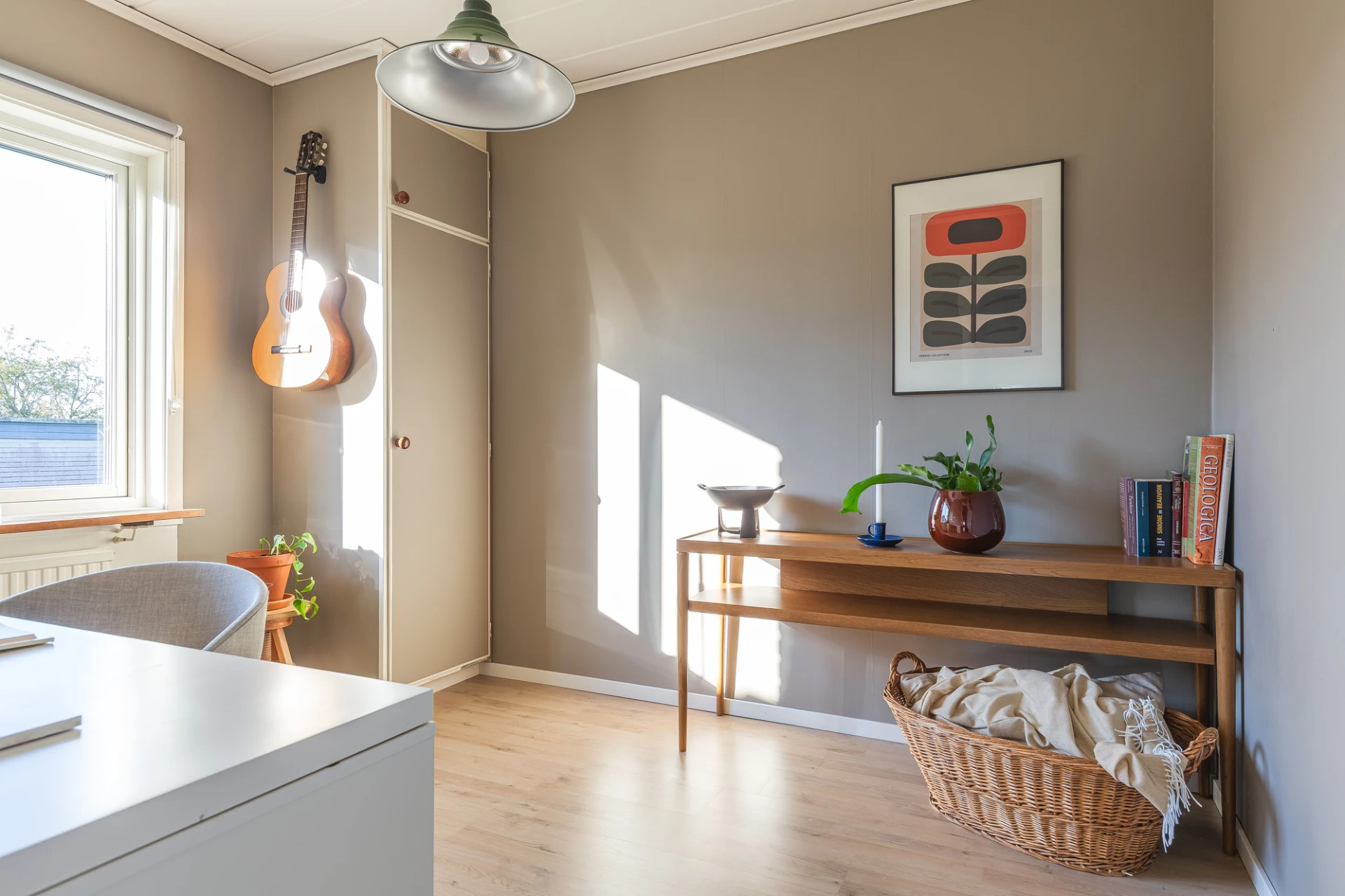 Trägolv och grå väggar. Här finns plats för soffa med tillhörande möblemang.