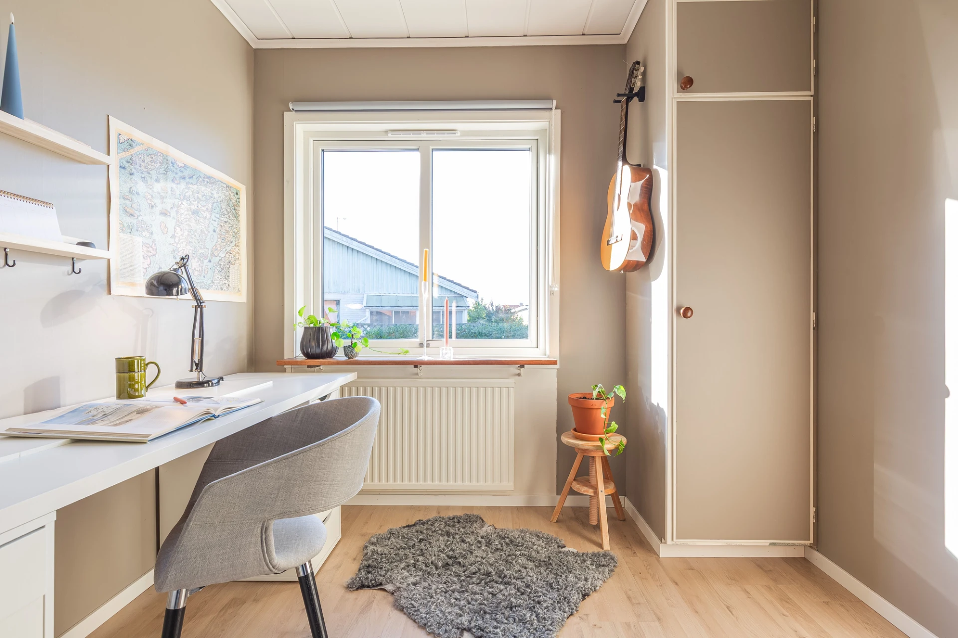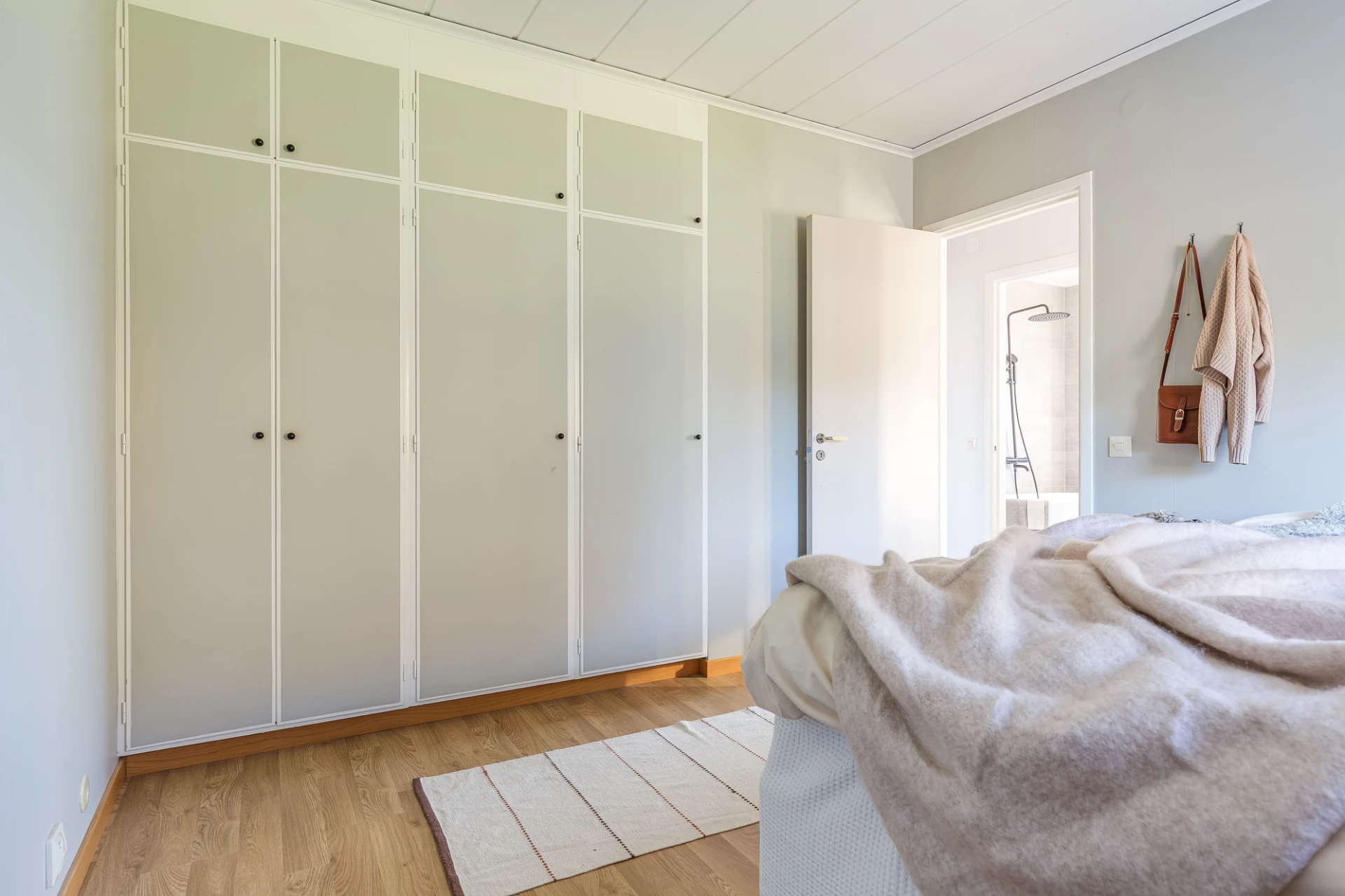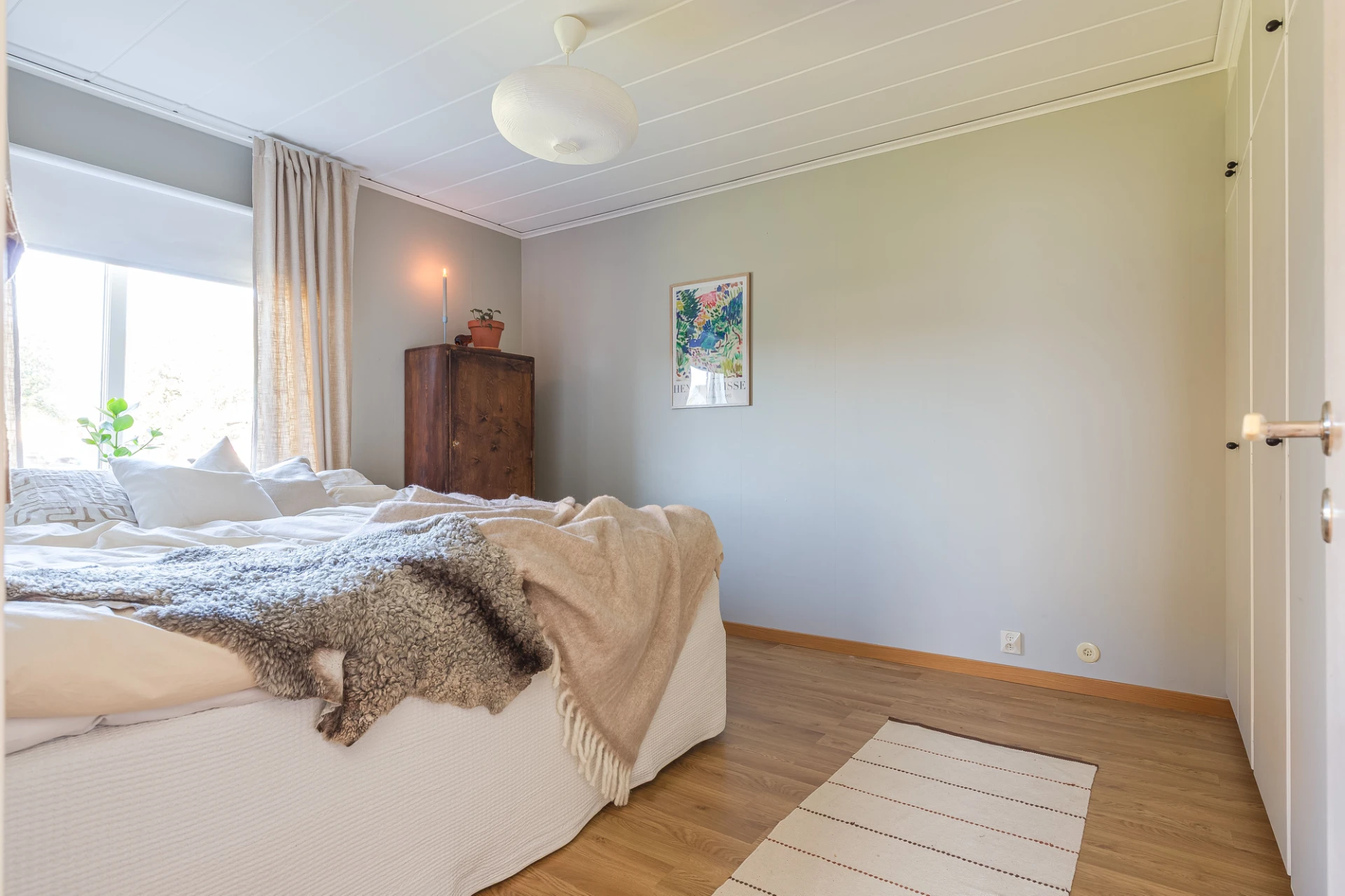 Laminatgolv och beiga väggar. Här finns plats för säng med tillhörande möblemang. Förvaring i platsbyggd garderob.