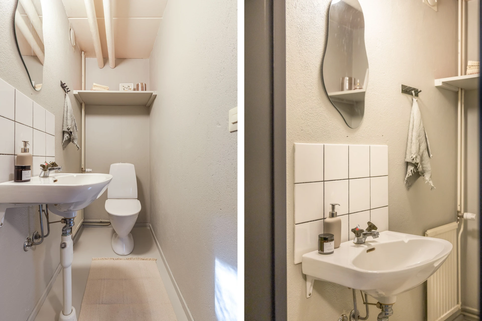 Betonggolv och ljusa väggar. Toaletten är utrustad med wc, handfat samt vägghängd spegel.