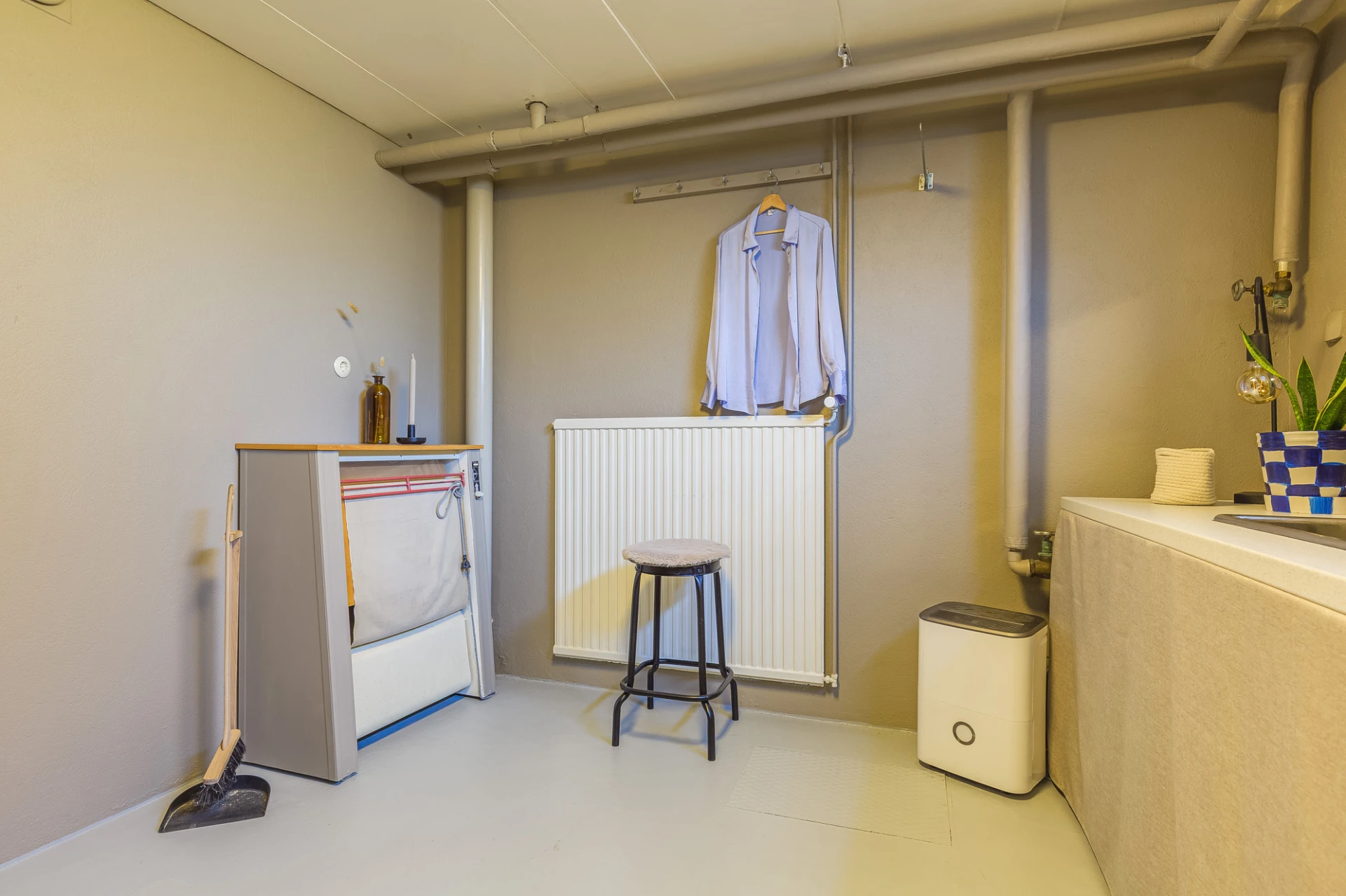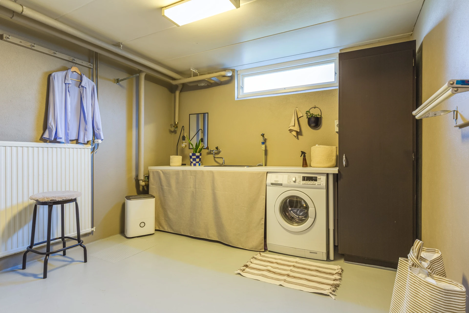 Betonggolv och beiga väggar. Tvättstugan är utrustad med tvättmaskin, förvaringsskåp, tvättho samt arbetsbänk.