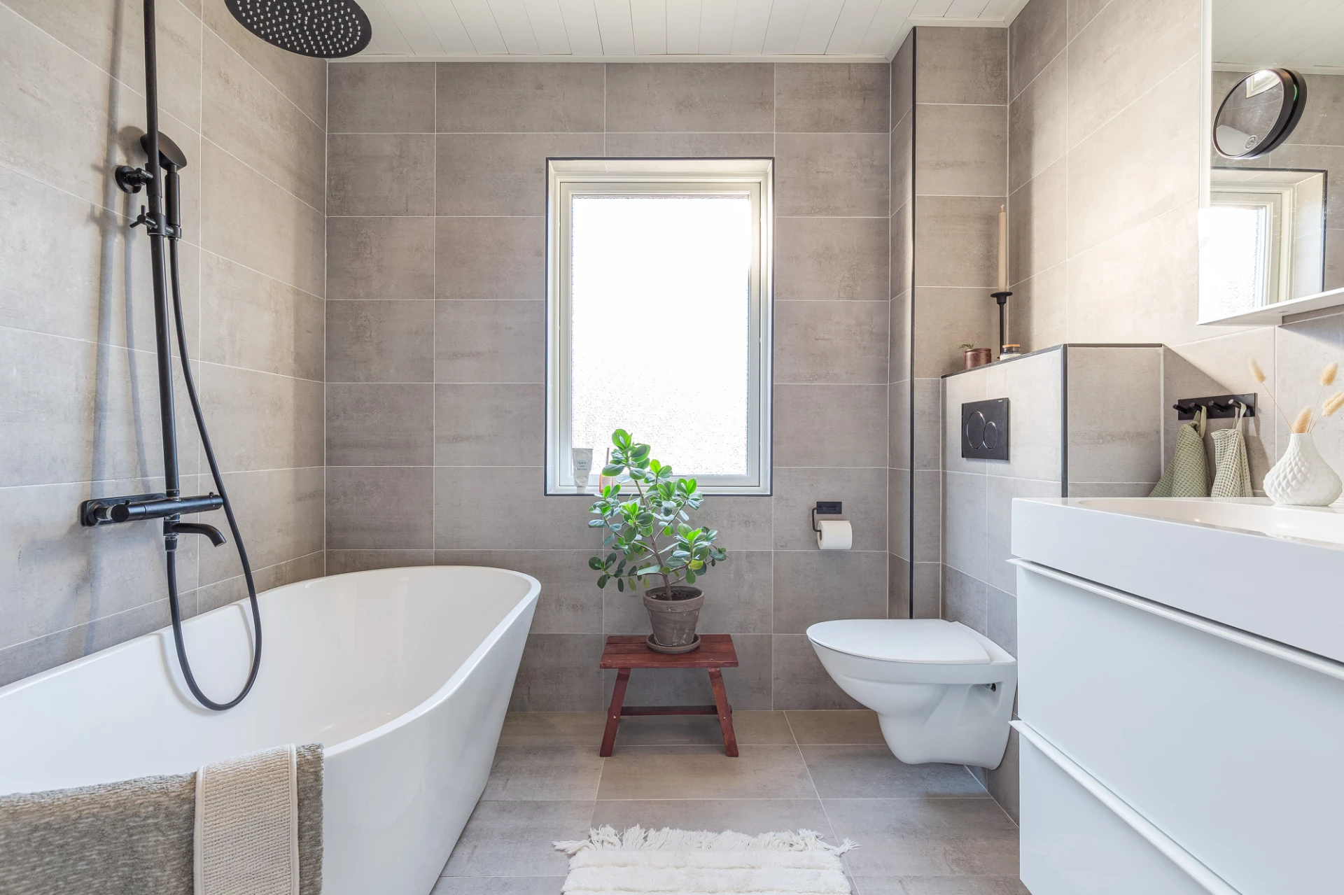 Klinkergolv med elburen golvvärme och helkaklade väggar. Badrummet är utrustat med vägghängd wc, handfat med kommod, vägghängt spegelskåp samt badkar med dusch. Renoverat 2023.