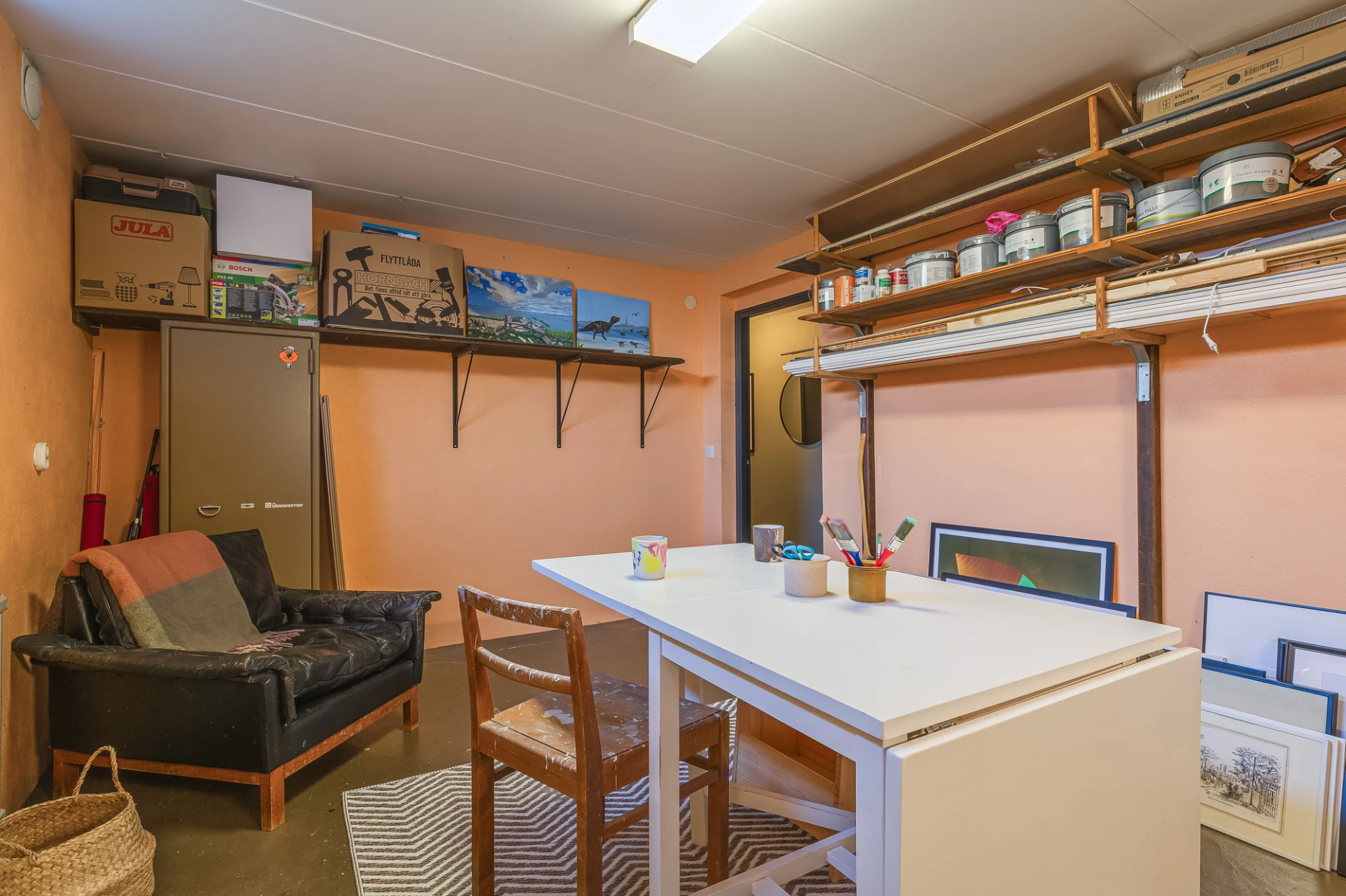 Betonggolv och aprikosa väggar.