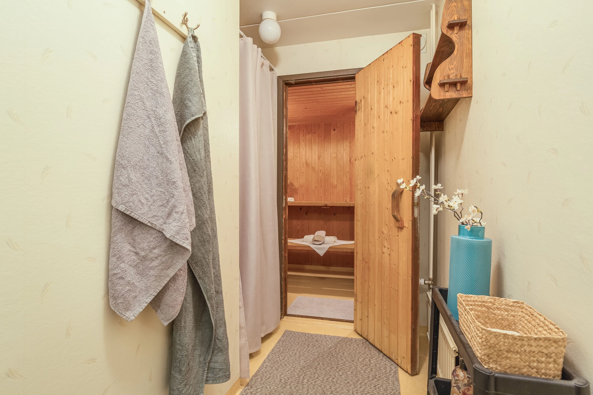 Plastmatta och våtrumstapet. Duschrummet är utrustat med dusch samt bastu.