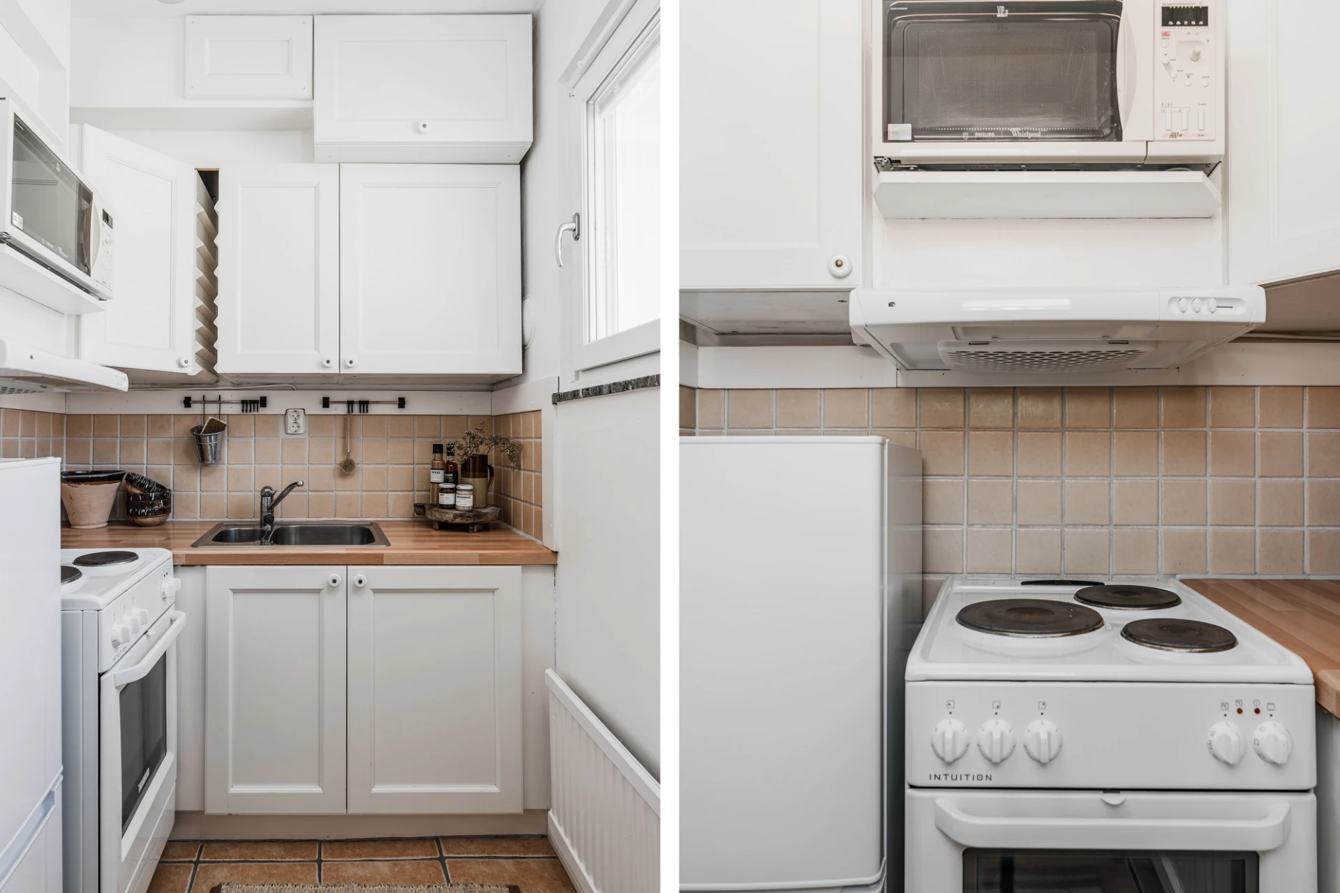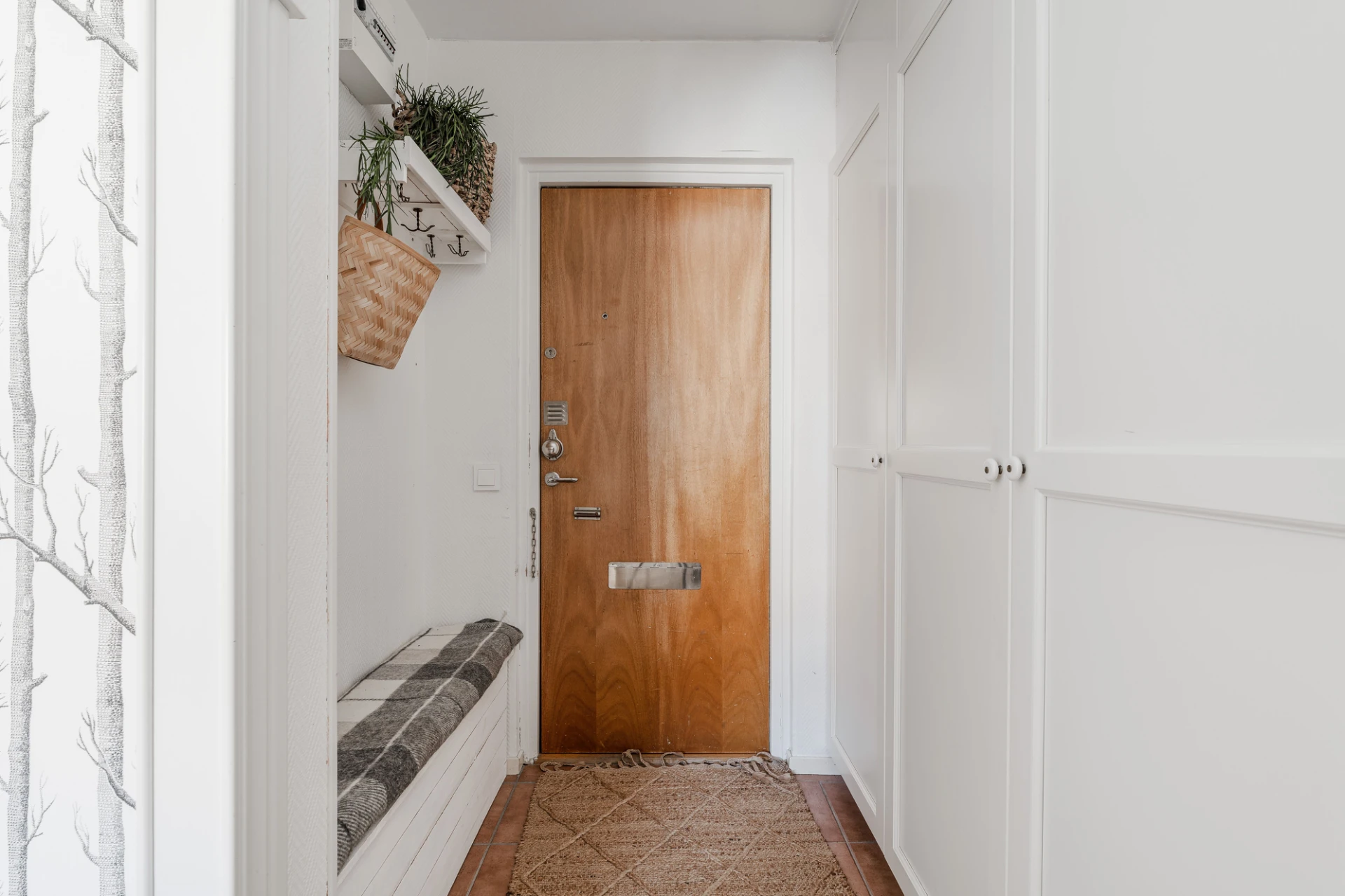 I hallen möts du av goda förvaringsmöjligheter i inbyggda garderober samt i en praktisk skolåda med sittbänk, perfekt för att enkelt hålla ordning och reda. Från hallen nås det helkaklade badrummet som är utrustat med WC, handfat, vägghängt spegelskåp samt duschväggar som är nya sedan 2022. Badrummet är även förberett för egen tvättmaskin. Köket är praktiskt utrustat med klinkergolv samt kakel ovan bänkskiva och är utrustat med kyl, frys, spis med ugn, spisfläkt och mikro. Kyl och frys är nya sedan 2024.