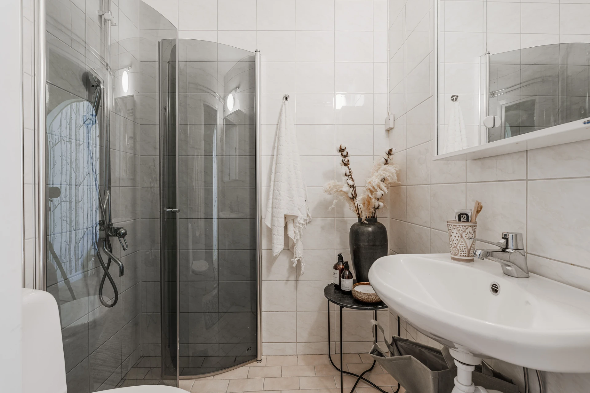 Klinkergolv och helkaklade väggar. Duschrummet är utrustat med wc, handfat, vägghängt spegelskåp samt dusch. Klart för egen tvättmaskin.