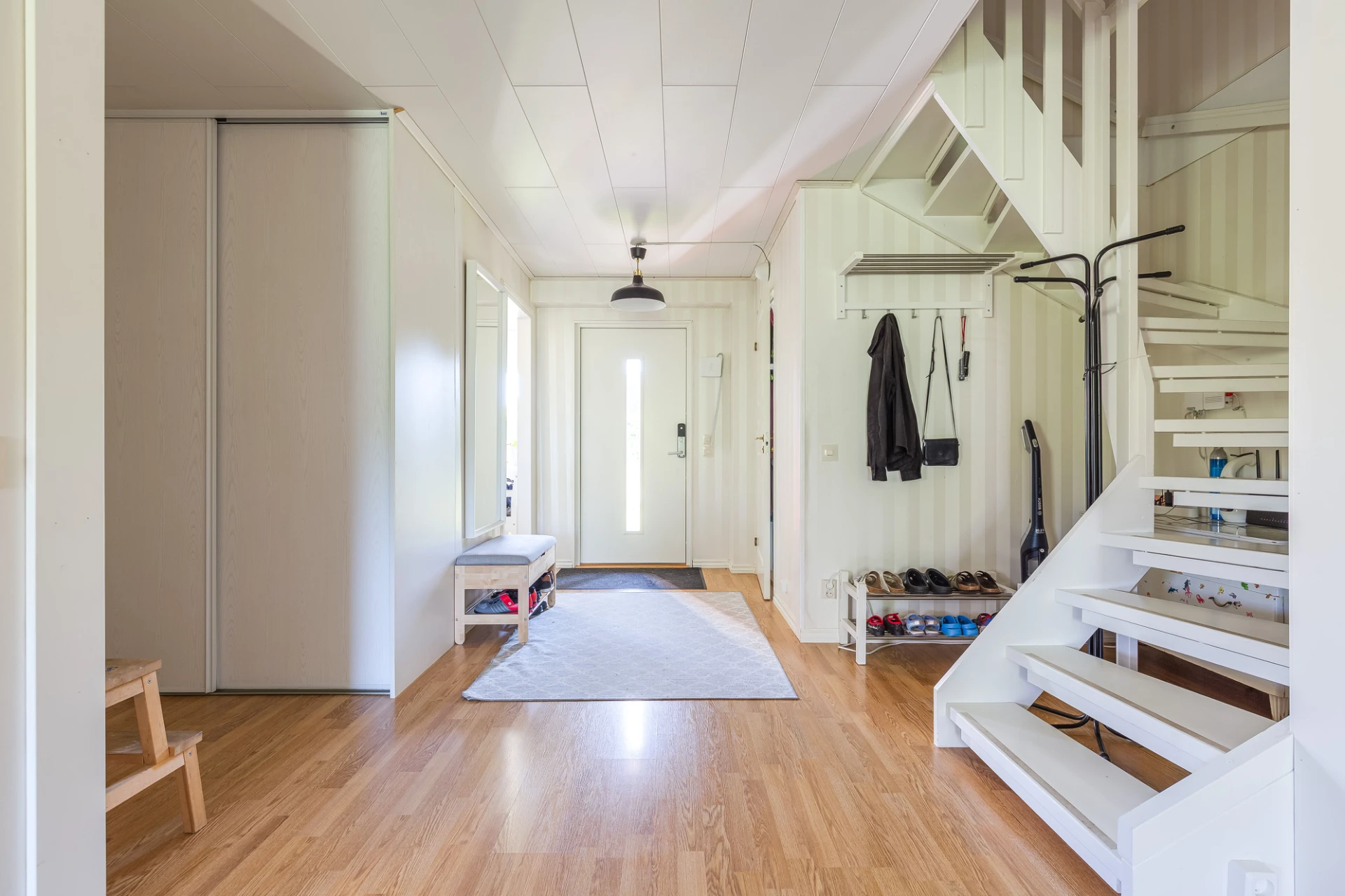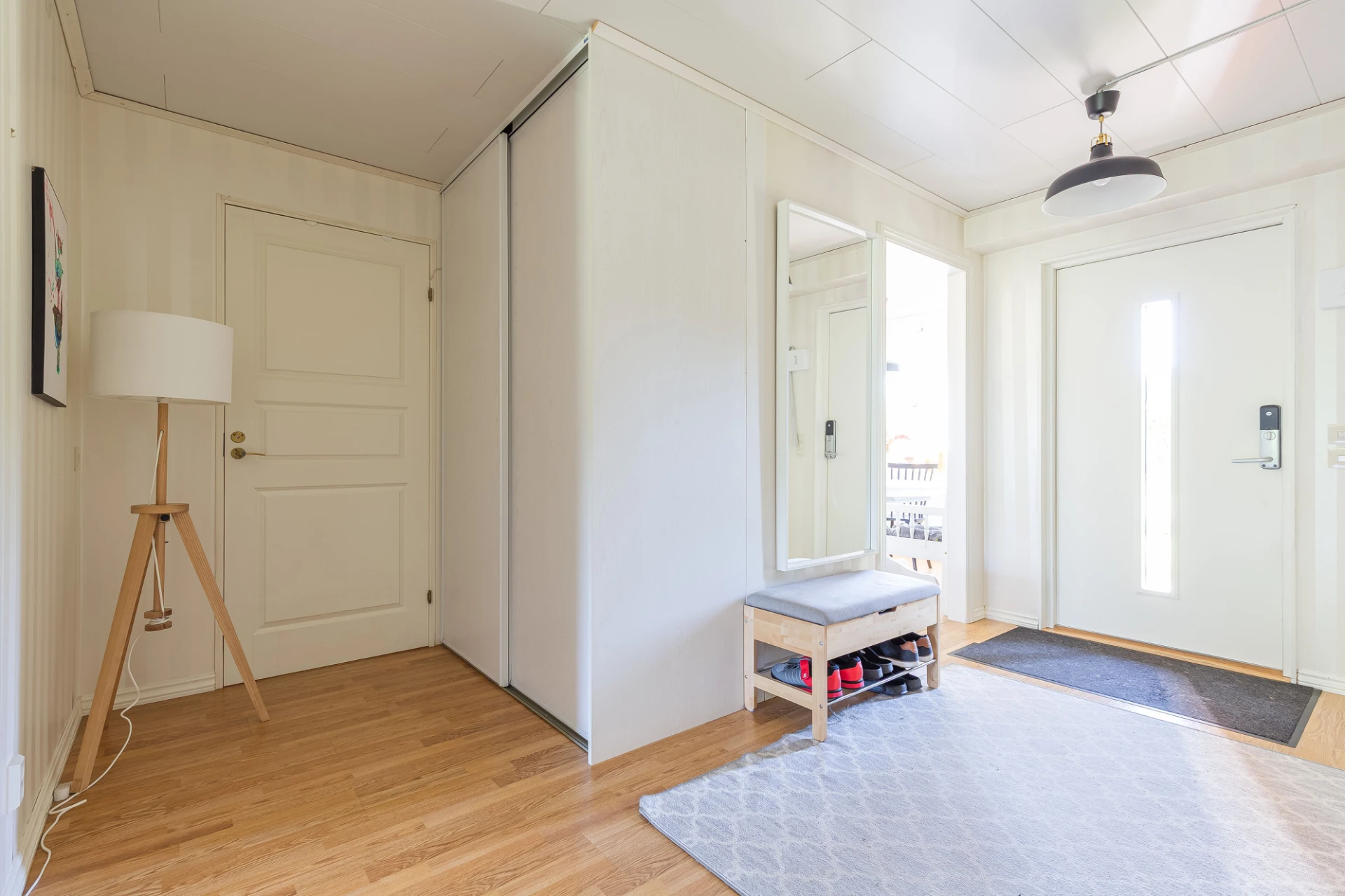 Laminatgolv och ljusa väggar. Här finns plats för avhängning samt förvaring i garderob med skjutdörrar.