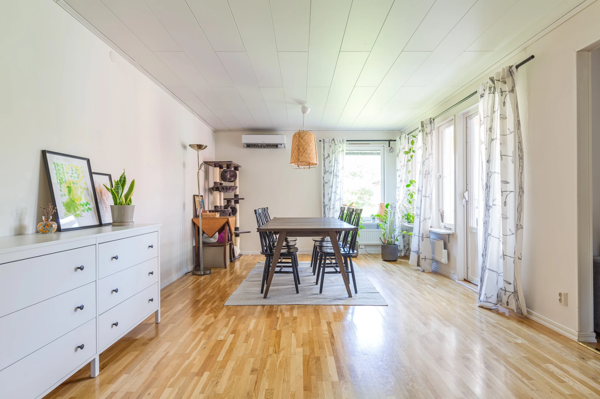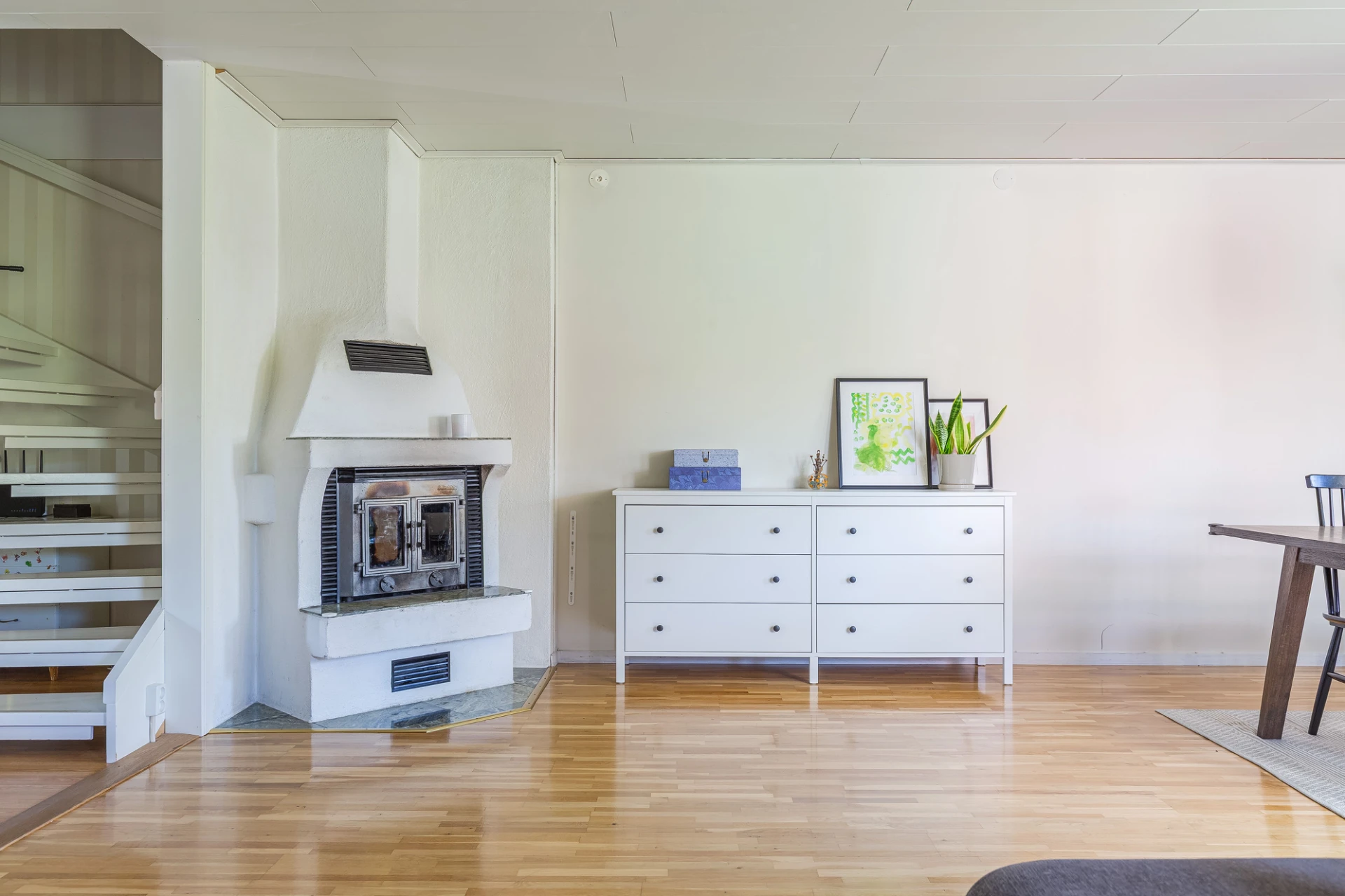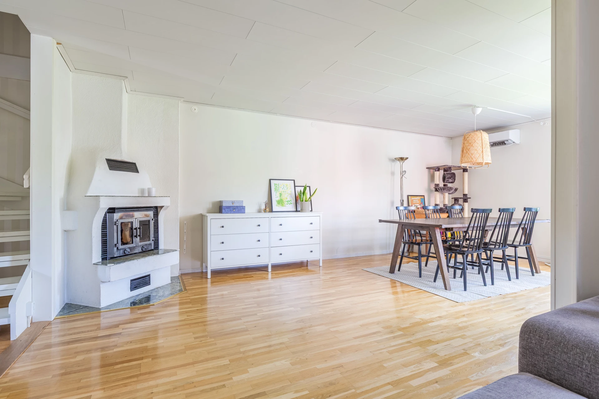 Laminatgolv och ljusa väggar. Här finns plats för större matbord vid braskaminen. Från matrummet nås bostaden inglasade altan.