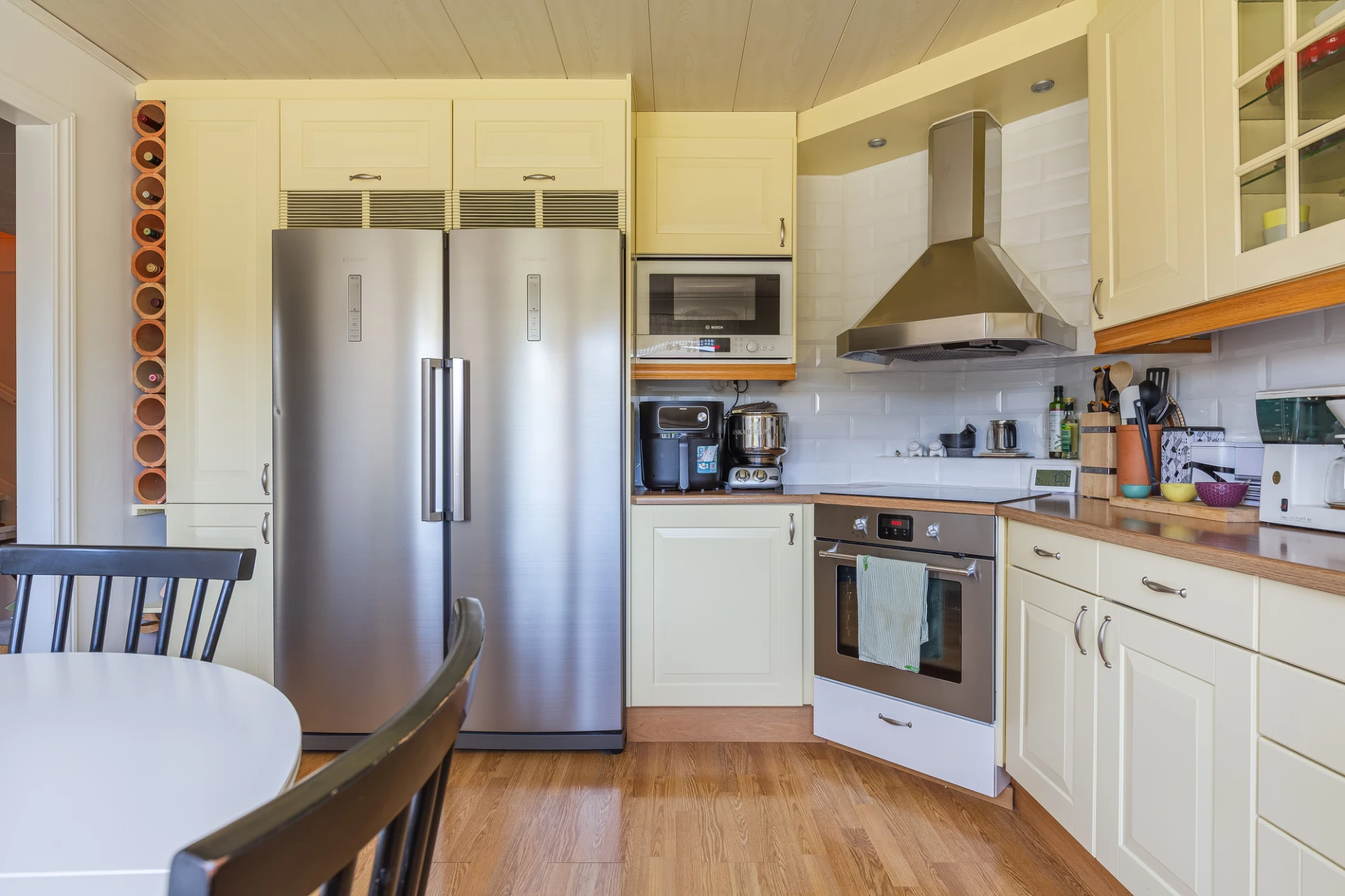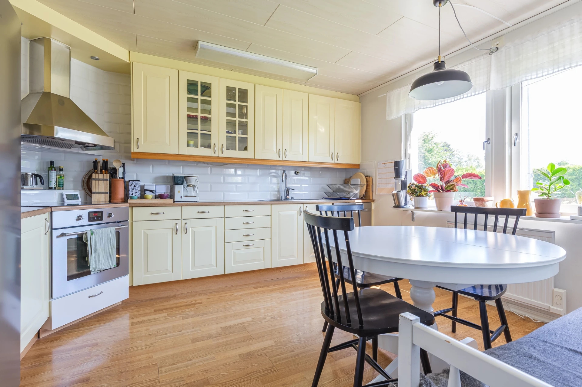 Laminatgolv och ljusa väggar. Den maskinella utrustningen består av spishäll, spisfläkt, inbyggd ugn, inbyggd diskmaskin, inbyggd mikro samt kyl och frys. Matplats.