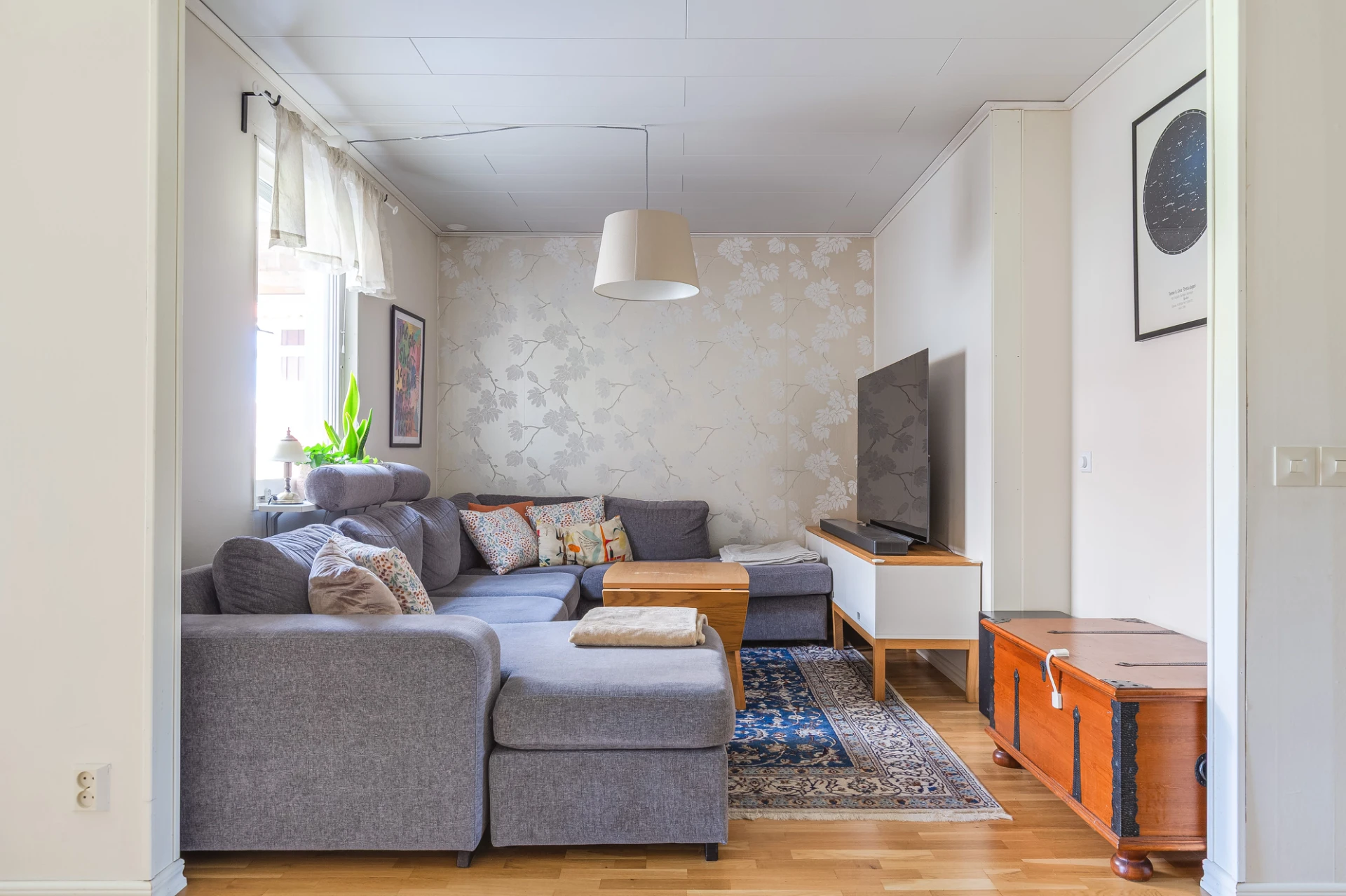 Laminatgolv och ljusa väggar med mönstrad fondvägg. Här finns plats för soffa med tillhörande möblemang.
