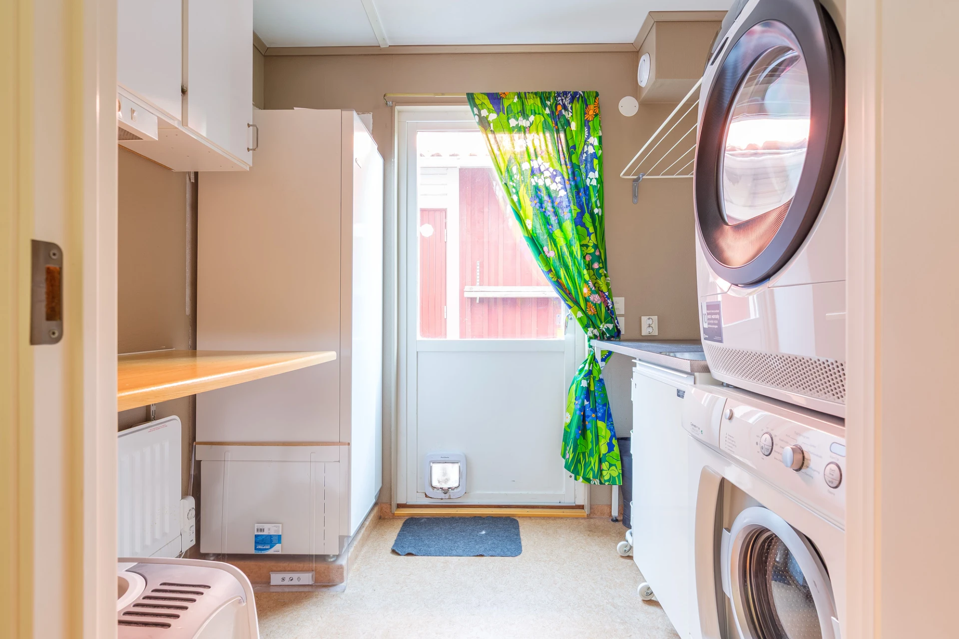 Plastmatta och beiga väggar. Tvättstugan är utrustad med tvättmaskin, torktumlare, vägghängd förvaring, arbetsbänk samt tvättho.