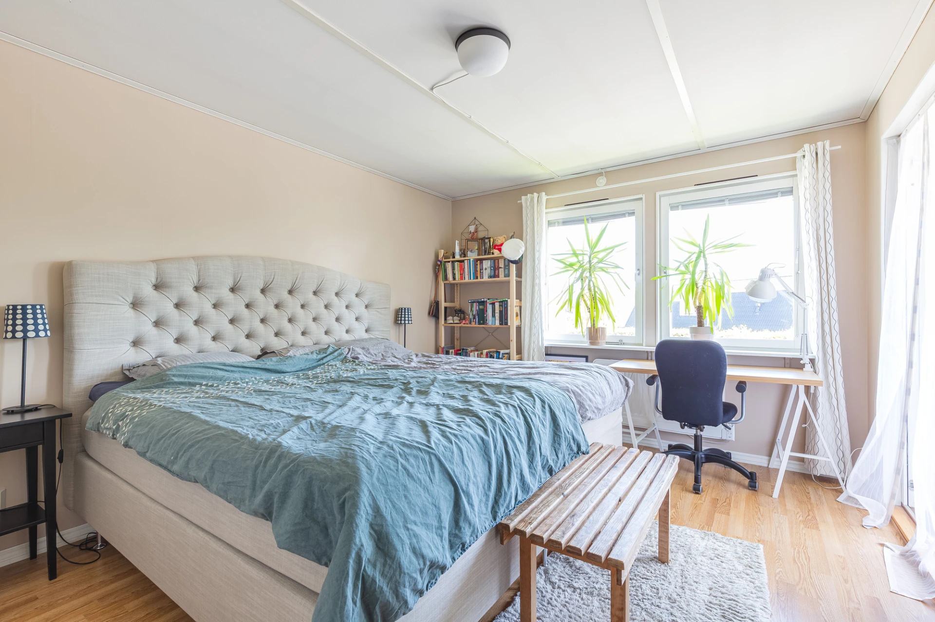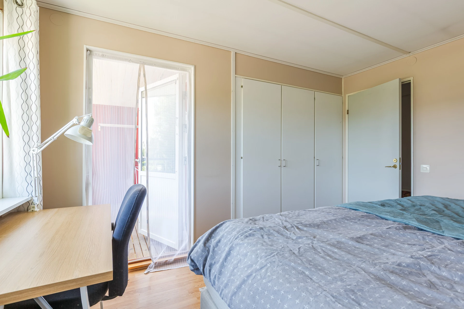 Laminatgolv och ljusa väggar. Här finns plats för säng med tillhörande möblemang samt skrivbordshörna. Förvaring i inbyggda garderober. Från sovrummet nås bostaden balkong.