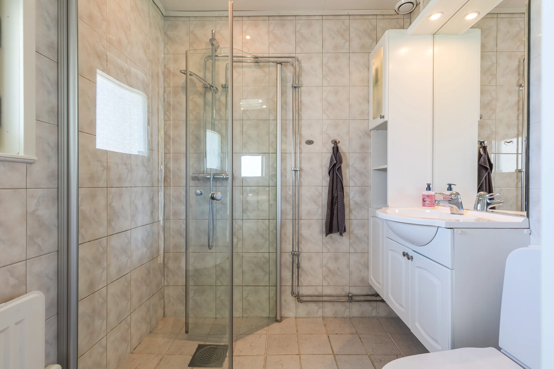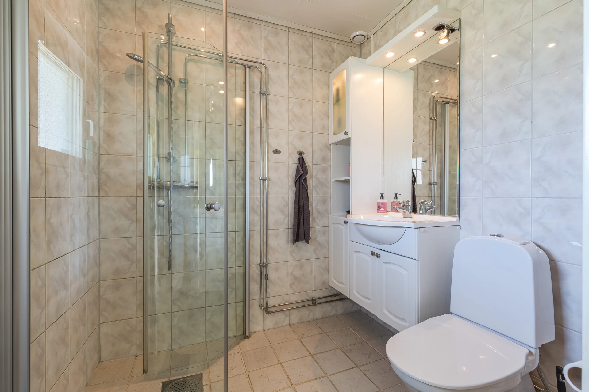 Klinkergolv med elburen golvvärme och helkalkade väggar. Duschrummet är utrustat med wc, handfat med kommod, vägghängd spegel samt dusch med vikbara glasdörrar.