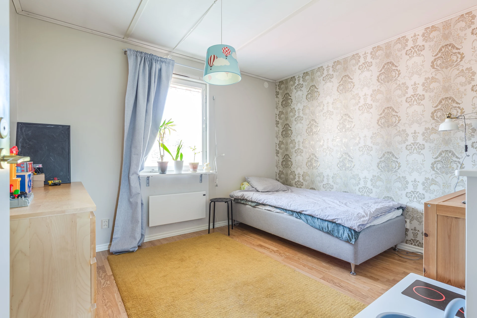Laminatgolv med ljusa väggar och mönstrad fondvägg. Här finns plats för säng med tillhörande möblemang samt skrivbordshörna.