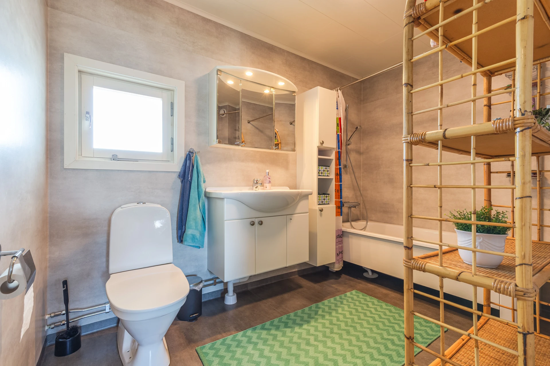Plastmatta och våtrumstapet. Badrummet är utrustat med wc, handfat med kommod, vägghängt spegelskåp med belysning samt badkar med dusch.