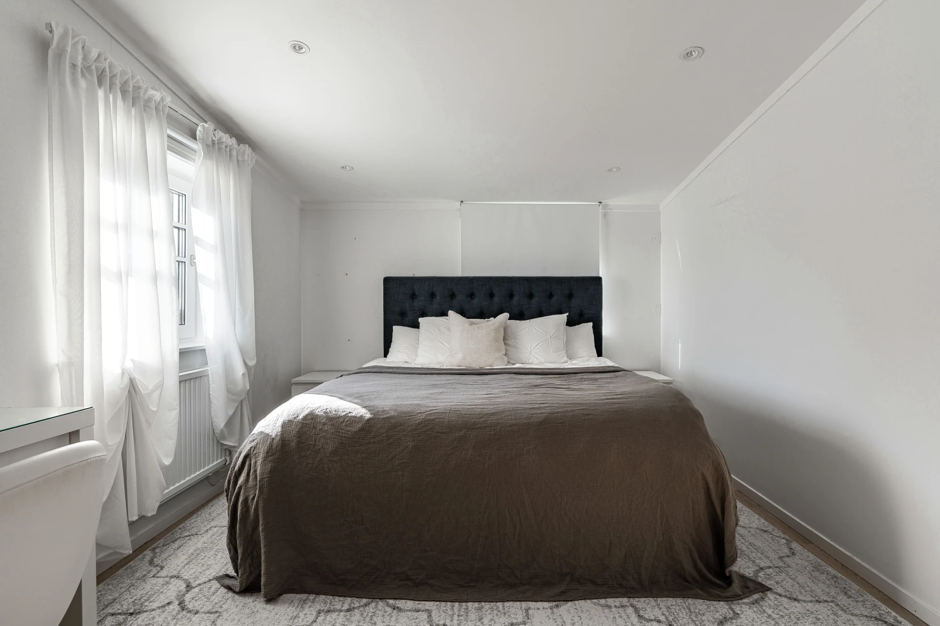Heltäckningsmatta och ljusa väggar. Här finns plats för säng med tillhörande möblemang sam skrivbordshörna.