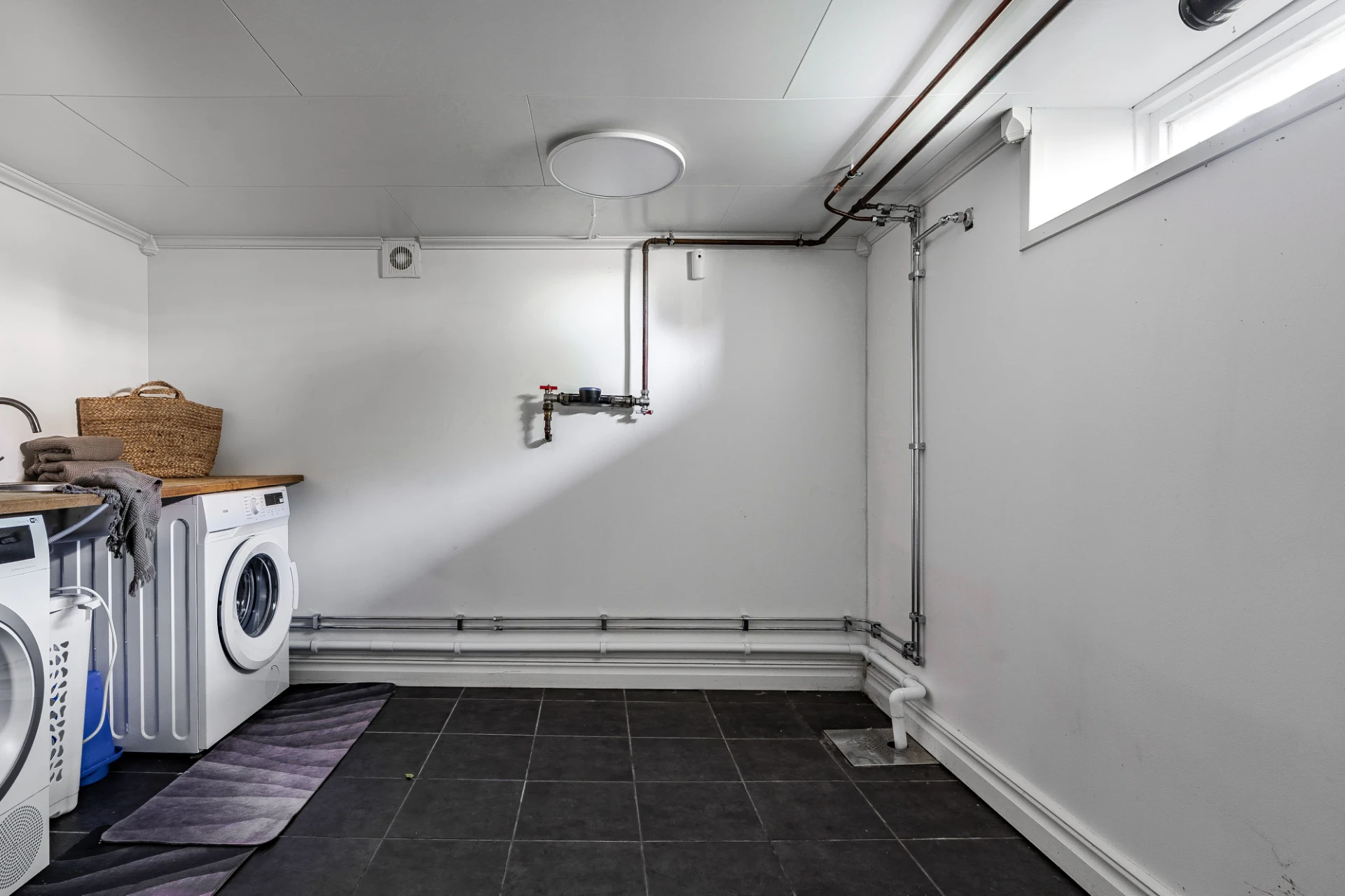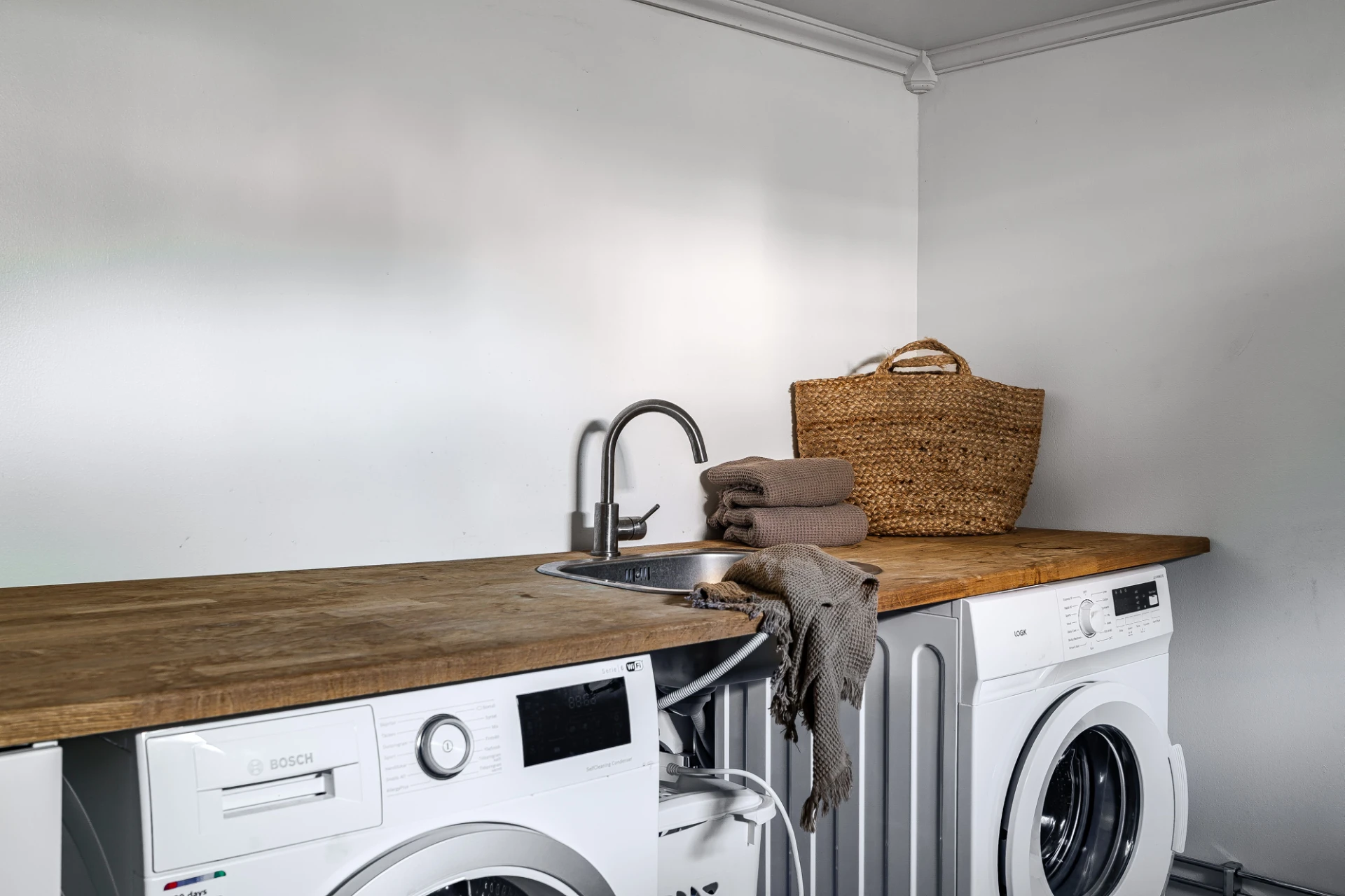 Klinkergolv och ljusa väggar. Tvättstugan är utrustad med tvättmaskin, torktumlare samt arbetsbänk.